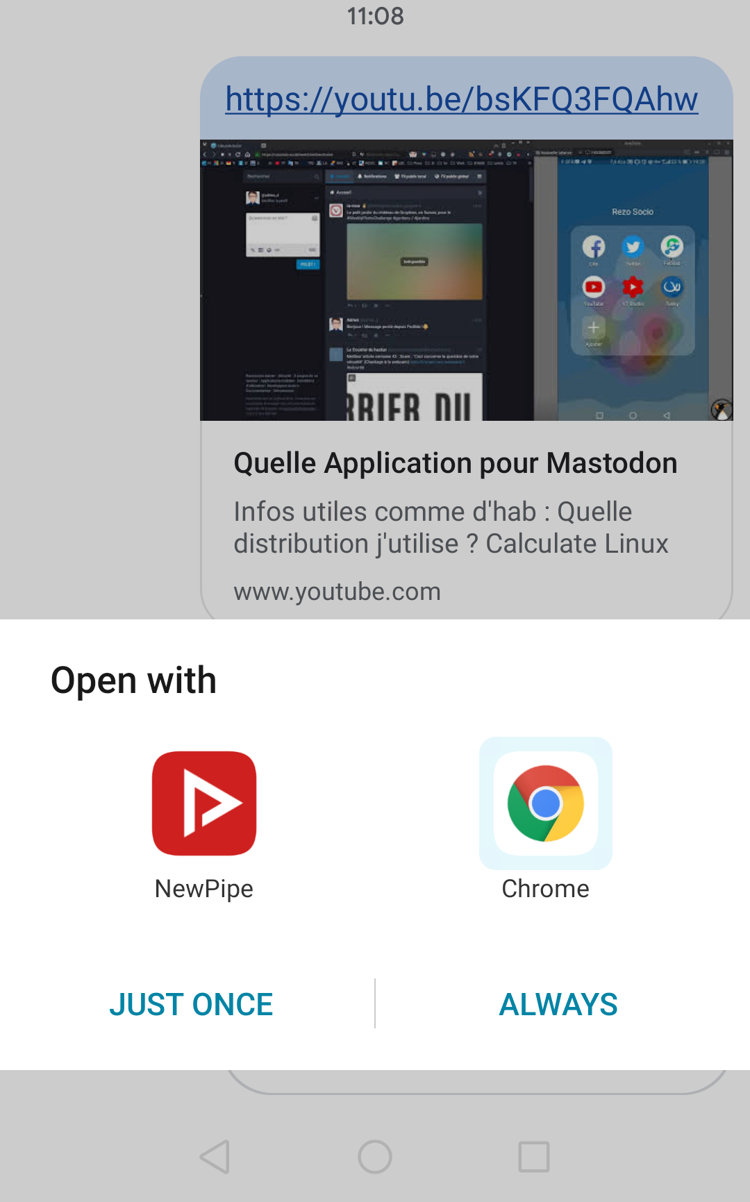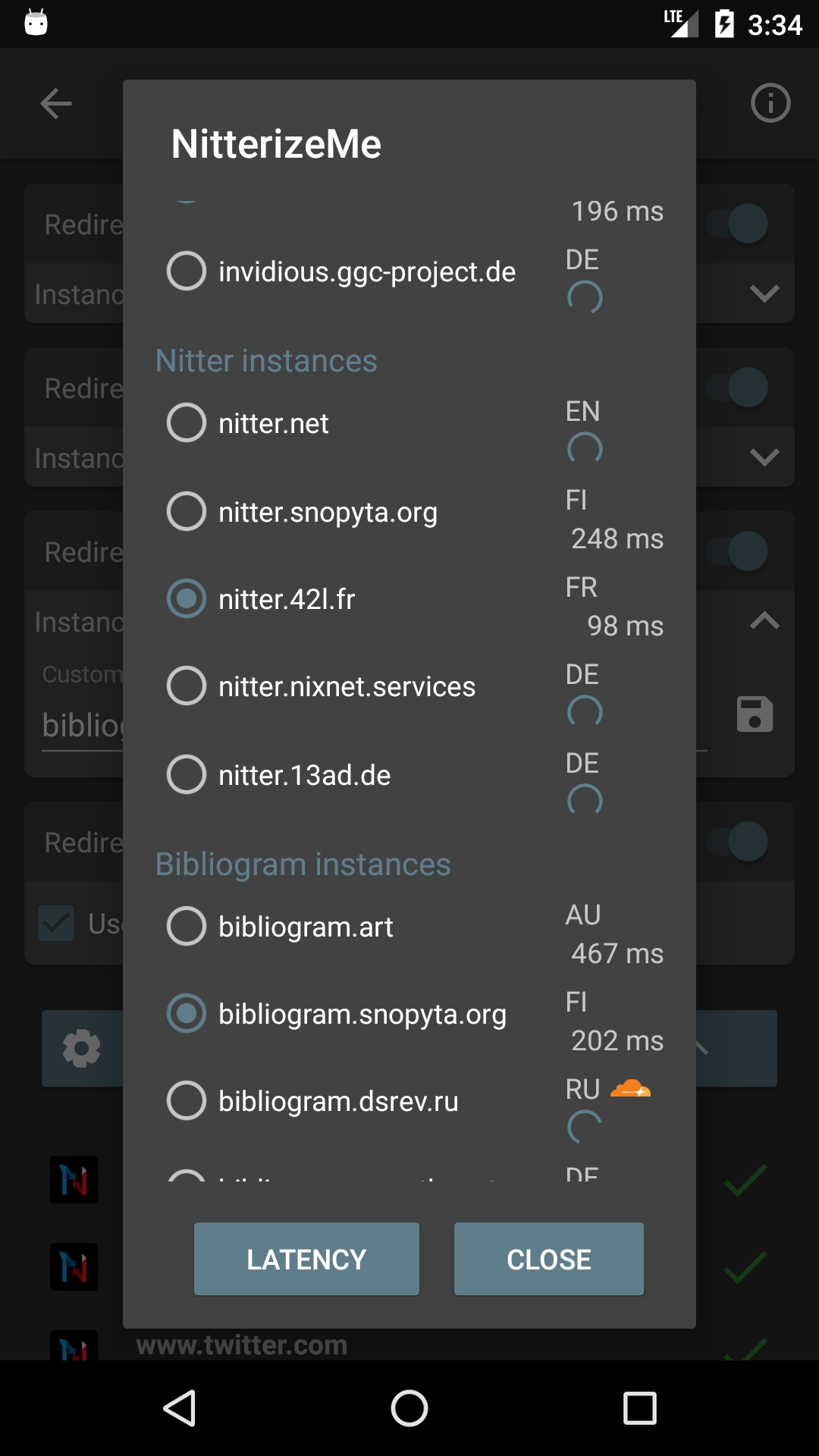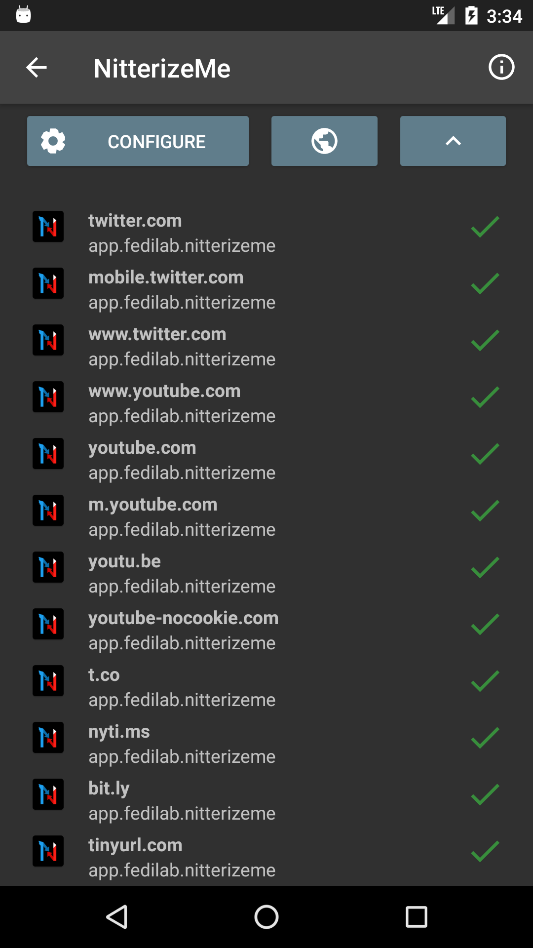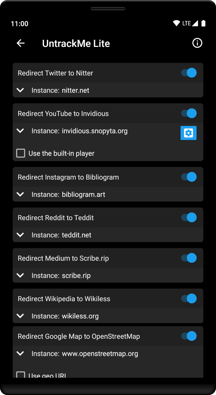 icon UntrackMe once set by default to open Twitter, YouTube and Instagram links will transform them into Nitter, Invidious and Bibliogram links and delegate the action to another app.