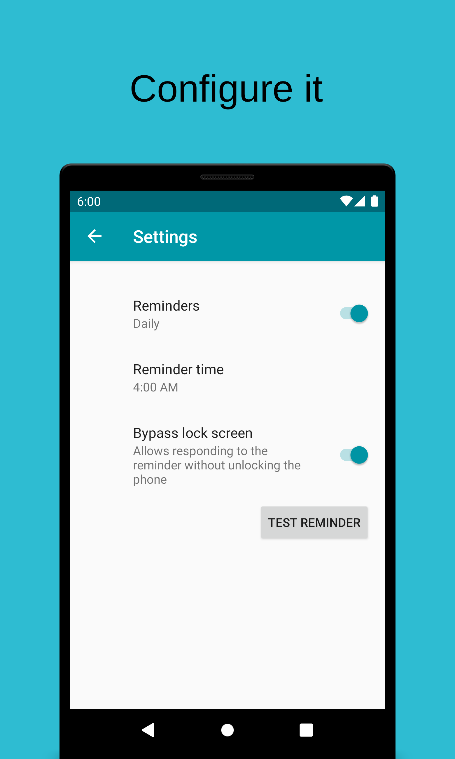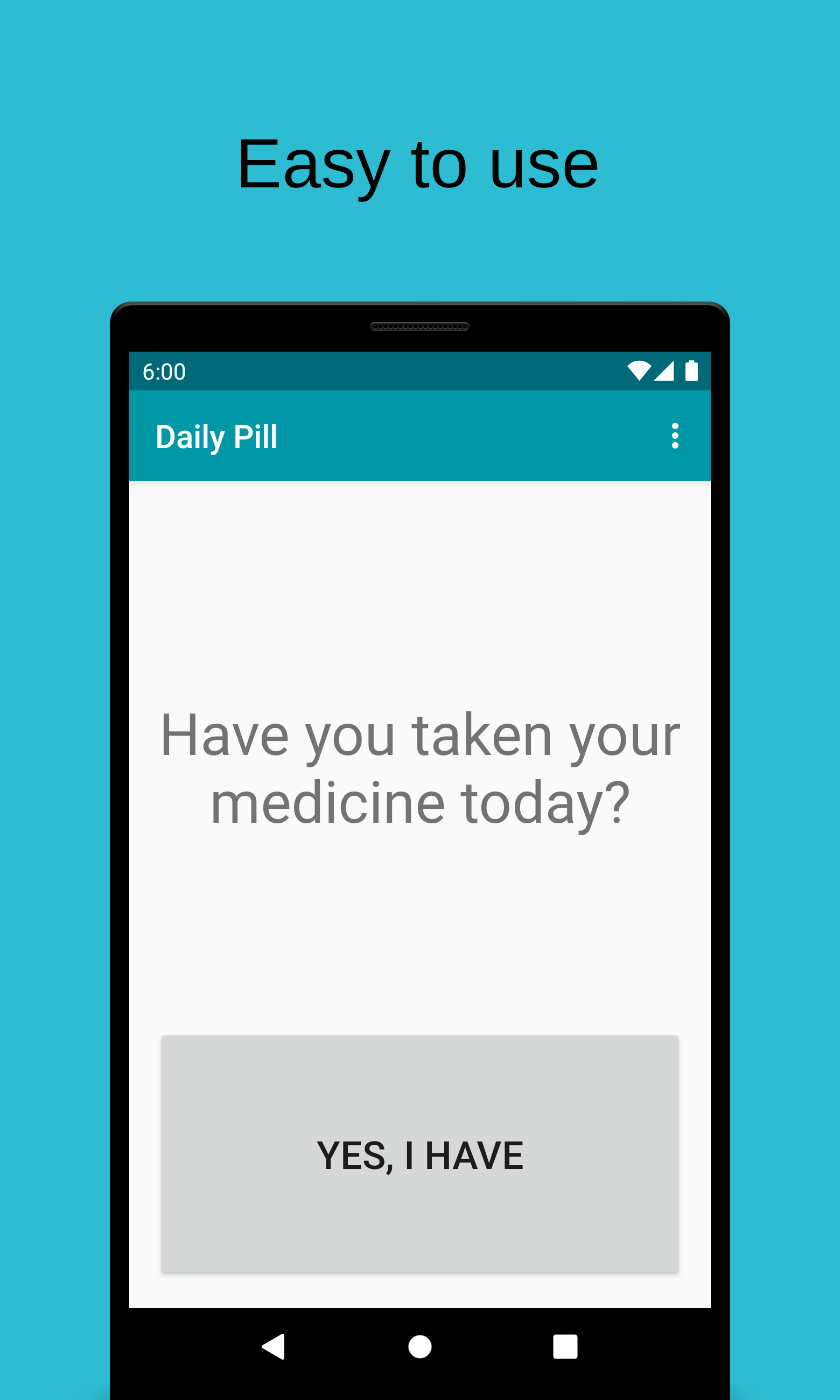 Ideal if you need to take your medicine every morning. Daily Pill shows a reminder on your lock screen which is visible in the first time you pick up the phone in the morning. Respond with the press of a single button, without unlocking.