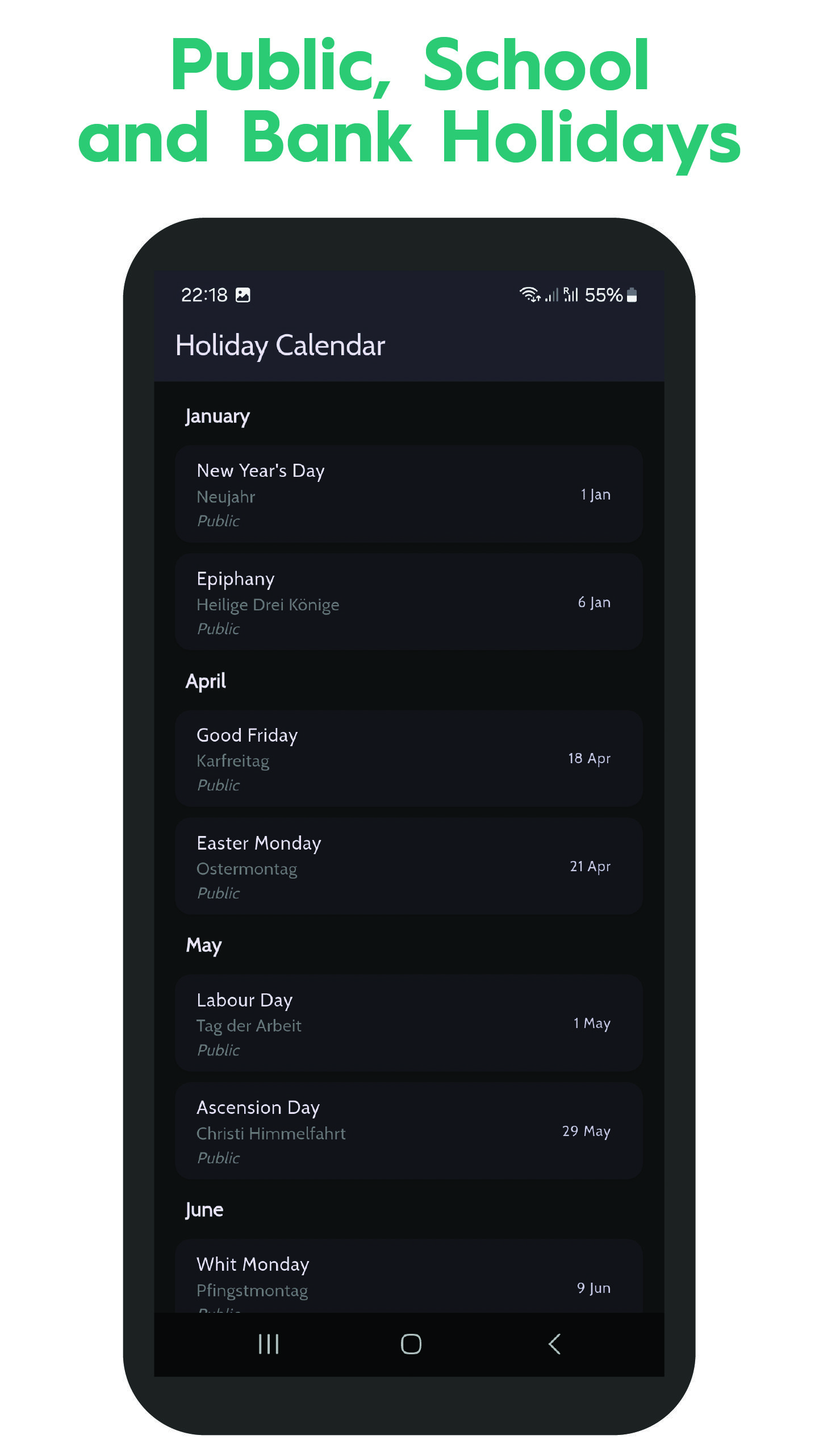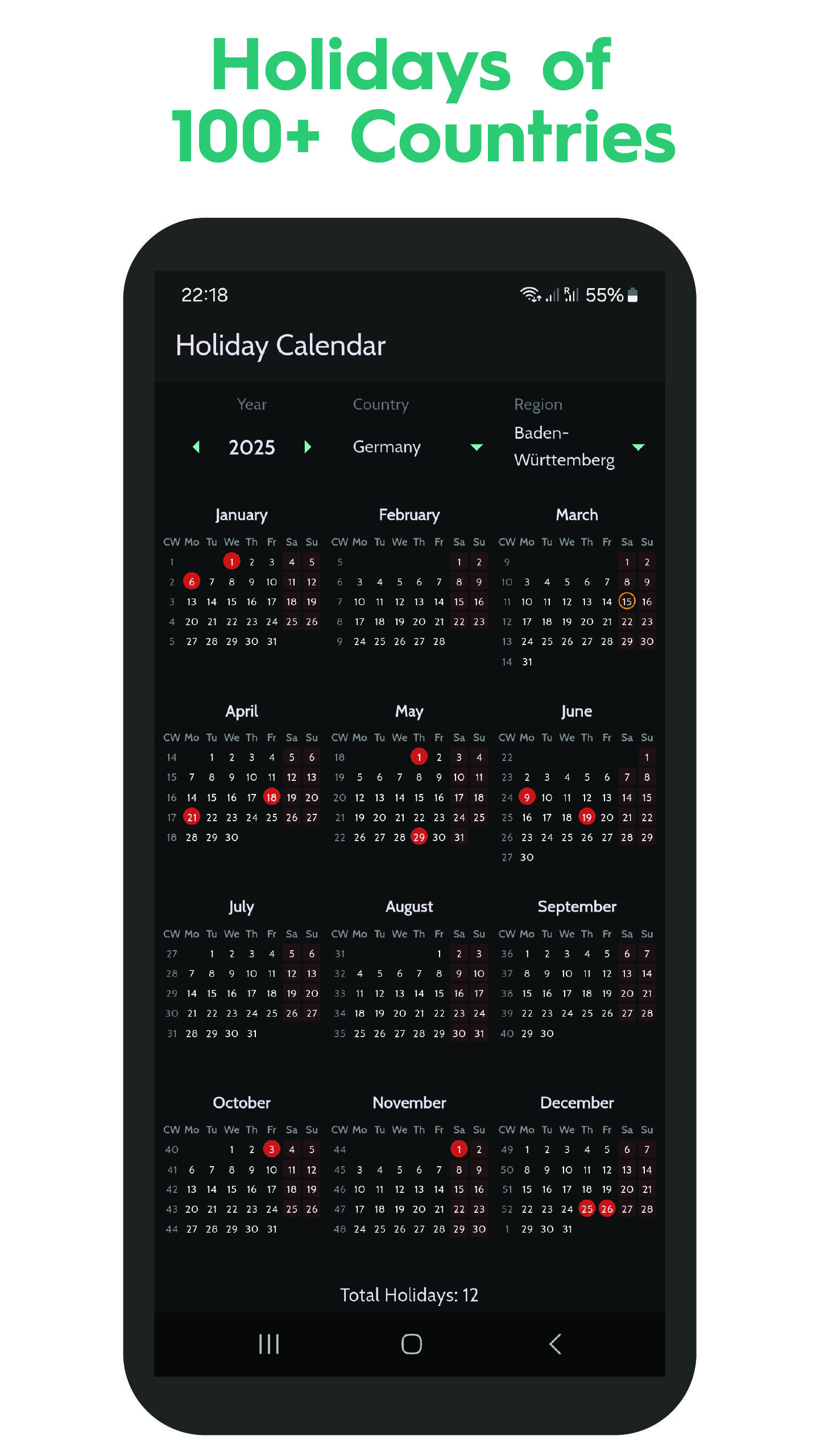 🌍 Public Holidays Calendar provides a complete overview of national and regional holidays for 100+ countries, all in an easy-to-use calendar format.
