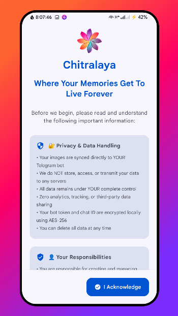 Chitralaya CloudGallery (चित्रालय - "House of Images" in Sanskrit) is your personal photo fortress that transforms Telegram into unlimited, truly private cloud storage! Say goodbye to the anxiety of losing precious memories and hello to unlimited backup freedom.