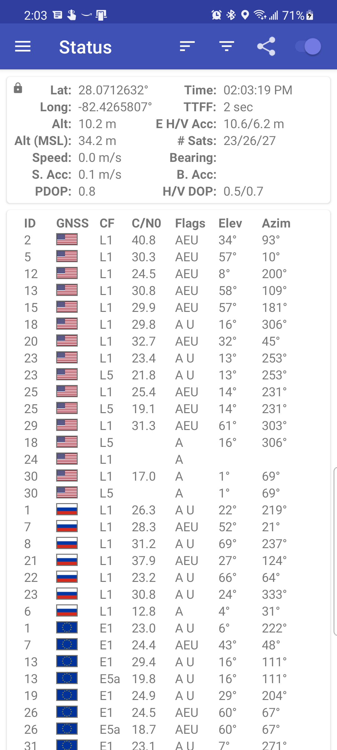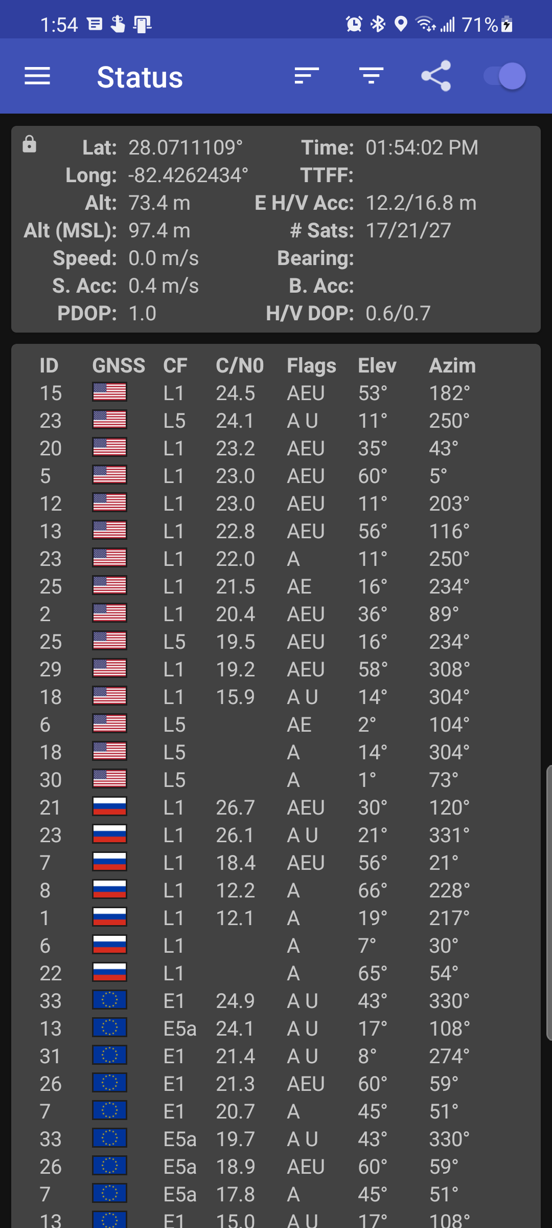 GPSTest displays real-time information for satellites in view of your device. A