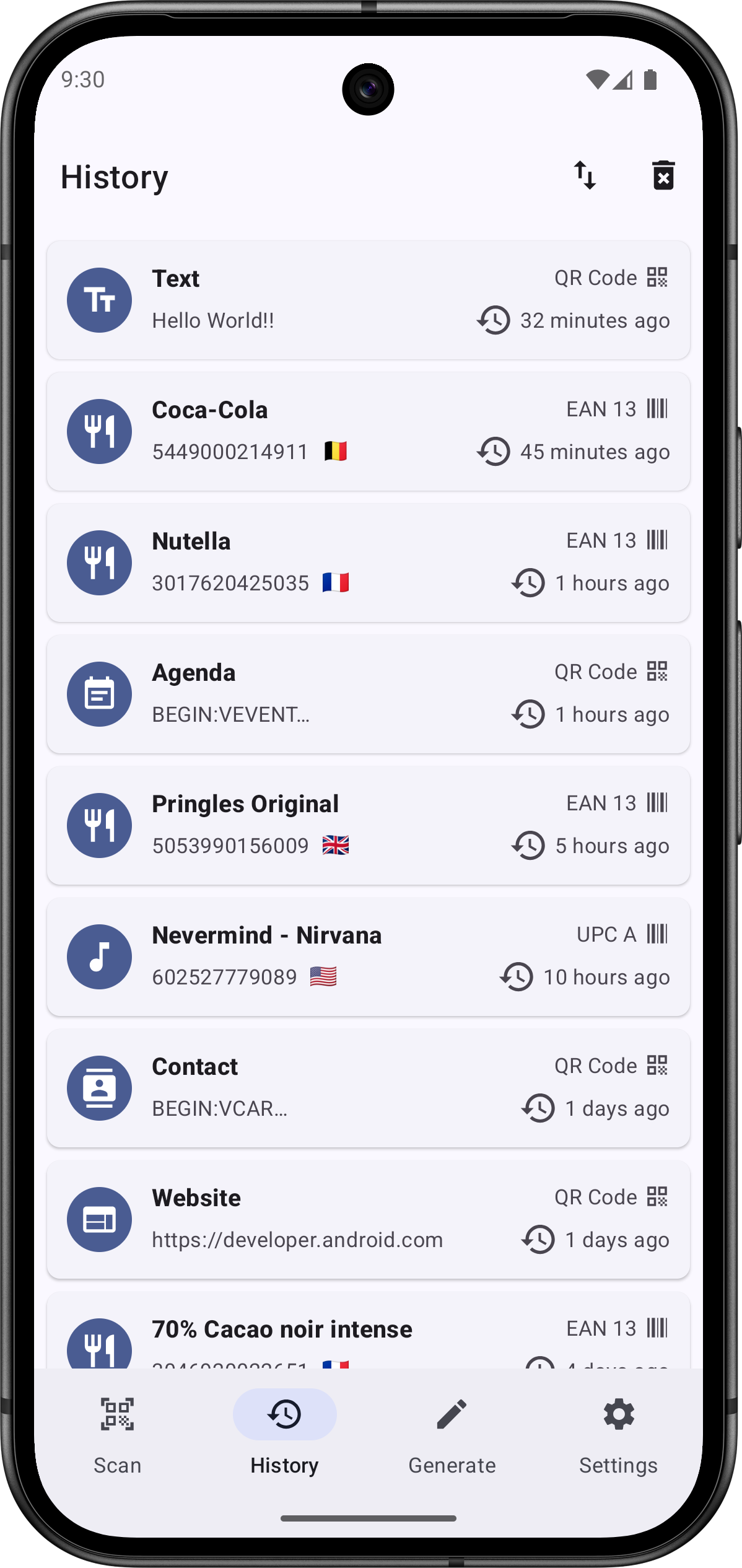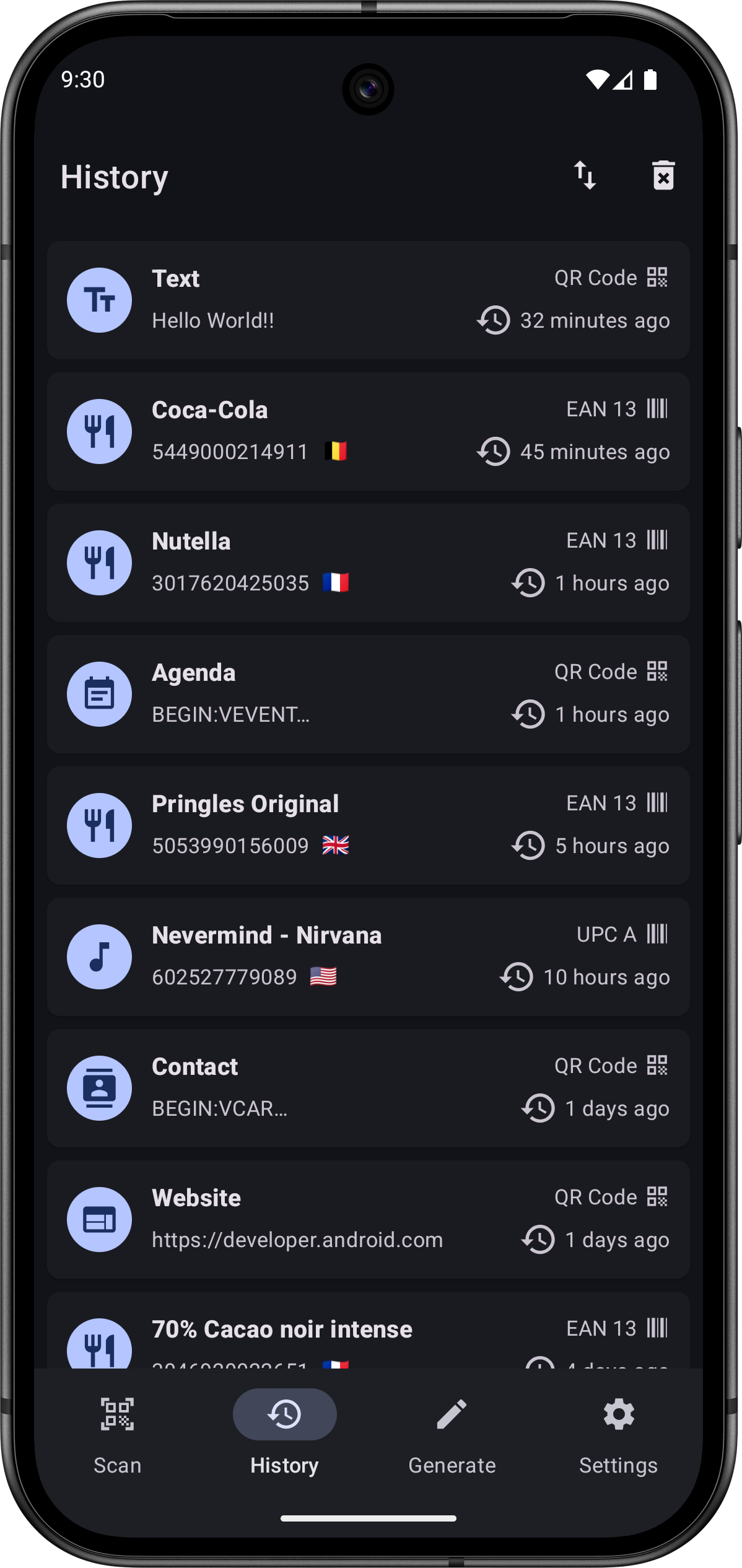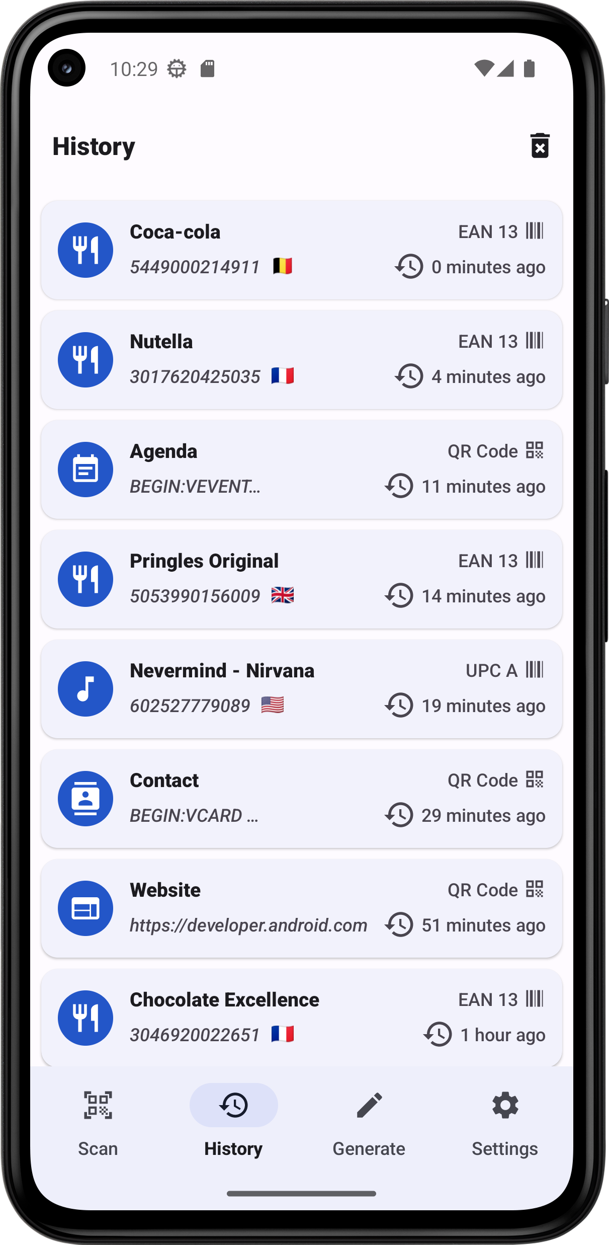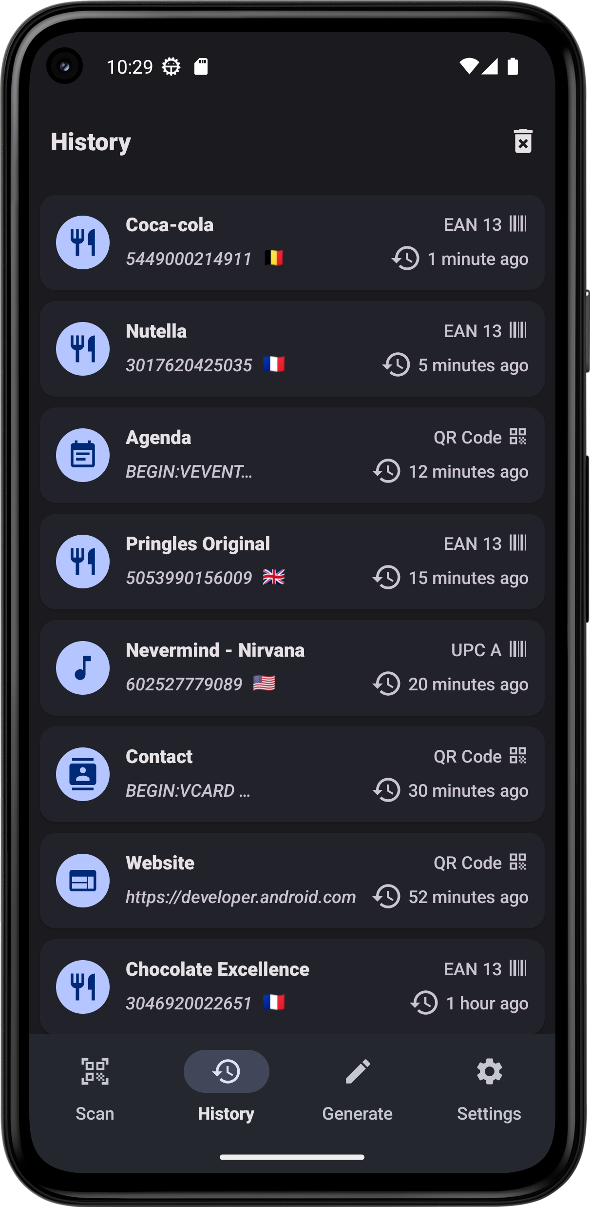 Barcode Scanner is a free and open-source app that allows you to read and generate barcodes. It can collect information about food products, cosmetics books and music (CDs, Vinyls…).