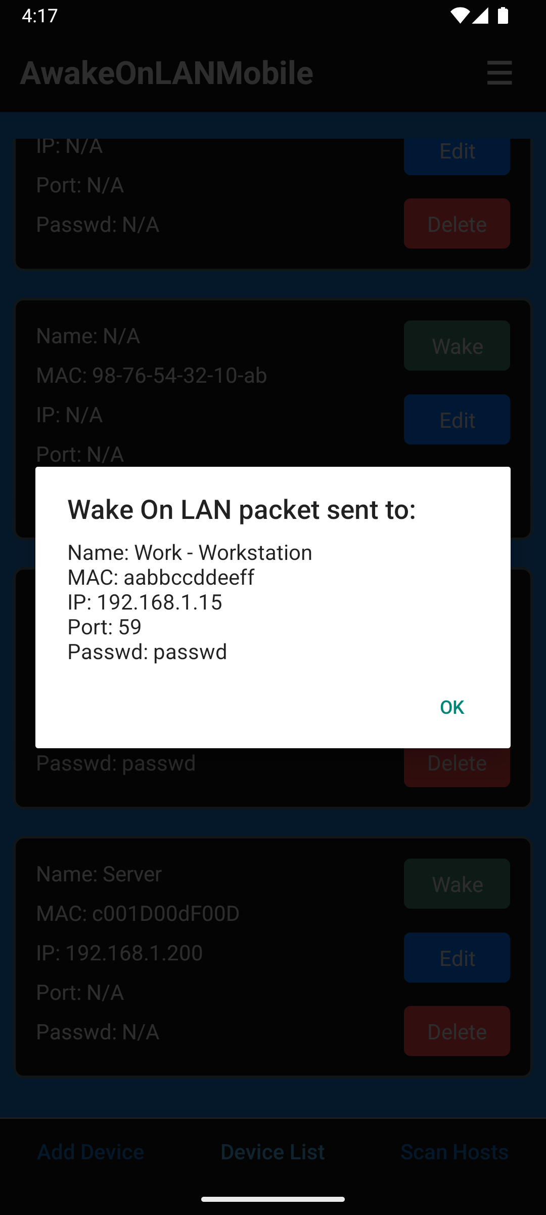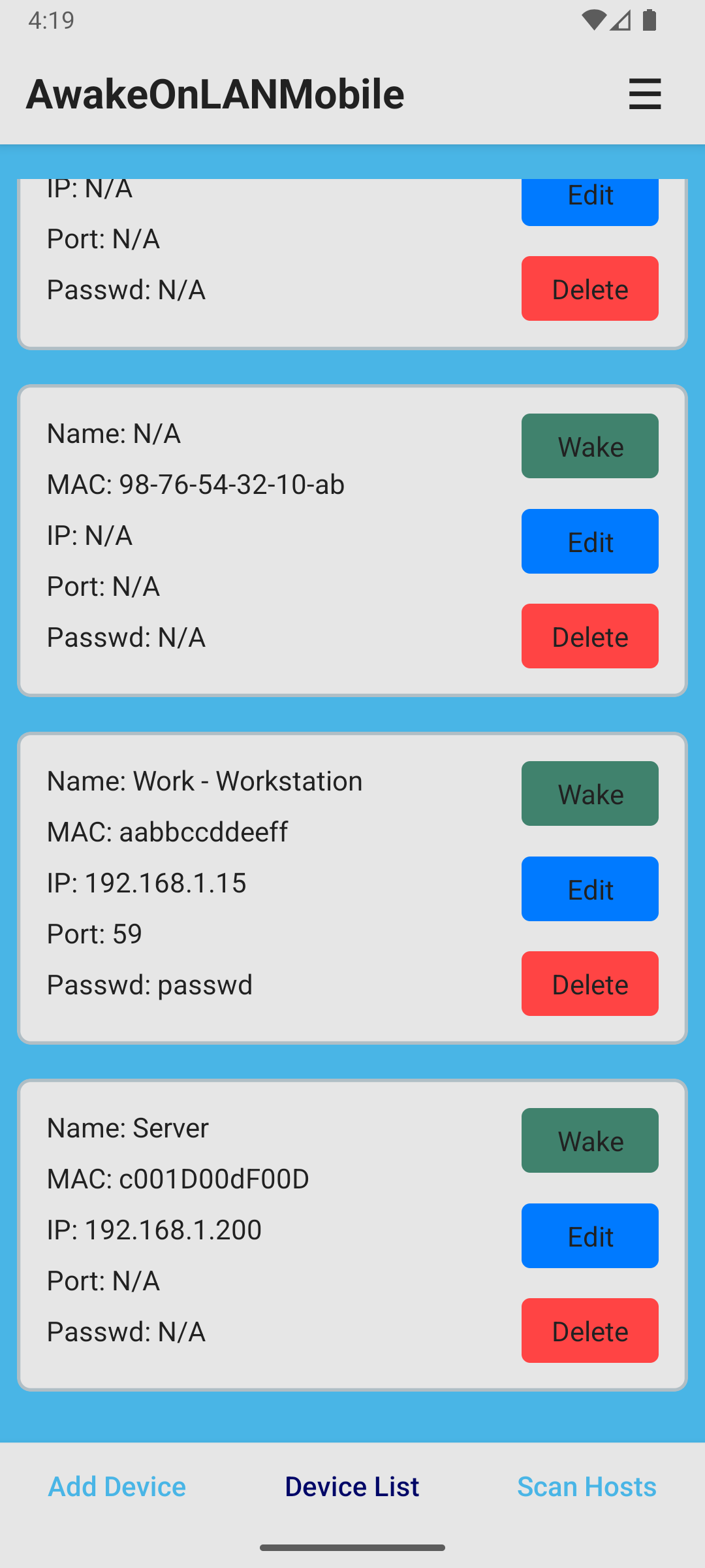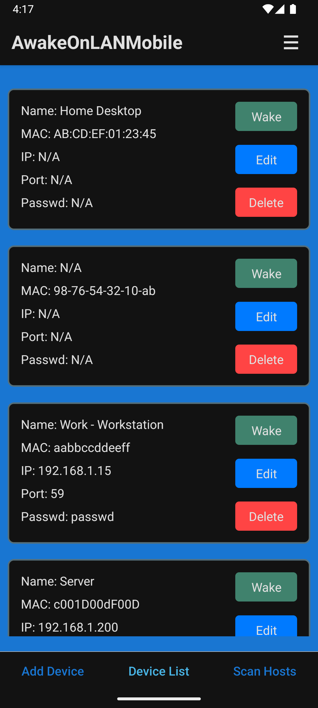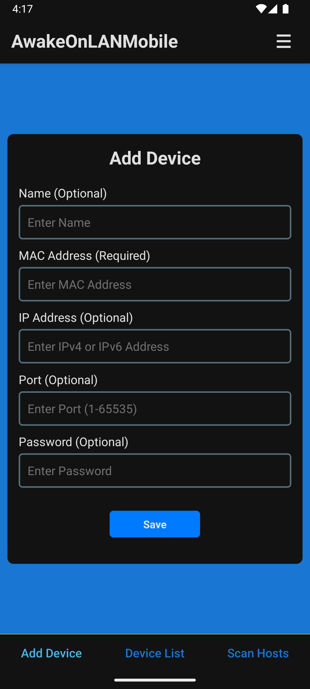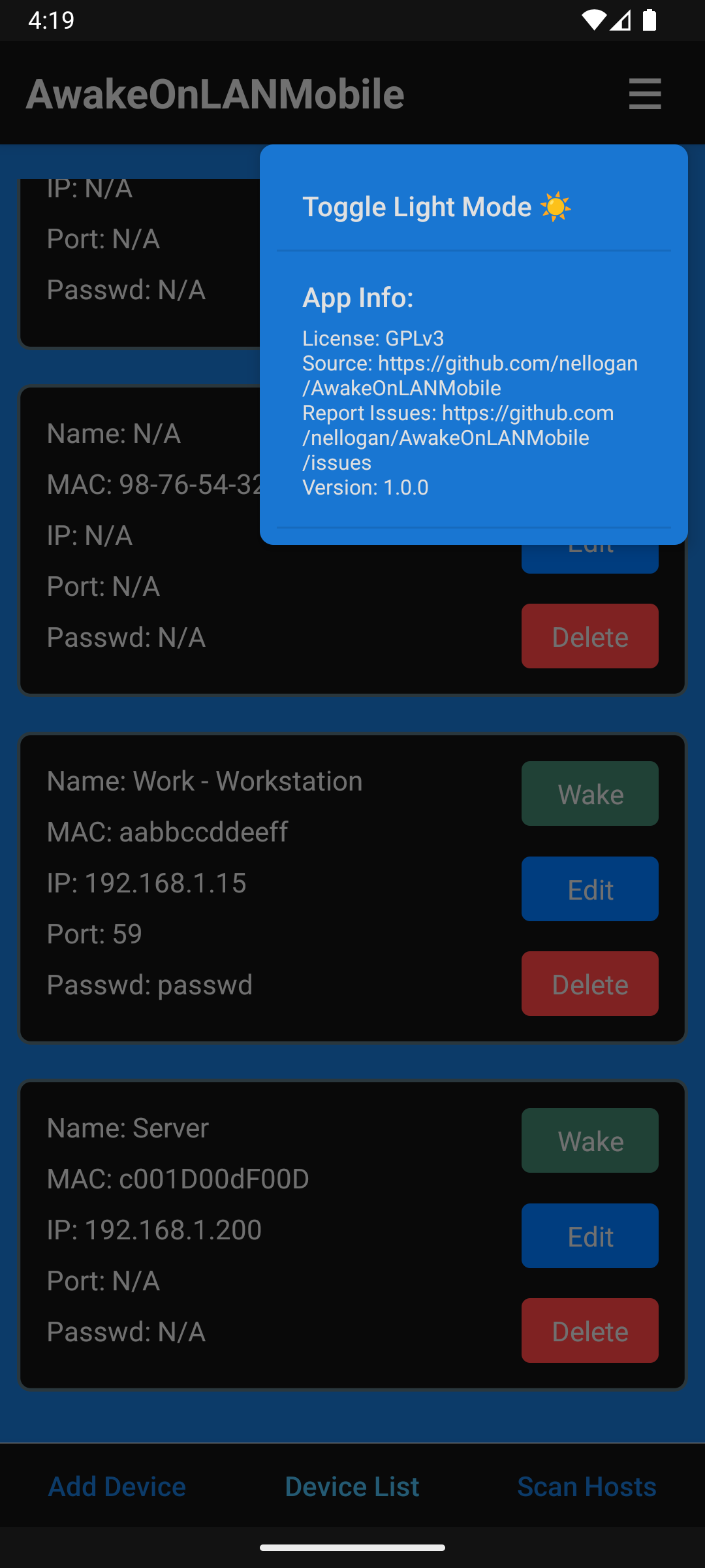 AwakeOnLANMobile enables you to send Wake On LAN (WOL) packets, allowing you to remotely wake up your devices over either a local area network (LAN) or over the internet. It supports IPv4 and IPv6 addresses. The application offers several features: