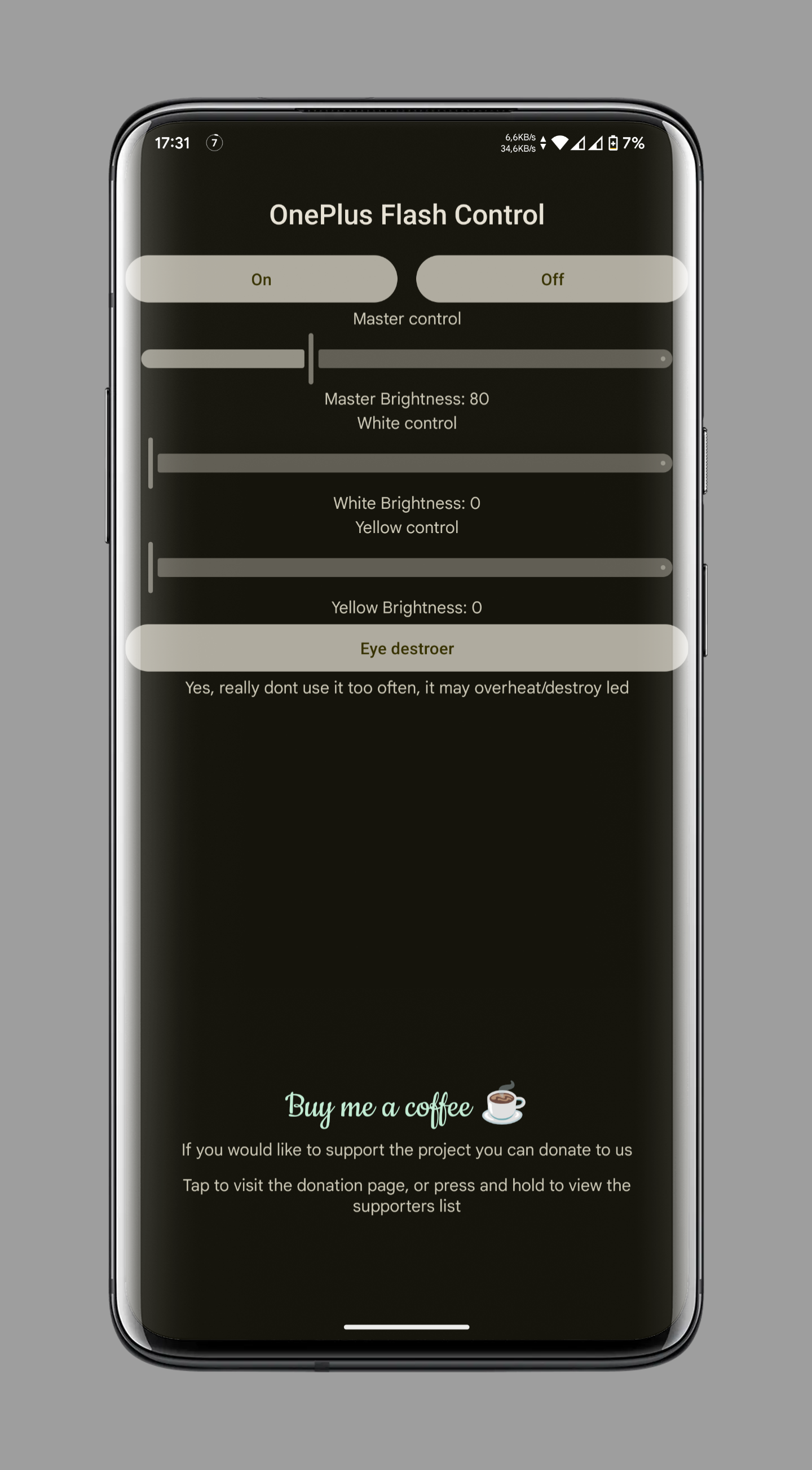 With root access on OnePlus devices, the app provides complete control over your device's LED functionality, allowing you to customize individual white and yellow LED brightness levels beyond stock settings and access advanced features.
