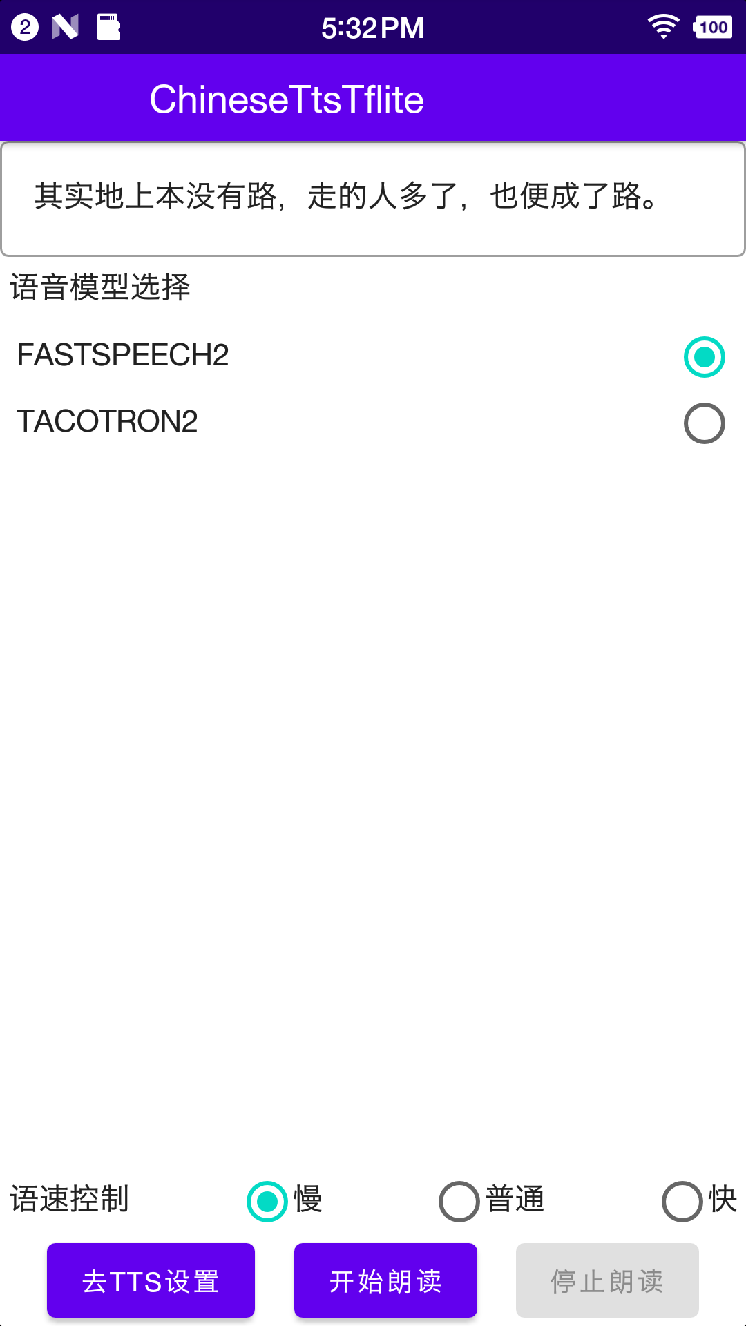 The FastSpeech model works fast but the generated voice has poor anthropomorphic effect. It works well on a middle-end device. The Tacotron has high performance requirements. Though the overall effect is better, the speed is very slow. Therefore it's bundled only for test and can't be used in practice.