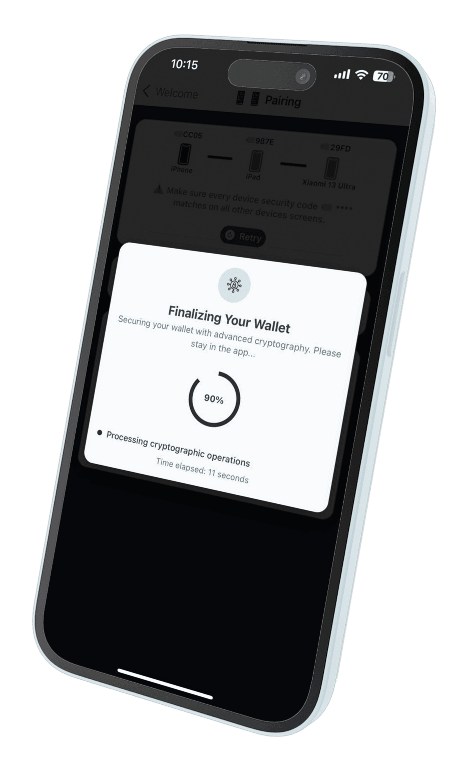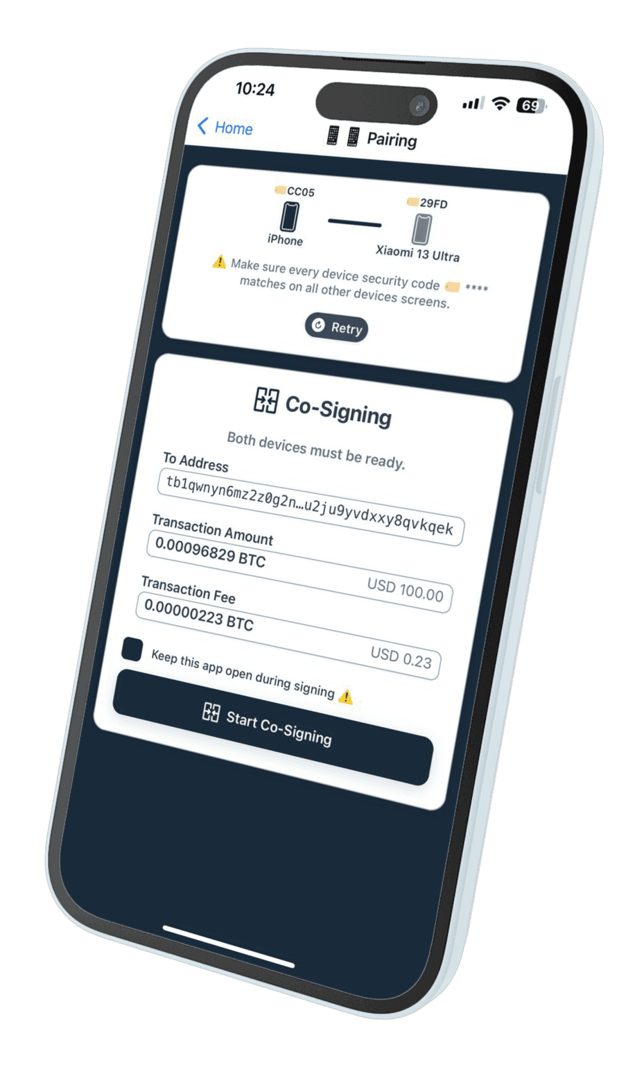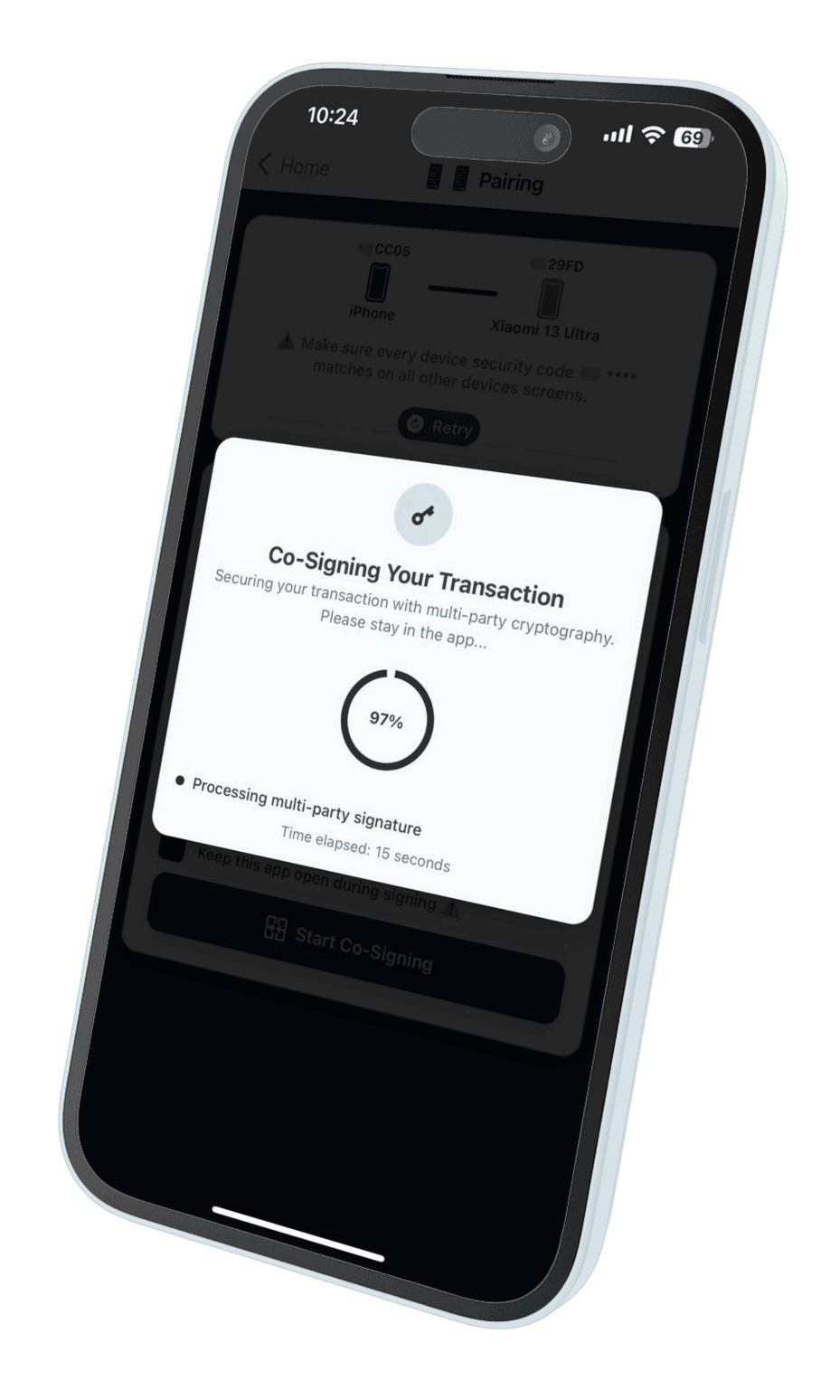 It uses Threshold Signatures (2of3) over your mobile devices — no internet needed for setup or signing.