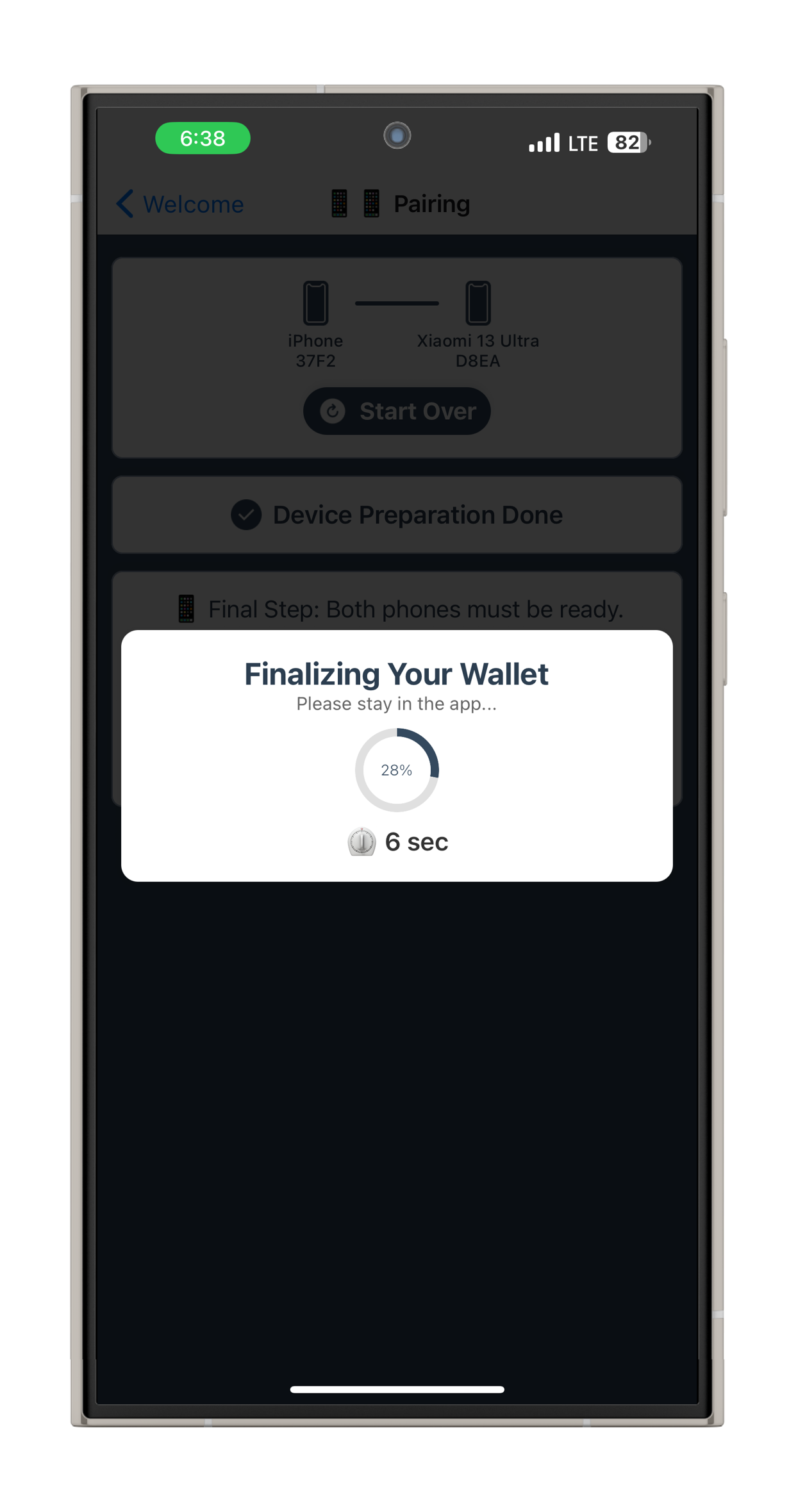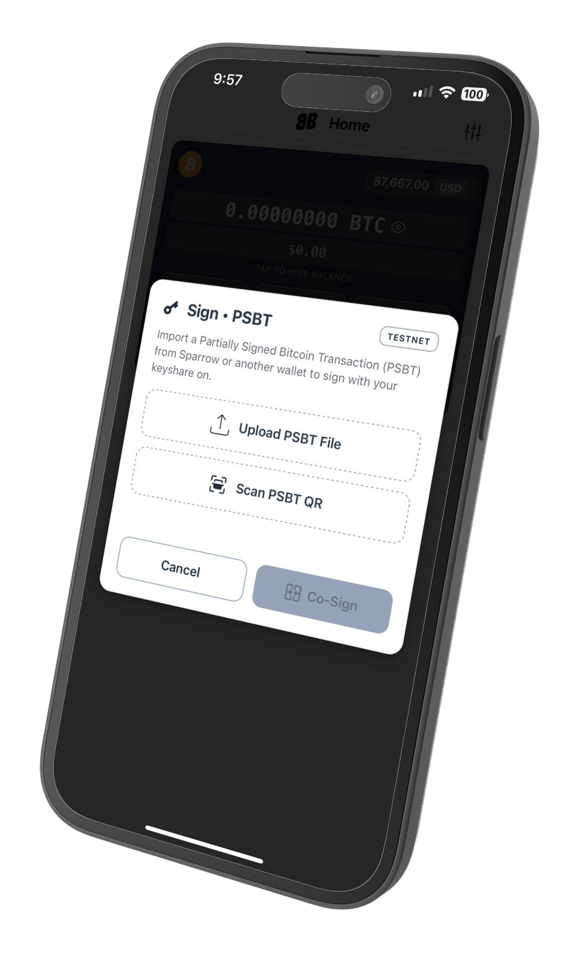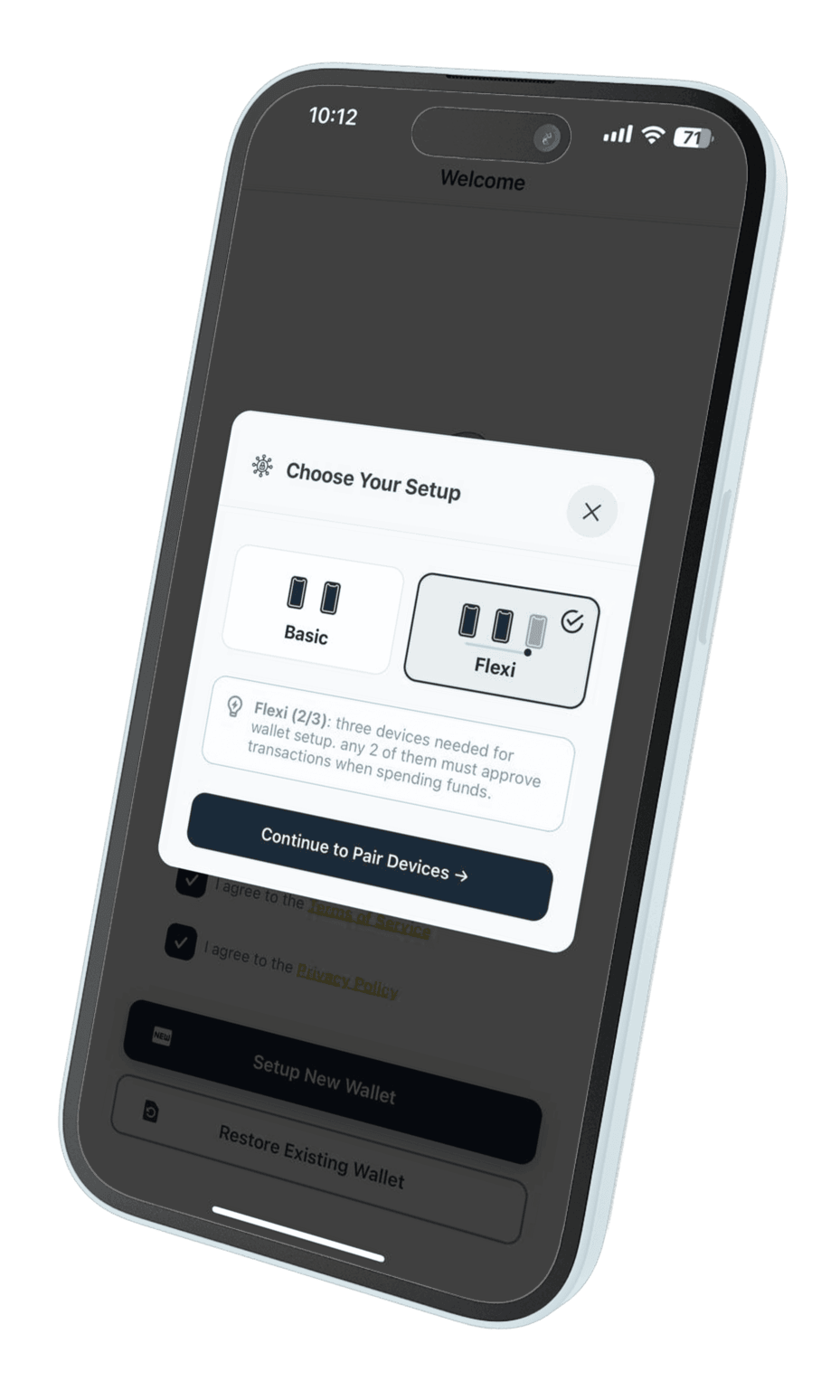 It uses Threshold Signatures (2of3) over your mobile devices — no internet needed for setup or signing.