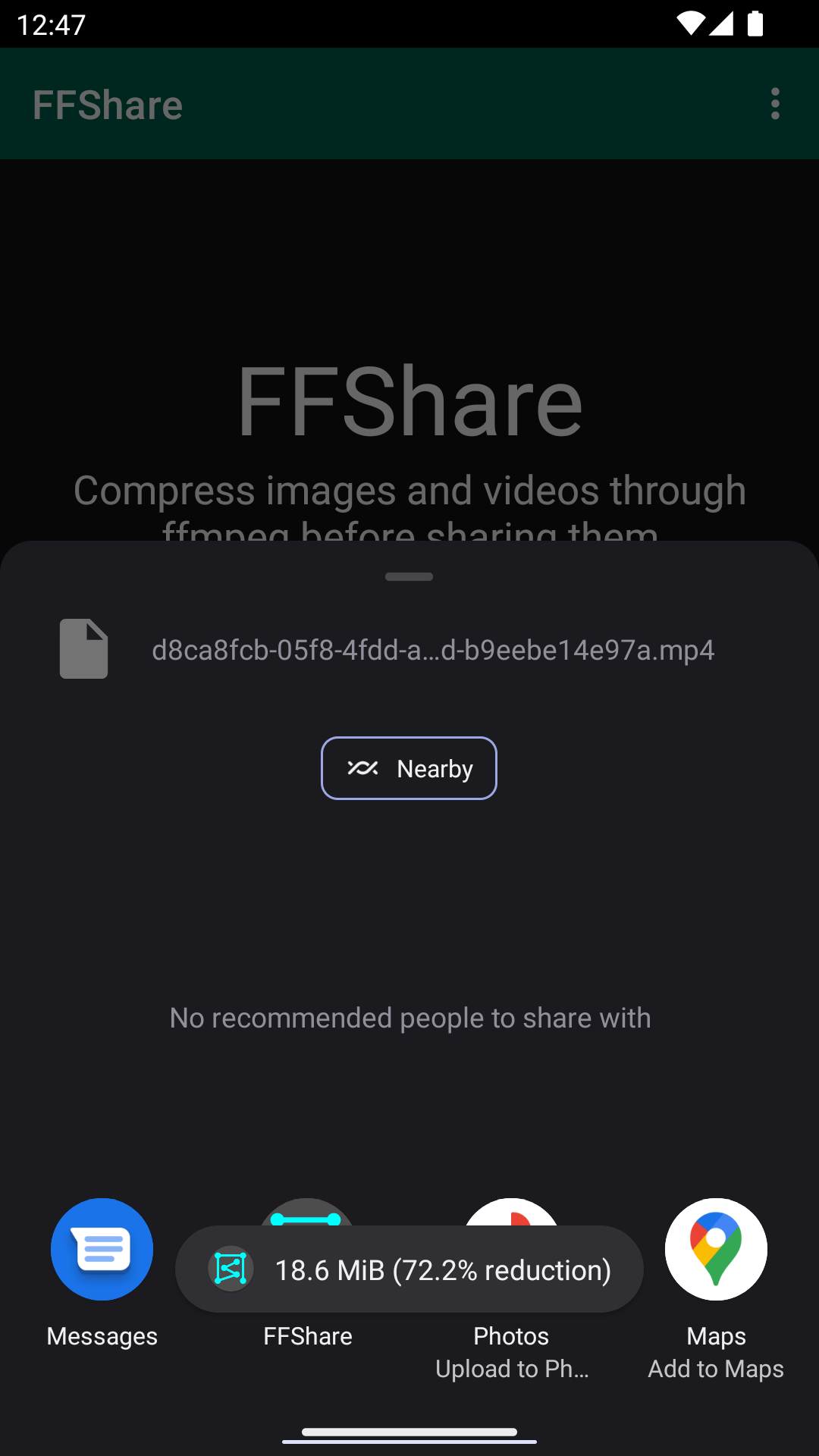FFShare. The app will open showing the compression progress and when it's done a new share dialog will reappear with the new compressed file.