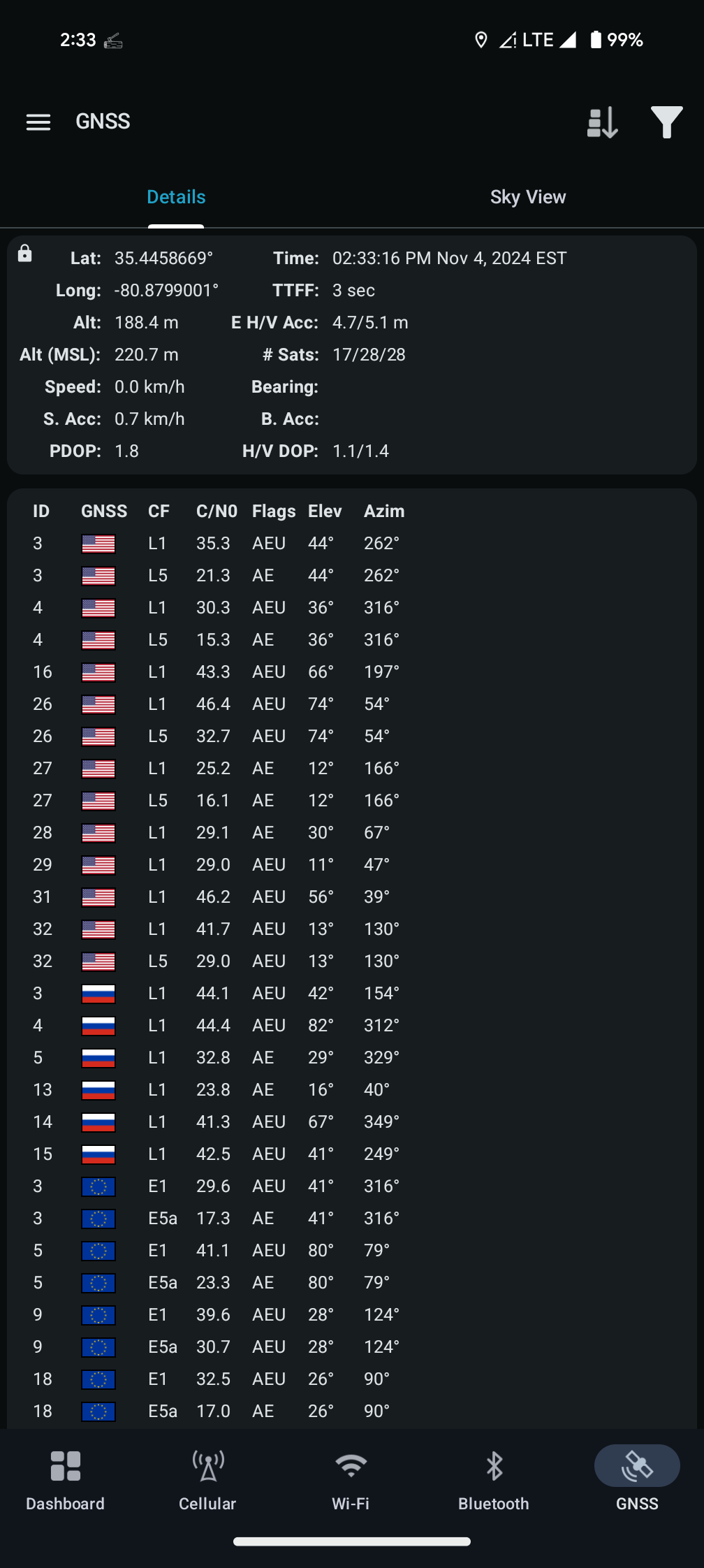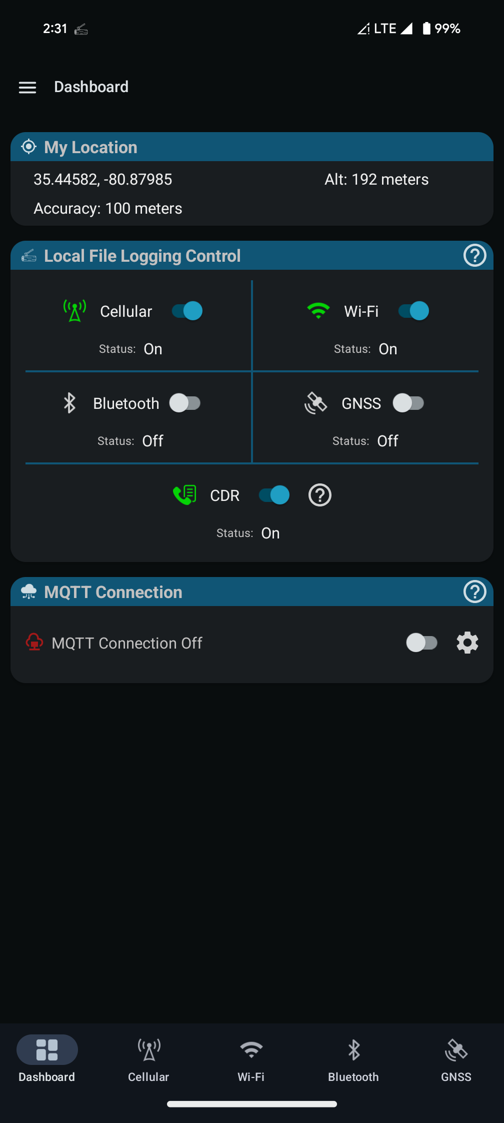 The Network Survey app enables logging cellular, Wi-Fi, Bluetooth, and/or GNSS information to a log file (GeoPackage or CSV format). For cellular records it supports logging GSM, CDMA, UMTS, LTE, and NR records.