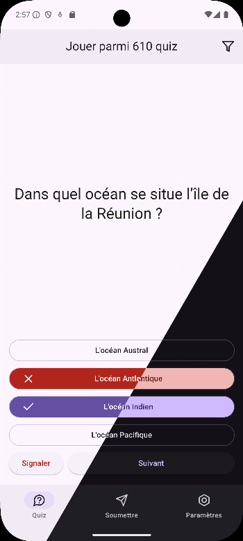 The app lets users answer multiple-choice quizzes by selecting various criteria such as category and difficulty level. The questions are provided by the « Simple Quiz API » (https://quizzapi.jomoreschi.fr/)