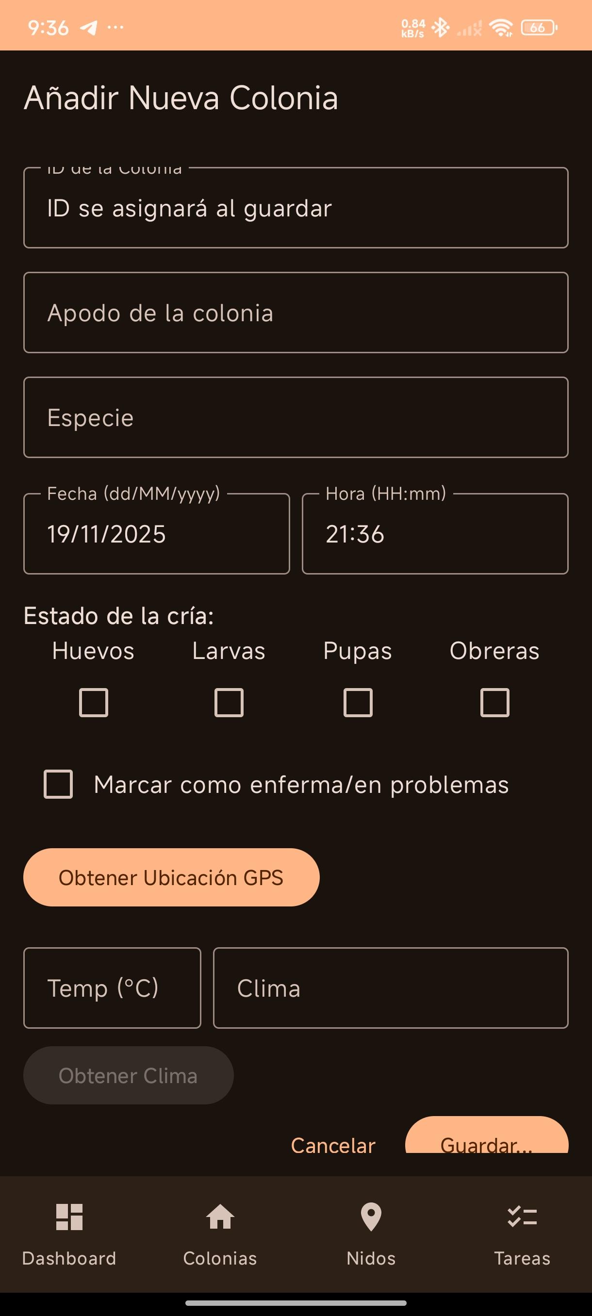 • Register colonies with information such as species, date, brood stage (eggs, larvae, pupae, workers), and whether they are diseased.