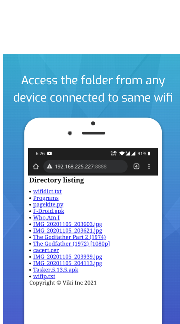 This app can start a http-server from an android/ios device binding to the port specified by the user (default 8888) and expose a directory from the device specified by the user (default dir /sdcard/Downloads).