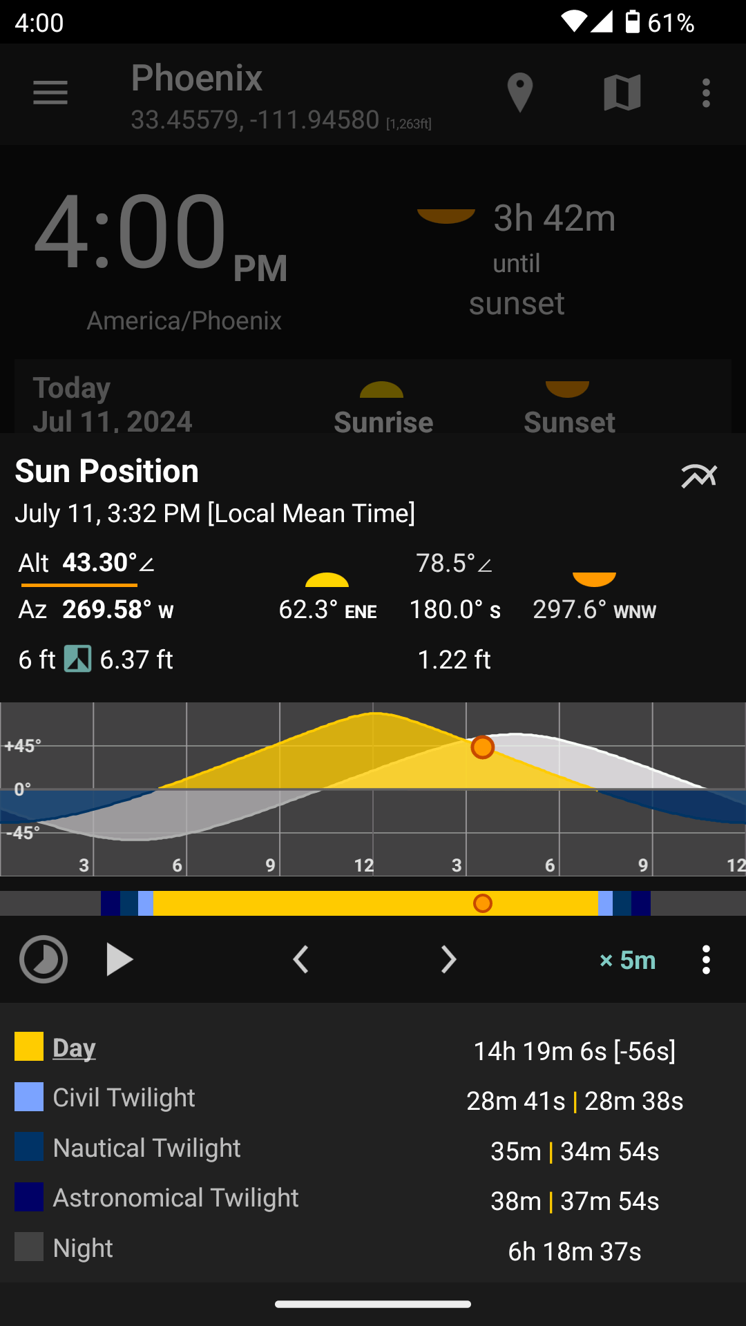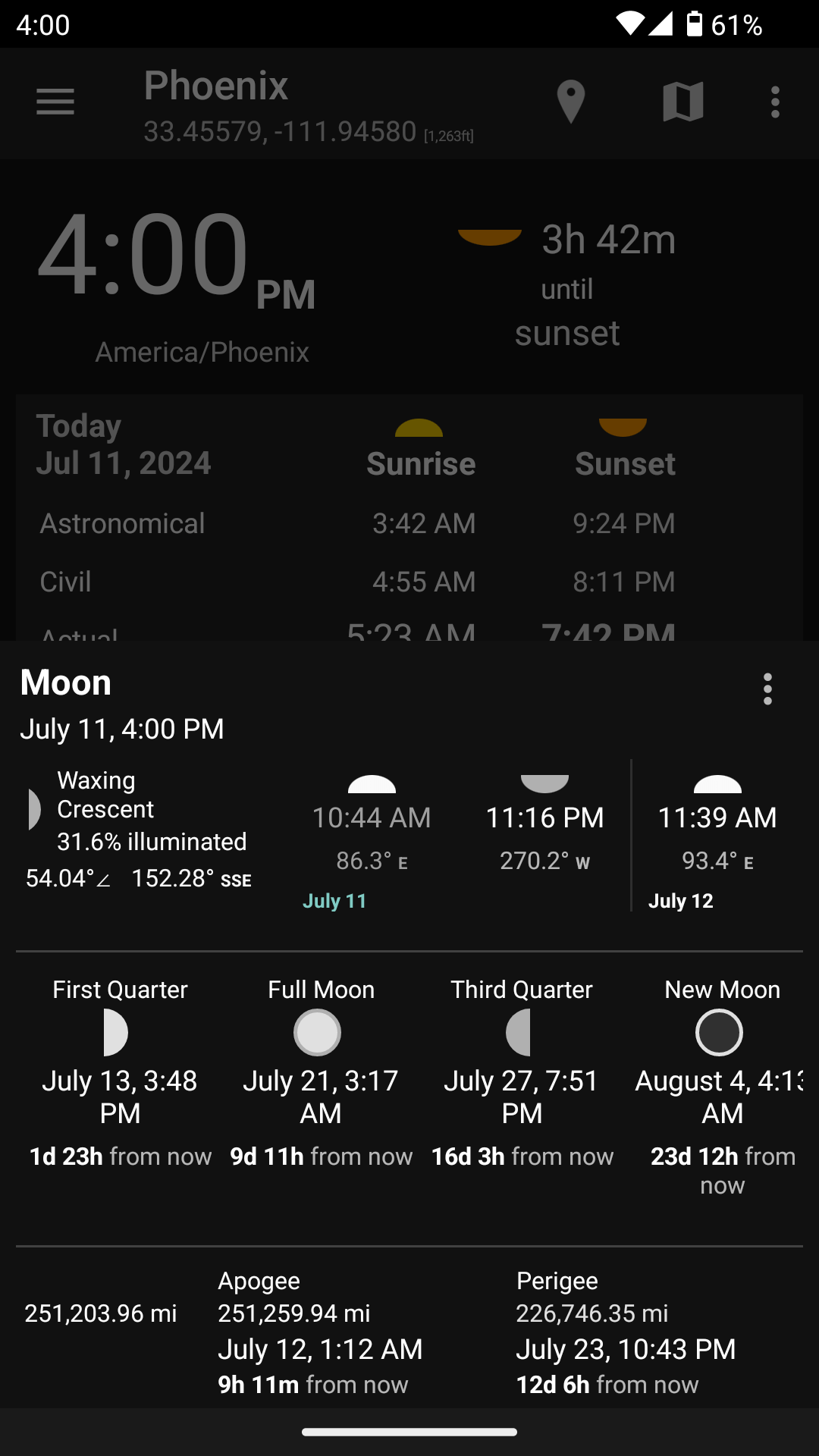 Suntimes displays sunrise and sunset, twilight (civil / nautical / astronomical), blue and golden hour, the solstices and equinoxes, moonrise and moonset, moon phases and illumination. The alarm clock schedules daily repeating alarms (or notifications) for sunrise, sunset, and other events. The app includes many features commonly associated with a world clock.