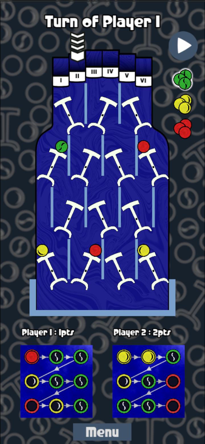 They will pick a color and select a slide to drop the chosen marble which will go thought gates. If any marble has fall to the bottom, they will be add to the score if they match the target colors in the score board.