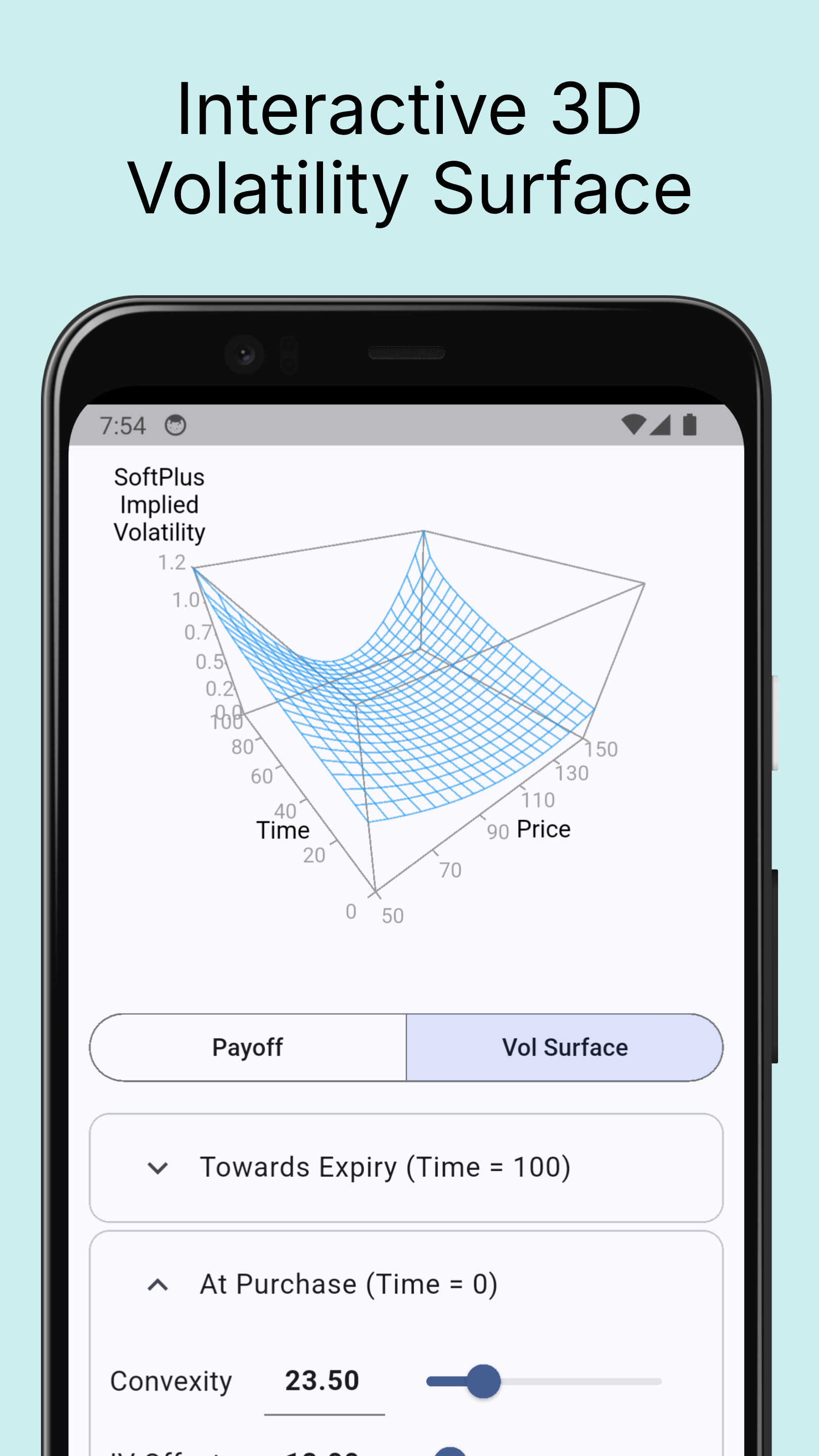 Offline-first, privacy-focused options payoff and volatility surface simulator. Explore payoff diagrams for any option combination interactively using the Softplus pricing model (a quick and dirty approximation that avoids Black-Scholes rigidity). Markets are uncertain — no model is the ultimate truth. That’s why this app is built for play and intuition: tweak the volatility surface and instantly see how shocks, skew changes, term-structure shifts, or full volatility regime changes affect your strategy.