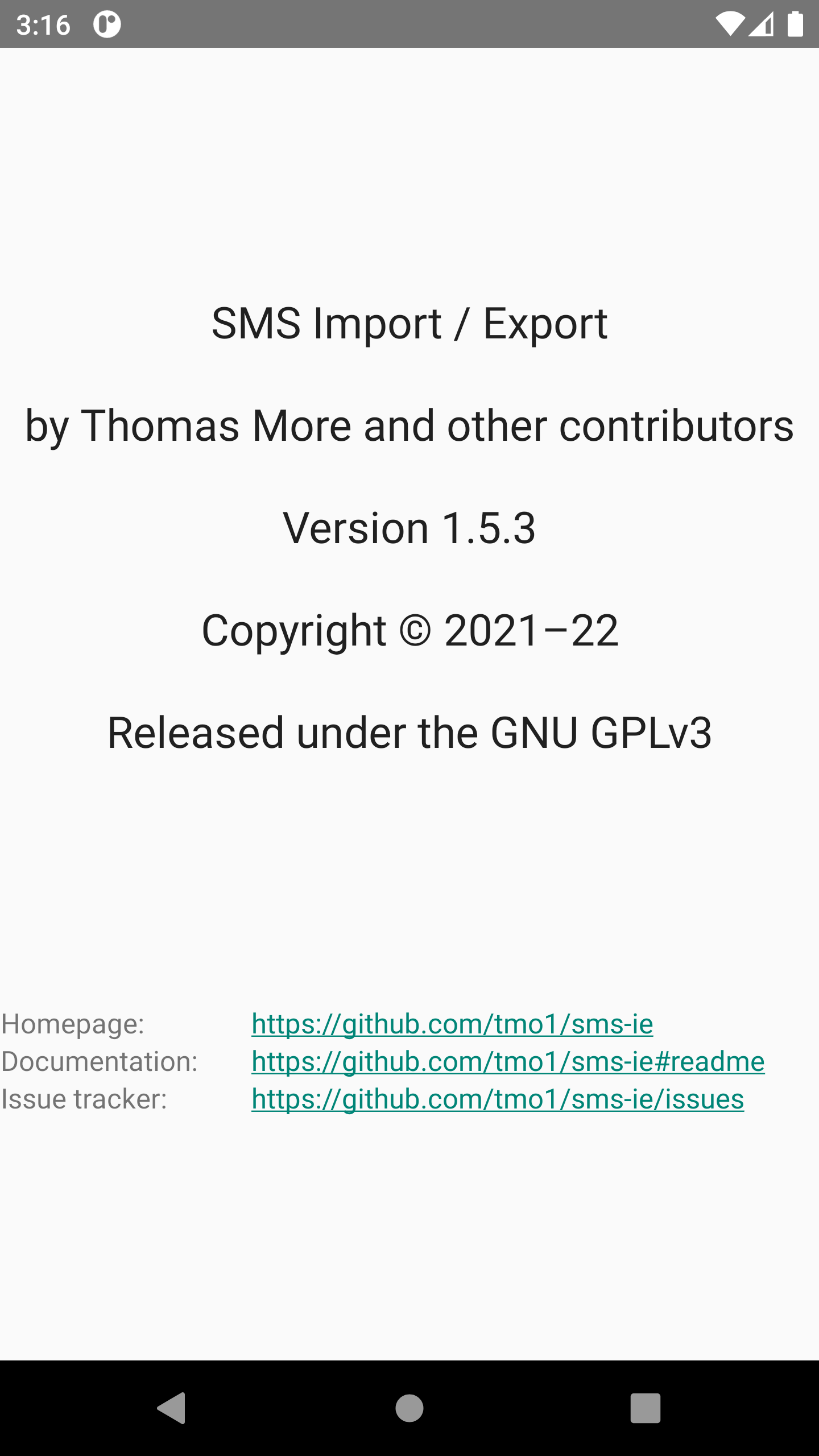 The primary author of SMS Import / Export is Thomas More. Others have contributed code and translations. The software is copyright 2021-2025, and is released under the GNU General Public License version 3 or later.