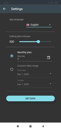 The App display the minutes consumed by outgoing calls and the number of SMS messages sent in the current month (by default) or in a selected billing cycle. A selected range of dates can also be queried.
