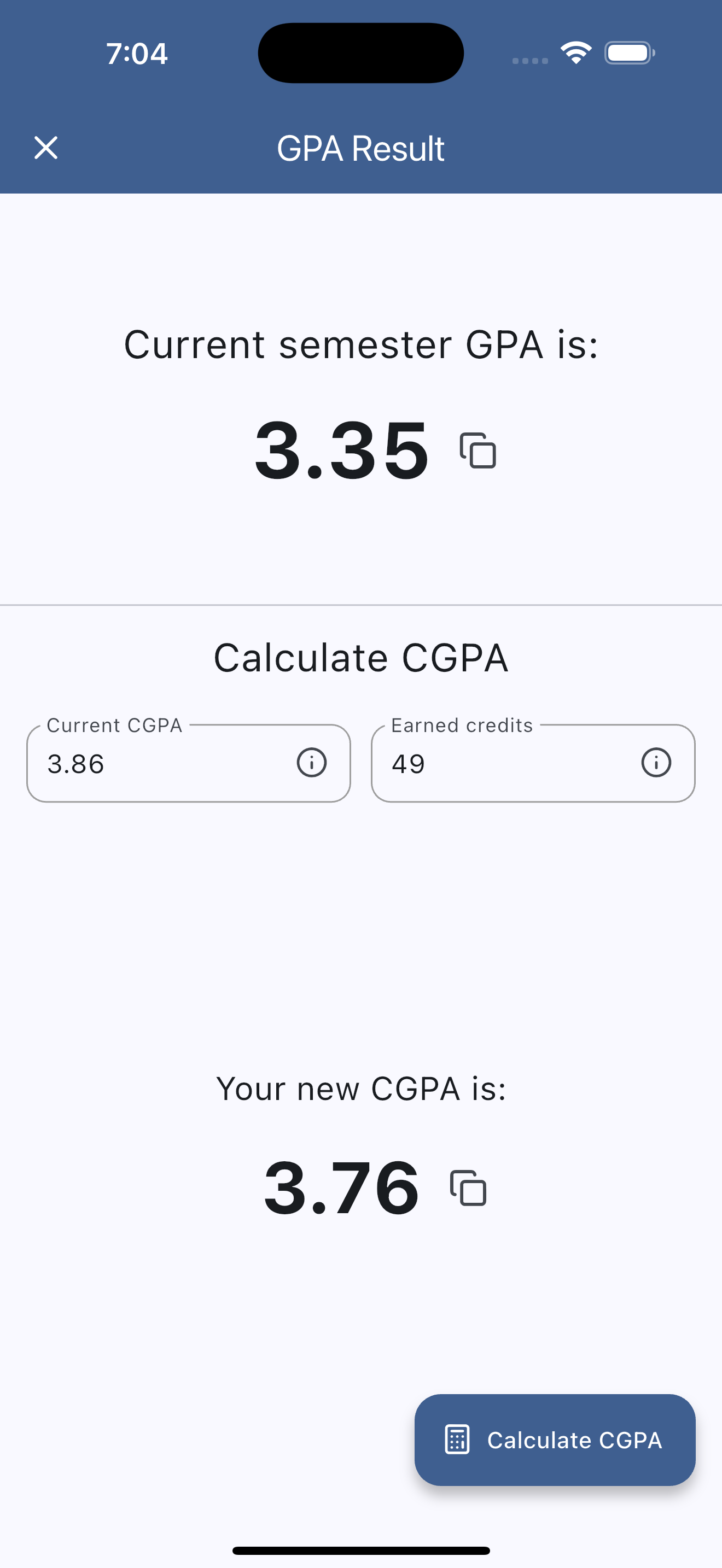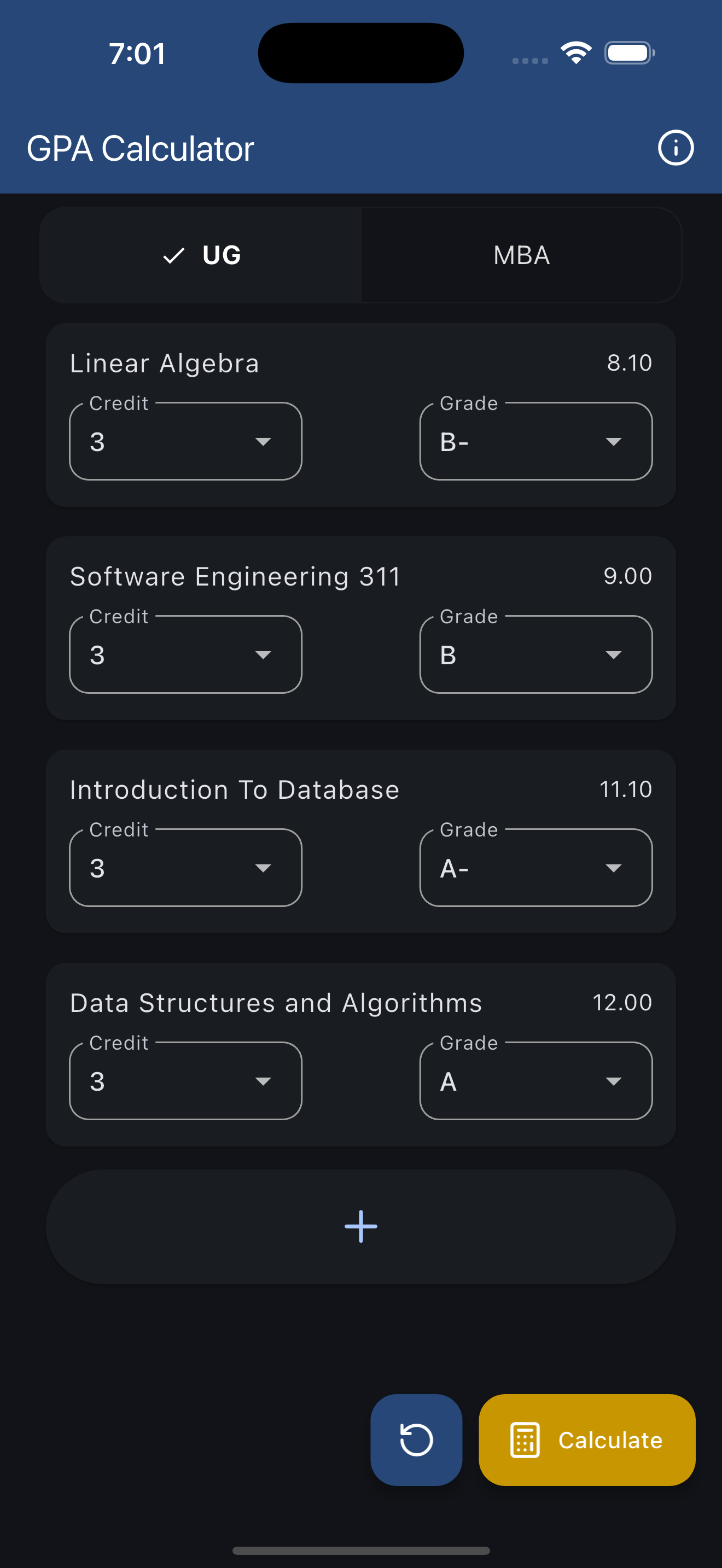 This app helps students calculate their Grade Point Average (GPA) and Cumulative GPA (CGPA) quickly and accurately. It follows the grading policies used at the American University of Iraq, Sulaimani (AUIS), making it especially useful for AUIS students, while still being suitable for anyone who wants a reliable GPA calculator.