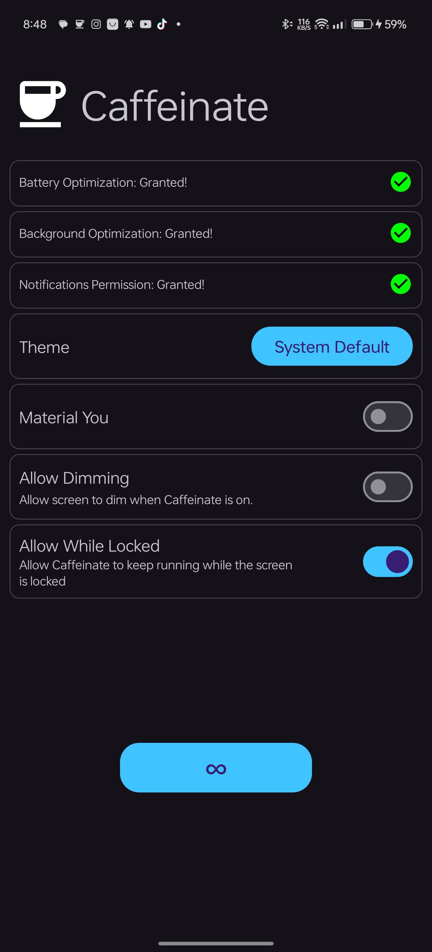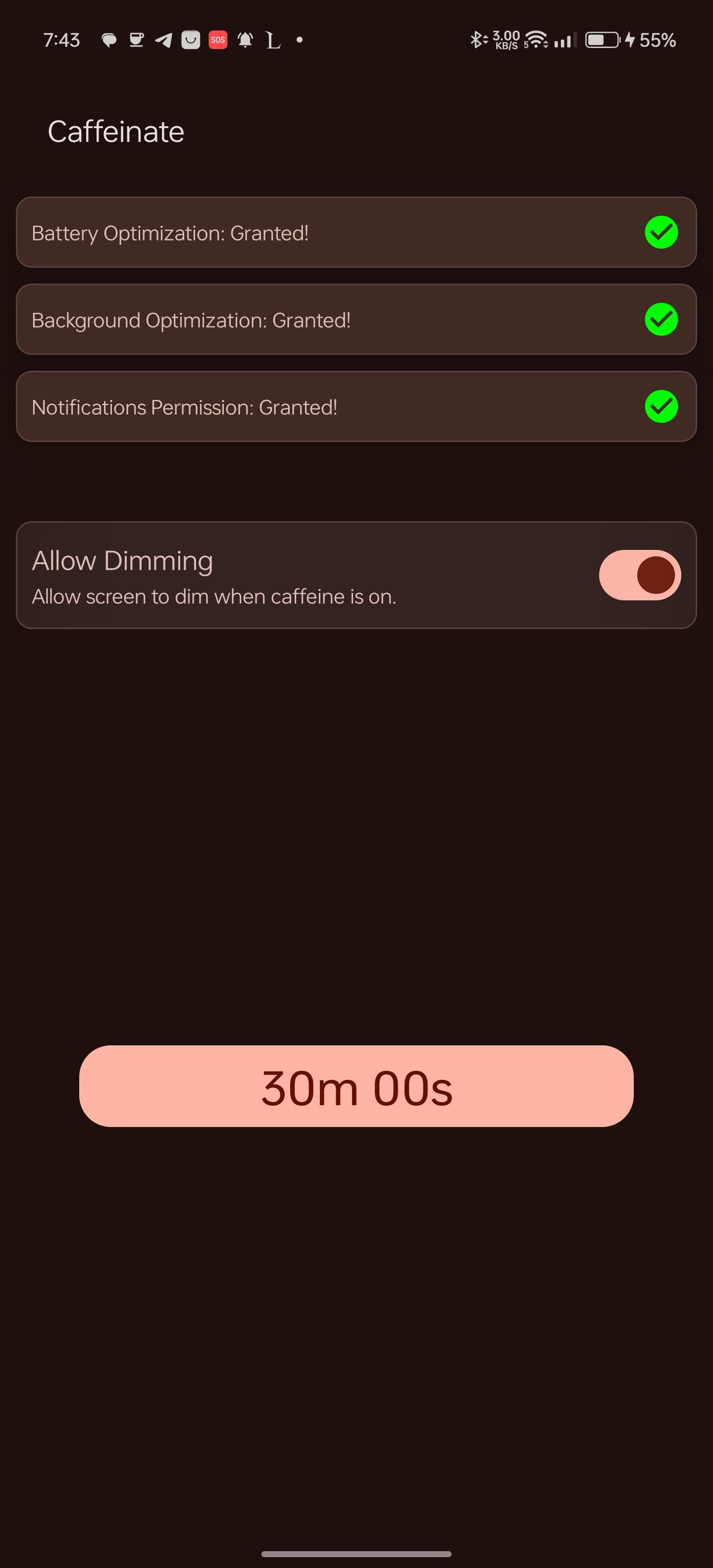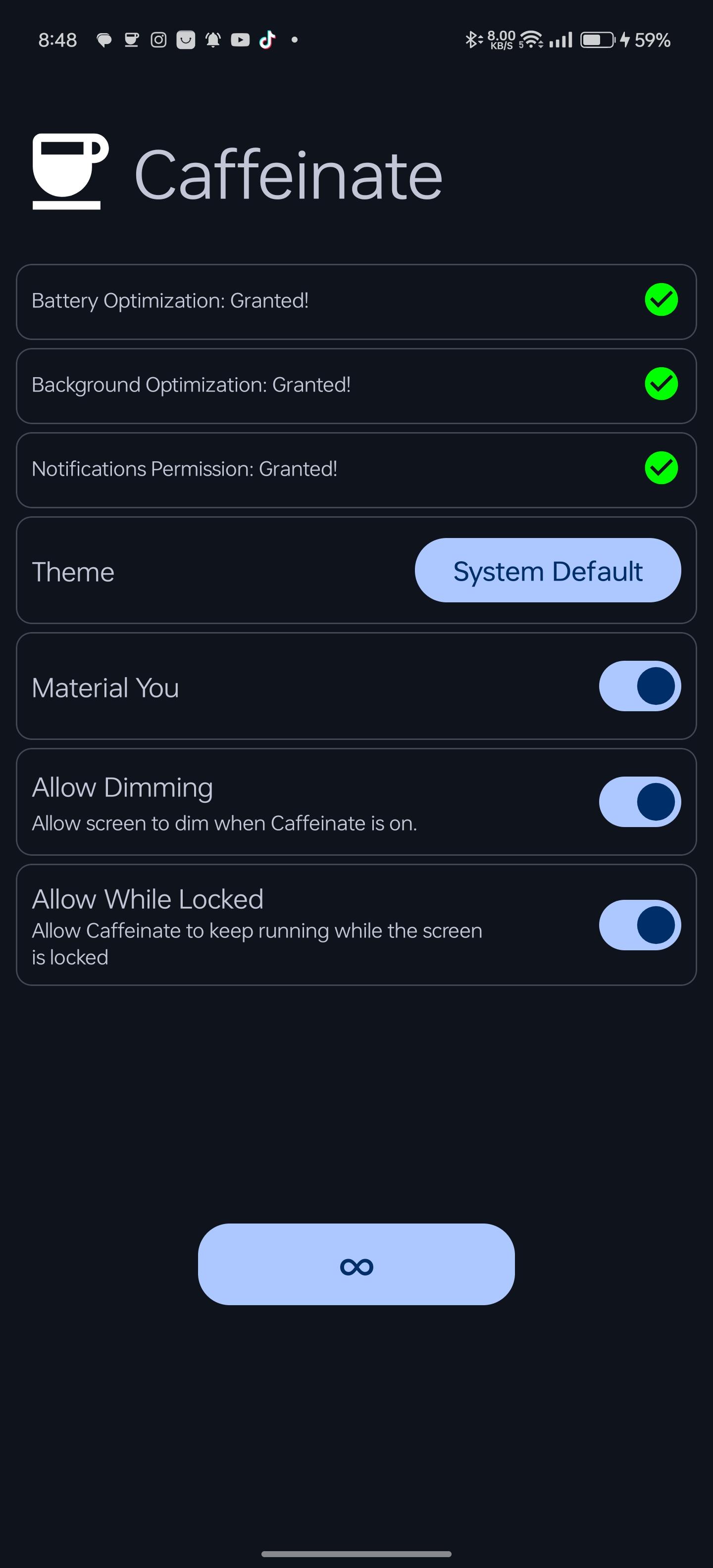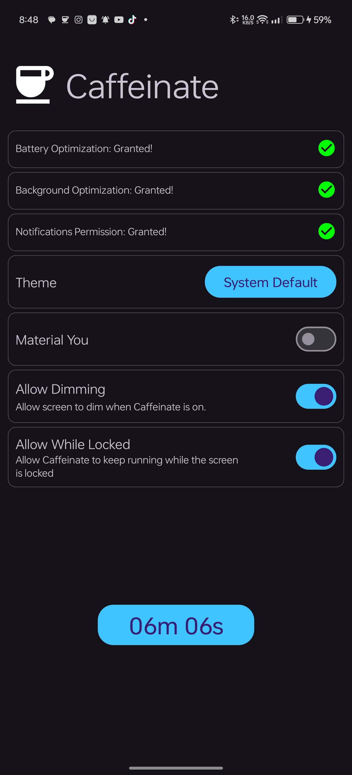 WakeLock Class with either SCREEN_DIM_WAKE_LOCK or SCREEN_BRIGHT_WAKE_LOCK lock level based on user settingsquick settings tile or the button in the app. clicking them, selects the next timeout and after 1 second the timeout will start, if the quick settings tile or the button are clicked after starting, the timeout will stop.[30 seconds, 05 minutes, 10 minutes, 15 minutes, 30 minutes, 60 minutes, Ꝏ]WakeLock is acquiredWakeLock if the screen is locked, so that the screen will keep on after unlocking, default behaviour is that the WakeLock is released when the screen is locked[light, dark, system default and material you]WhatsNew: