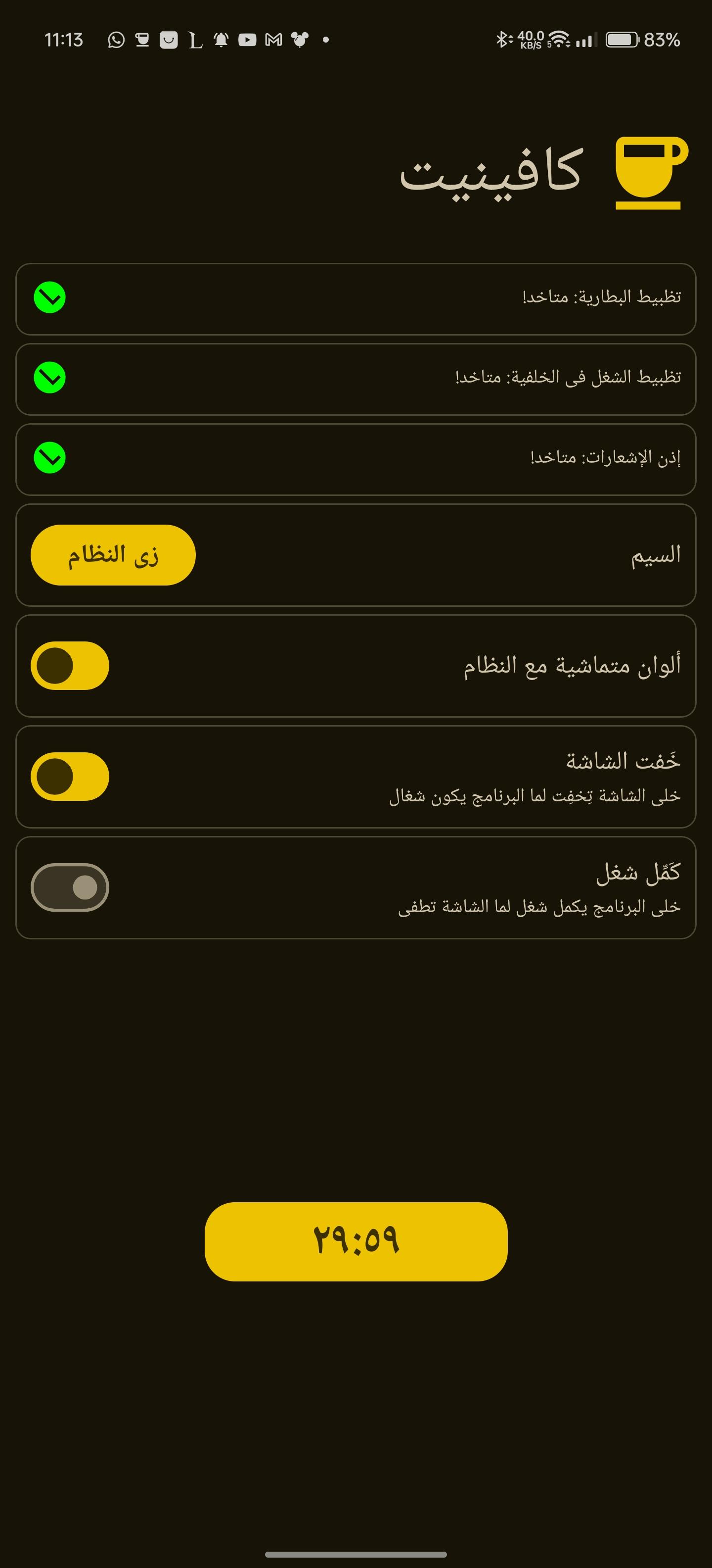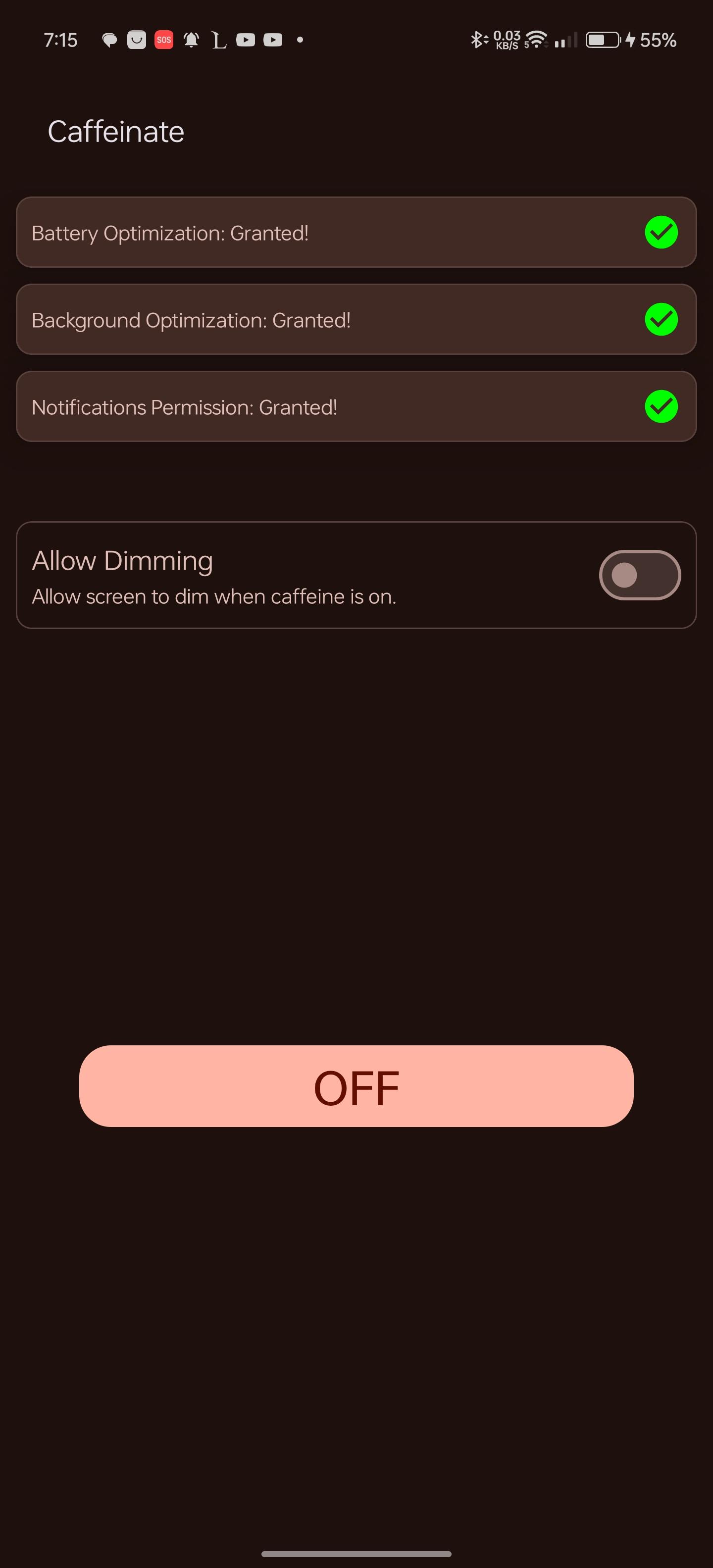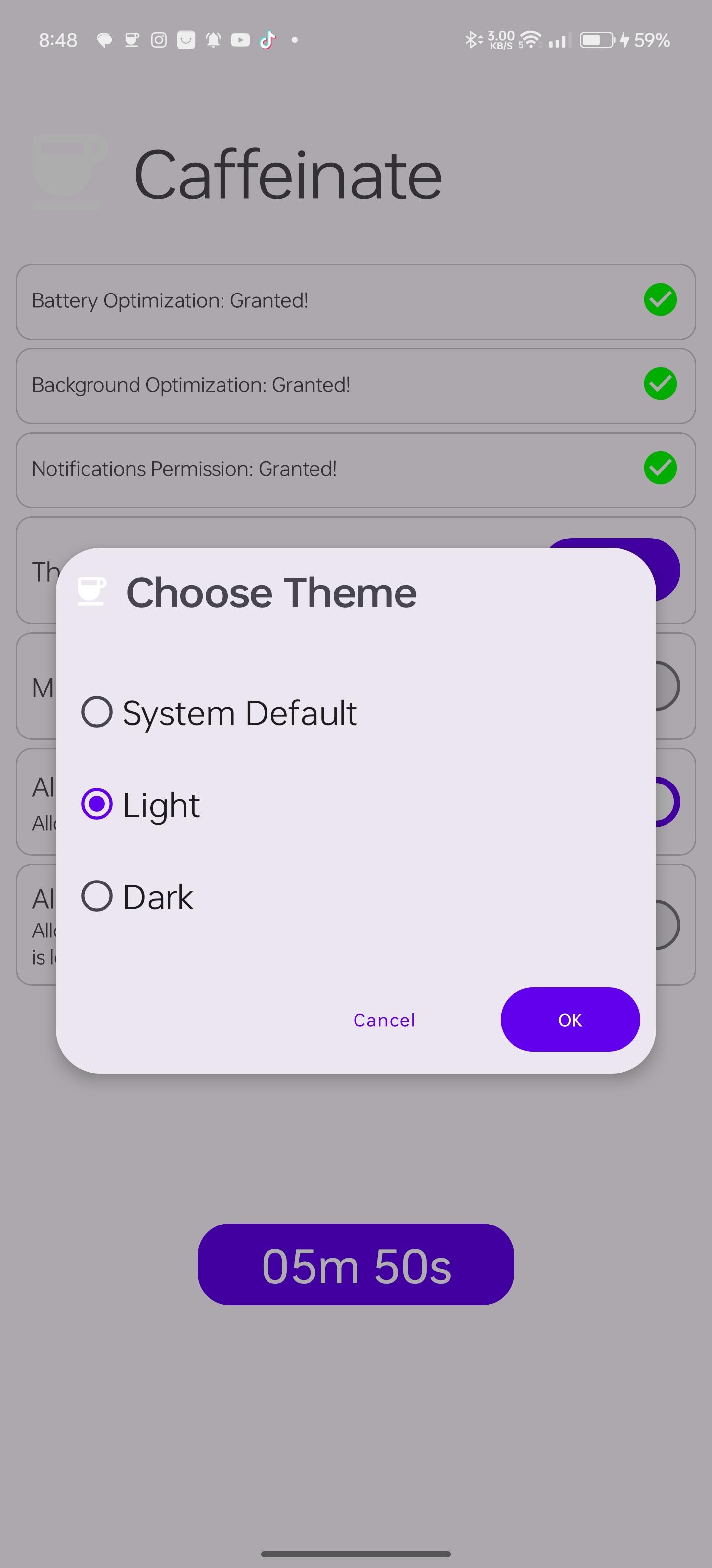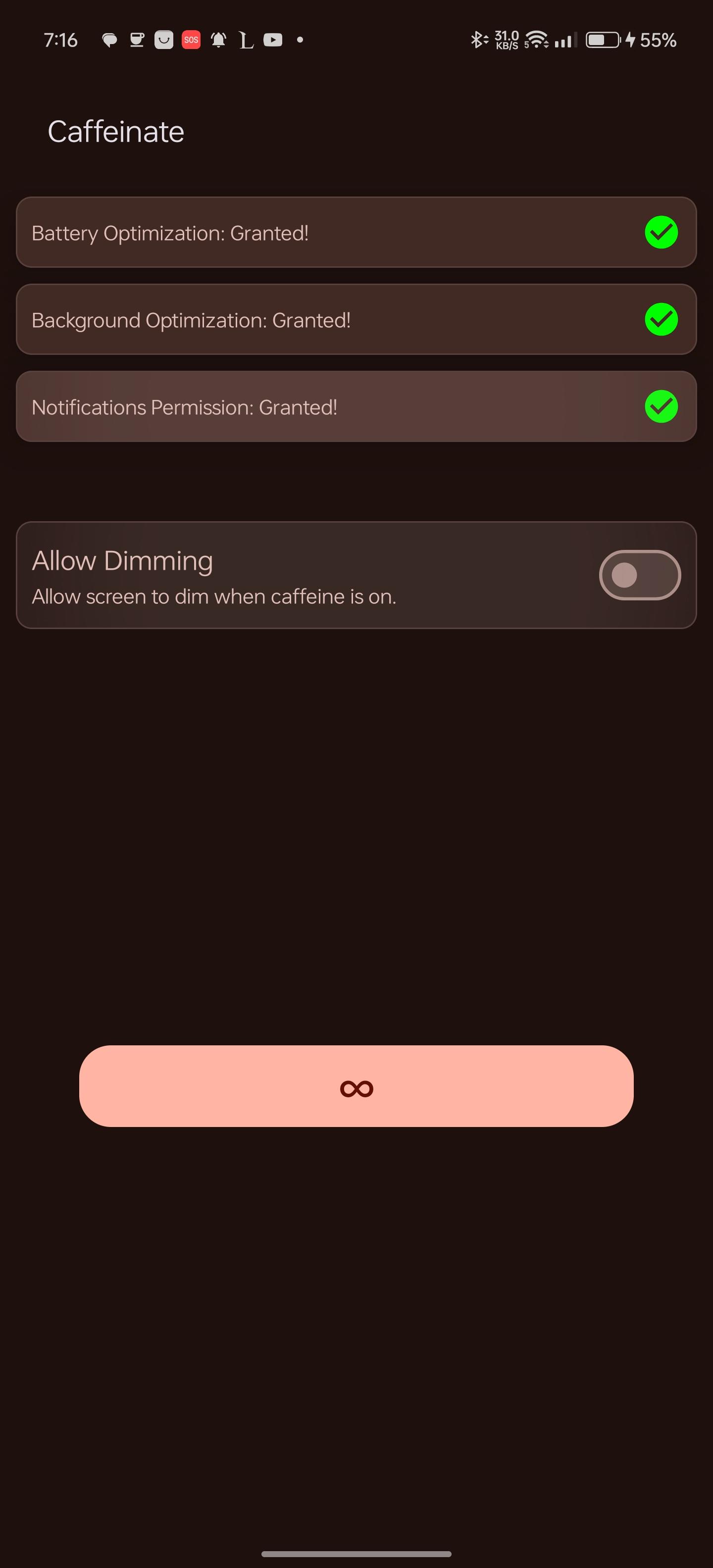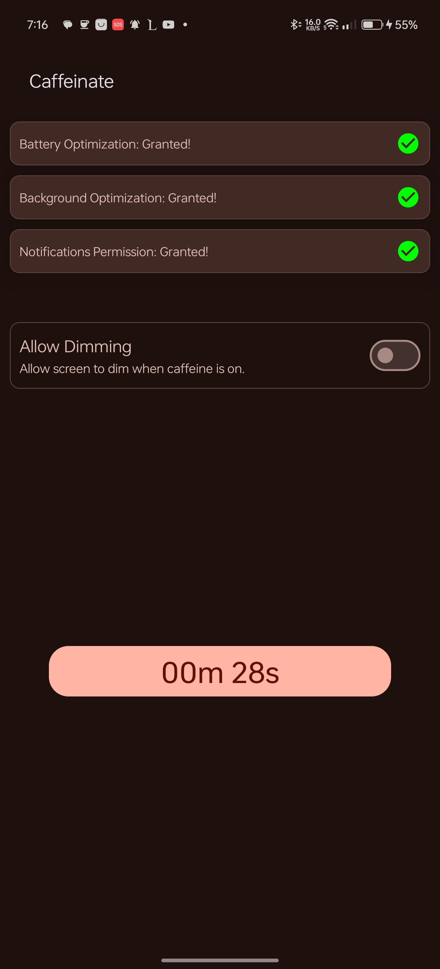 WakeLock Class with either SCREEN_DIM_WAKE_LOCK or SCREEN_BRIGHT_WAKE_LOCK lock level based on user settingsquick settings tile or the button in the app. clicking them, selects the next timeout and after 1 second the timeout will start, if the quick settings tile or the button are clicked after starting, the timeout will stop.[30 seconds, 05 minutes, 10 minutes, 15 minutes, 30 minutes, 60 minutes, Ꝏ]WakeLock is acquiredWakeLock if the screen is locked, so that the screen will keep on after unlocking, default behaviour is that the WakeLock is released when the screen is locked[light, dark, system default and material you]WhatsNew: