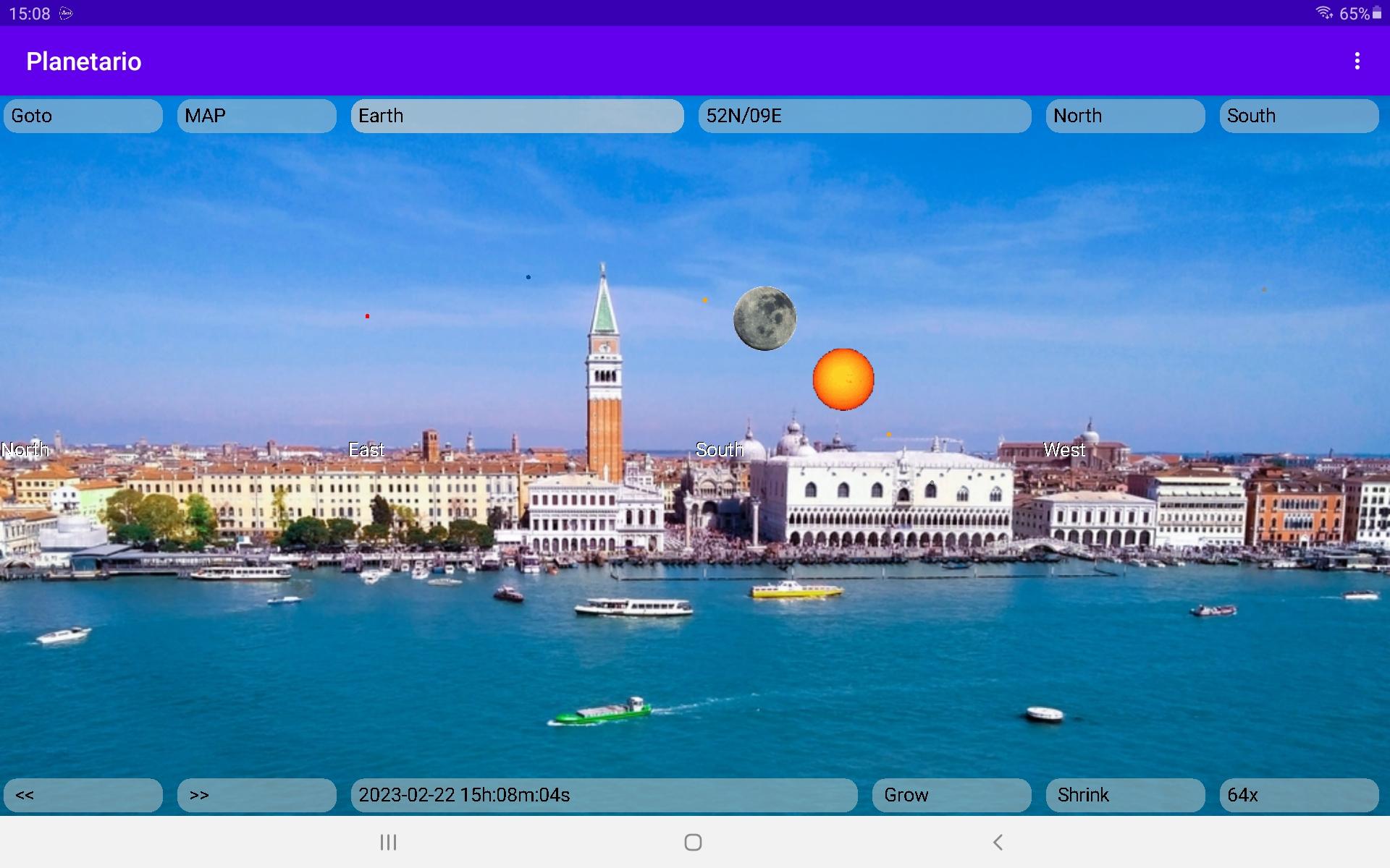 Planetario contains a 3D model of our solar system. It will show the horizon and the planets in their path along the sky. The word planet comes from the Greek planetai, meaning "wanderers". Because of the rotation of the earth, the stars seem to move in perfect circles, but the path of planets seem to wander against the background of stars.