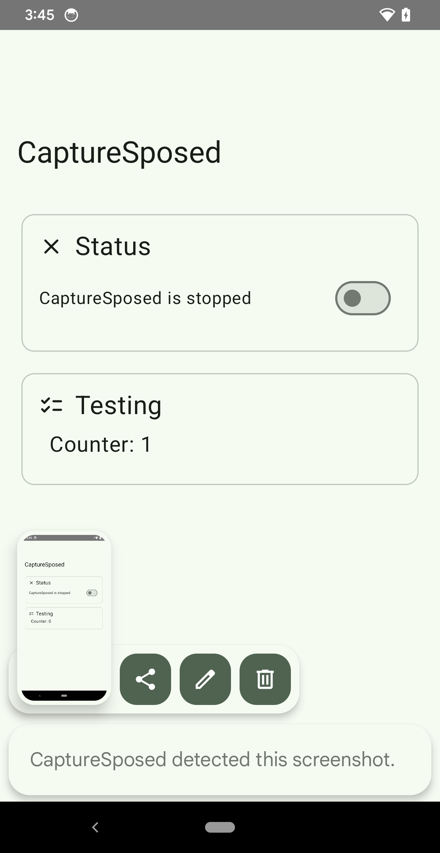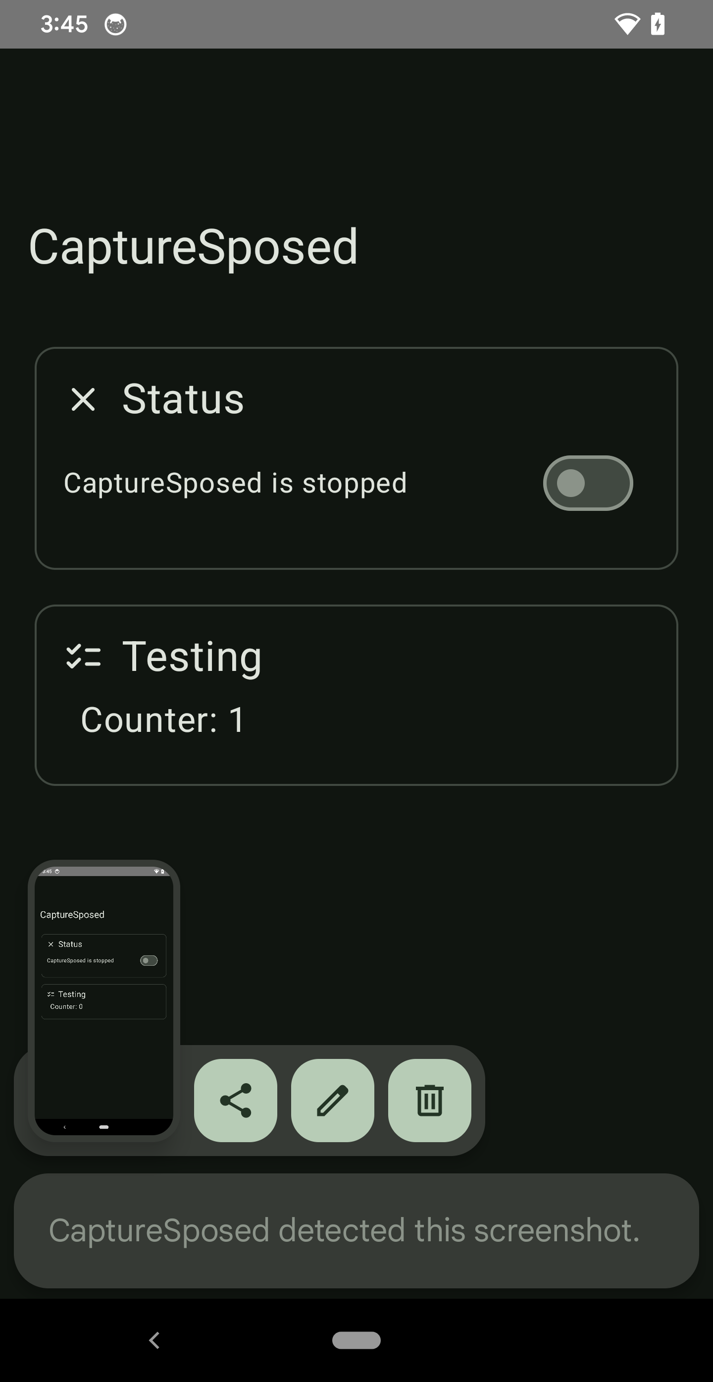 ⚠️ WARNING: CaptureSposed is intended for rooted devices running Android 14 or newer and requires Xposed. The required Xposed variant to use is LSPosed. Other Xposed variants will not work. This module cannot be guaranteed to work on all devices. In the worst case, it can cause a bootloop. Use at your own risk. Additionally, this module does not protect against screenshot detection from apps that use the pre-Android 14 approach of using file system listeners to detect screenshots (