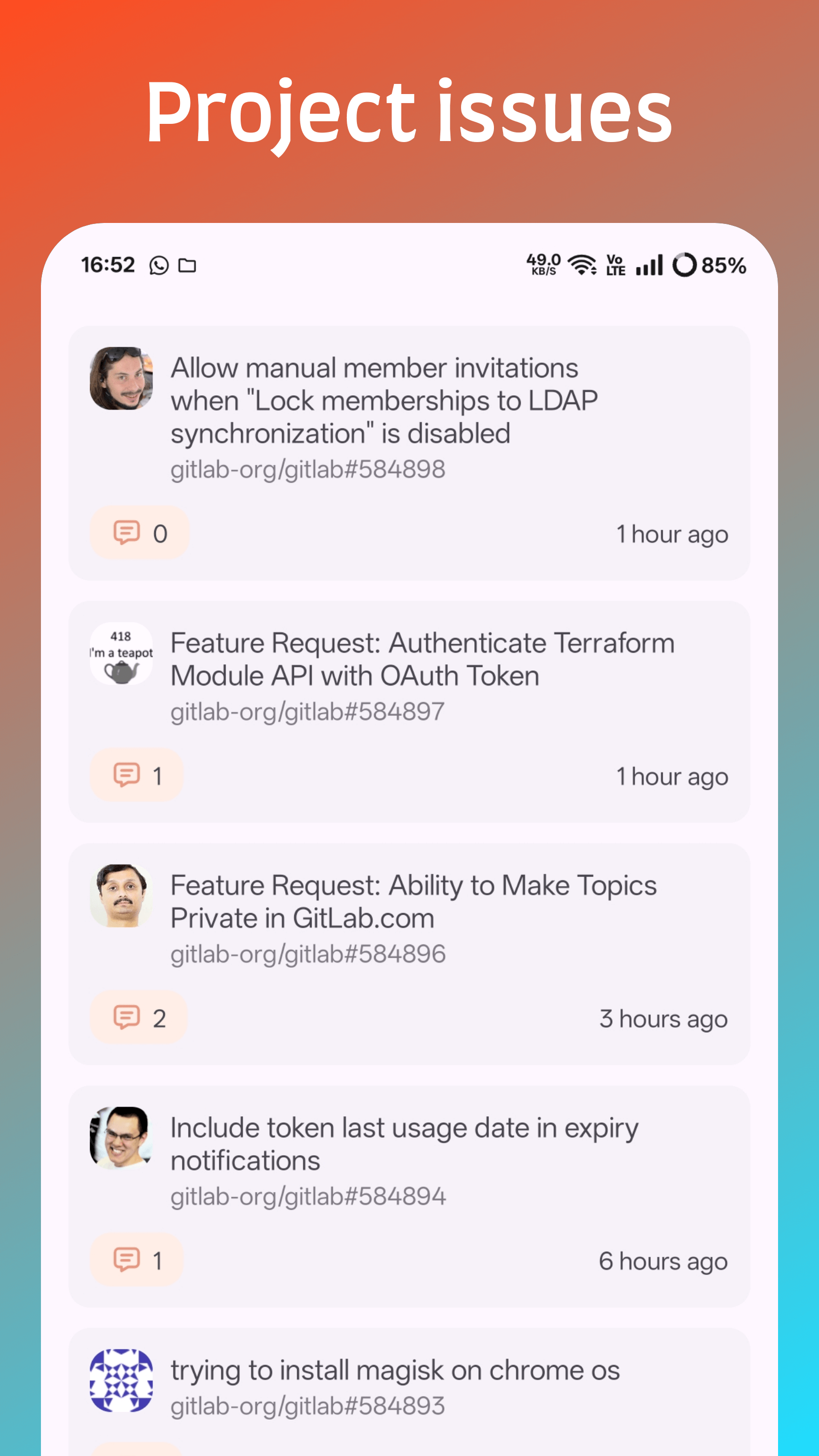 - Deep links with custom URLs for issues, merge requests, and projects