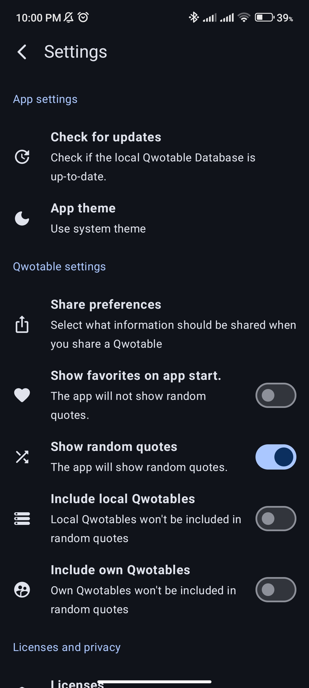 - Option to display local and/or user Qwotables in Random Quotes