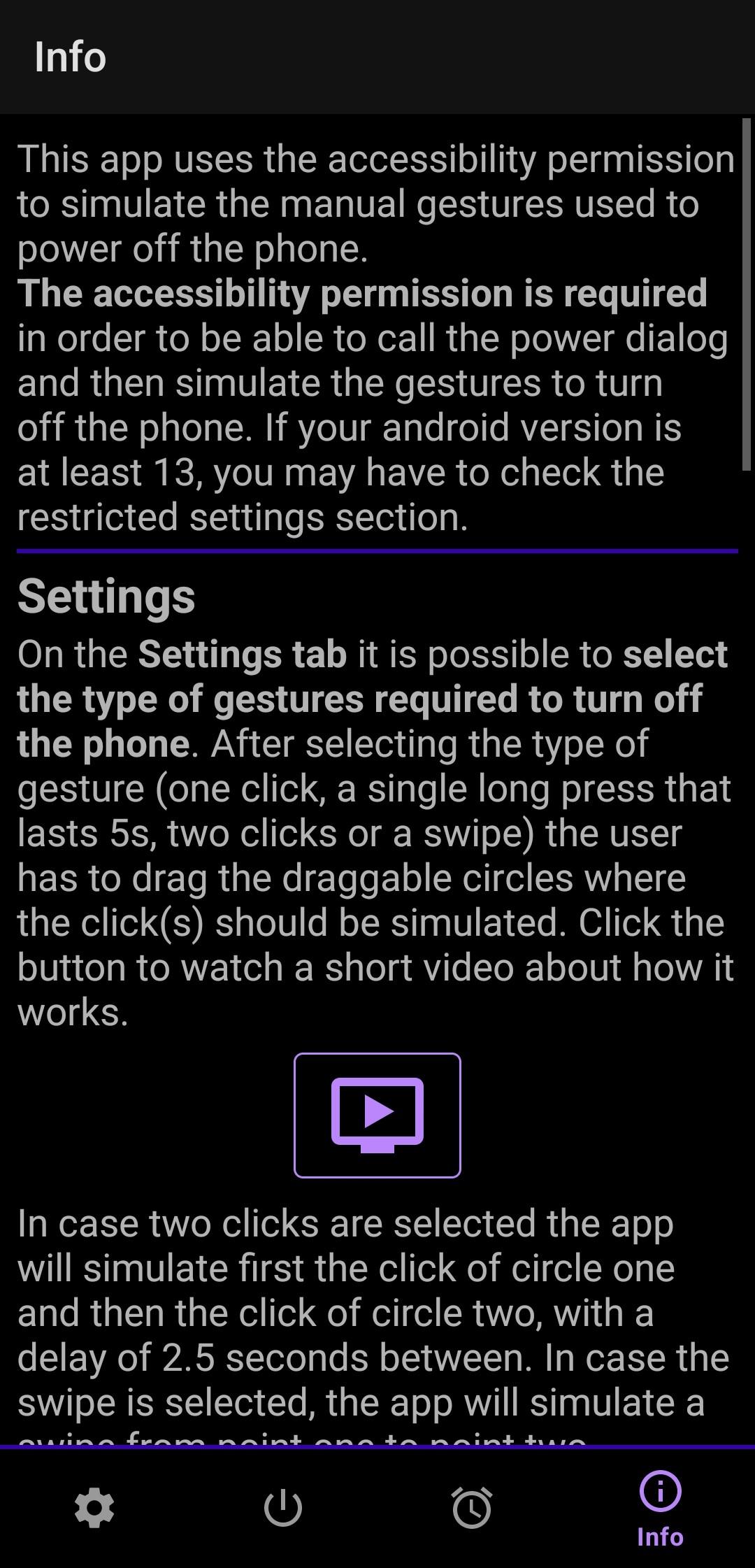 Android does not have any simple way to power off the phone without root, so the best we can do is emulate the manual gestures used to shut down the phone. To do this, the app will use the accessibility permission, but it will not register any user's data.