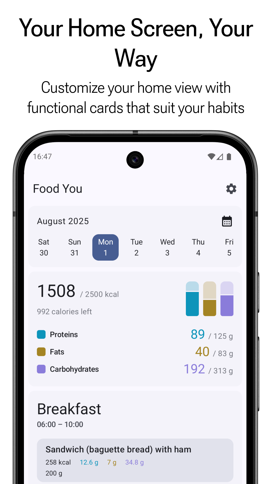 Food You is a powerful, open-source nutrition tracker built with a modern Material You aesthetic. It helps you track not just calories, but your entire nutrient intake — with reliable food data and a flexible, modular interface.
