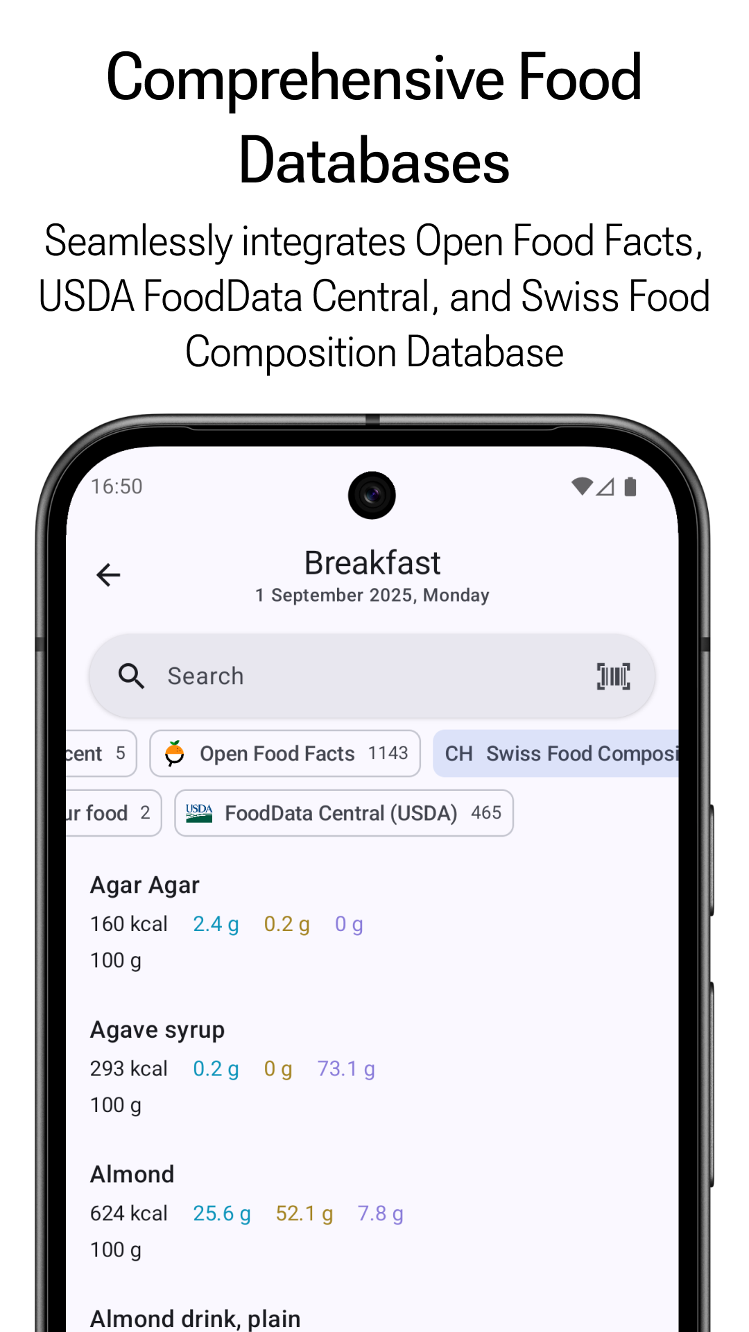 - Comprehensive Food Databases: Access nutrition data from Open Food Facts, USDA FoodCentral, and the Swiss Food Composition Database.