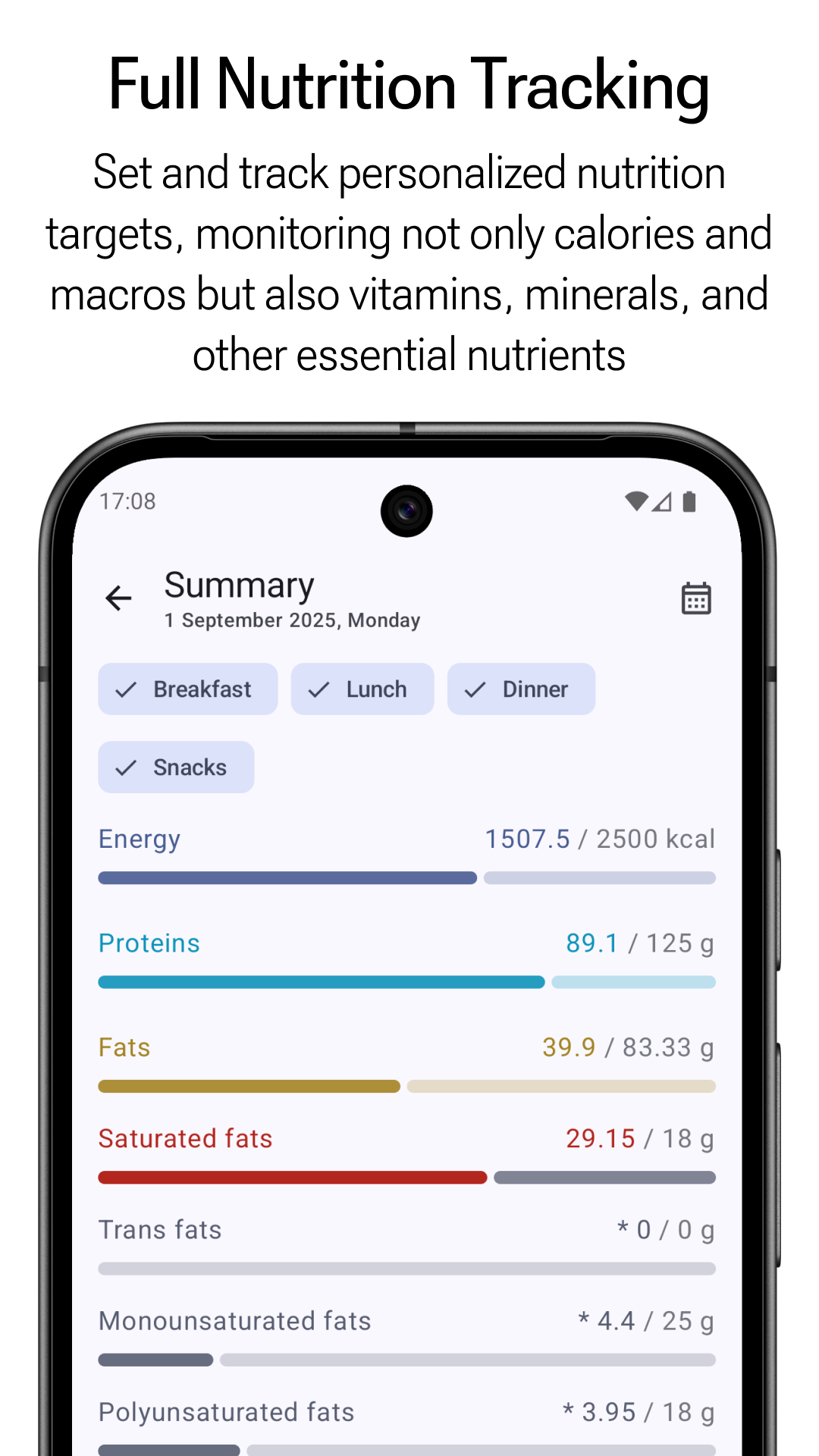 - Full Nutrition Tracking: Monitor calories, macros, vitamins, minerals, and more.