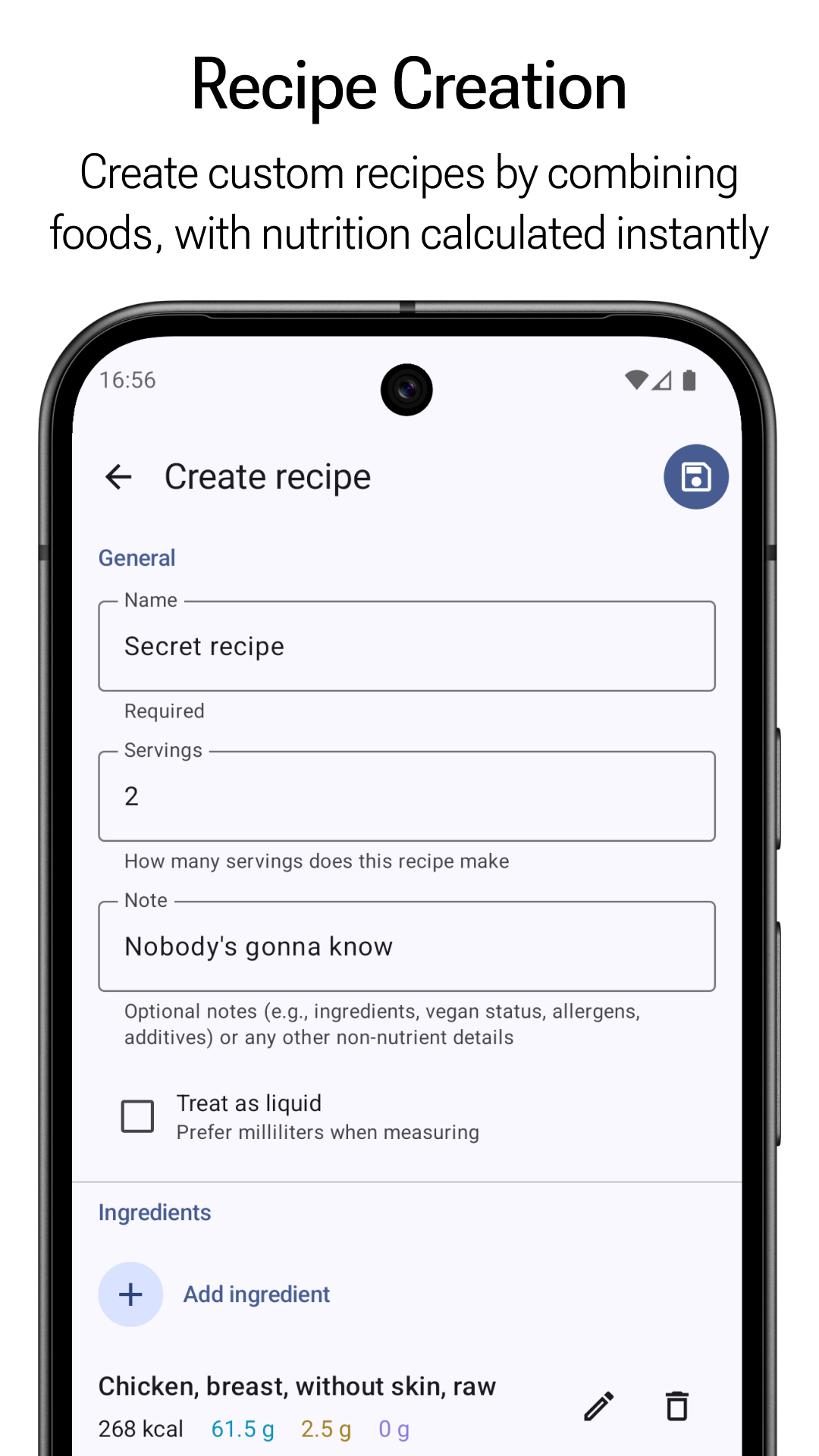 - Recipe Creation: Combine foods into custom recipes with automatic nutrition calculation.