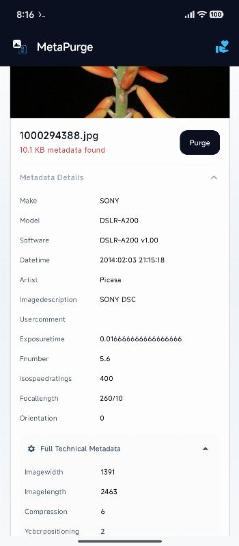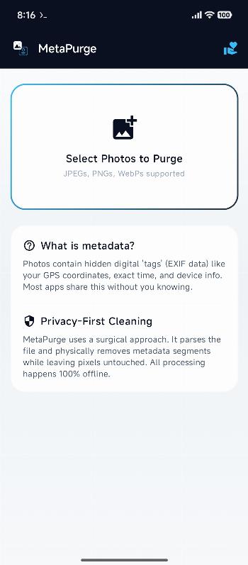MetaPurge is a privacy-first utility for locally stripping sensitive EXIF and metadata from your photos.