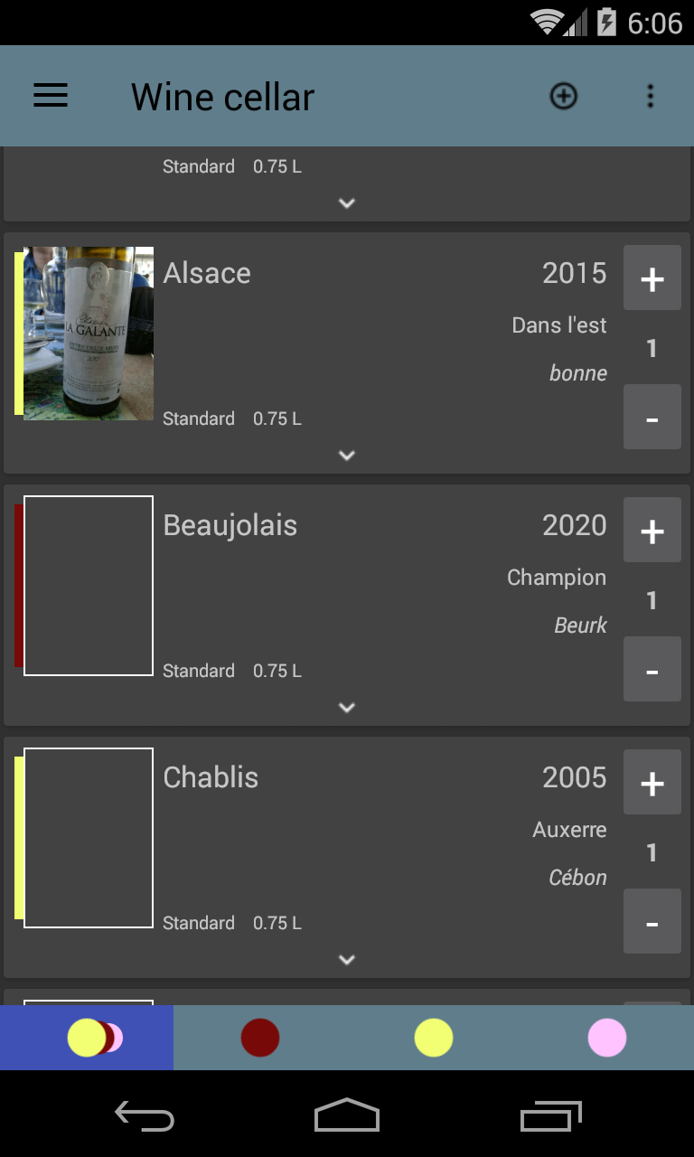Listing of your bottles, with characteristics (appellation, domain, cuvee, vintage and a few others)