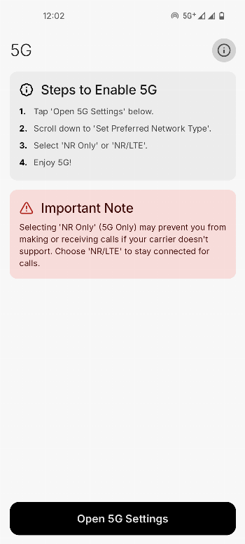 Unlock the full potential of your 5G device with this simple utility. This app allows you to open the hidden system network settings menu, where you can force your device to use "NR Only" (5G Only) mode.