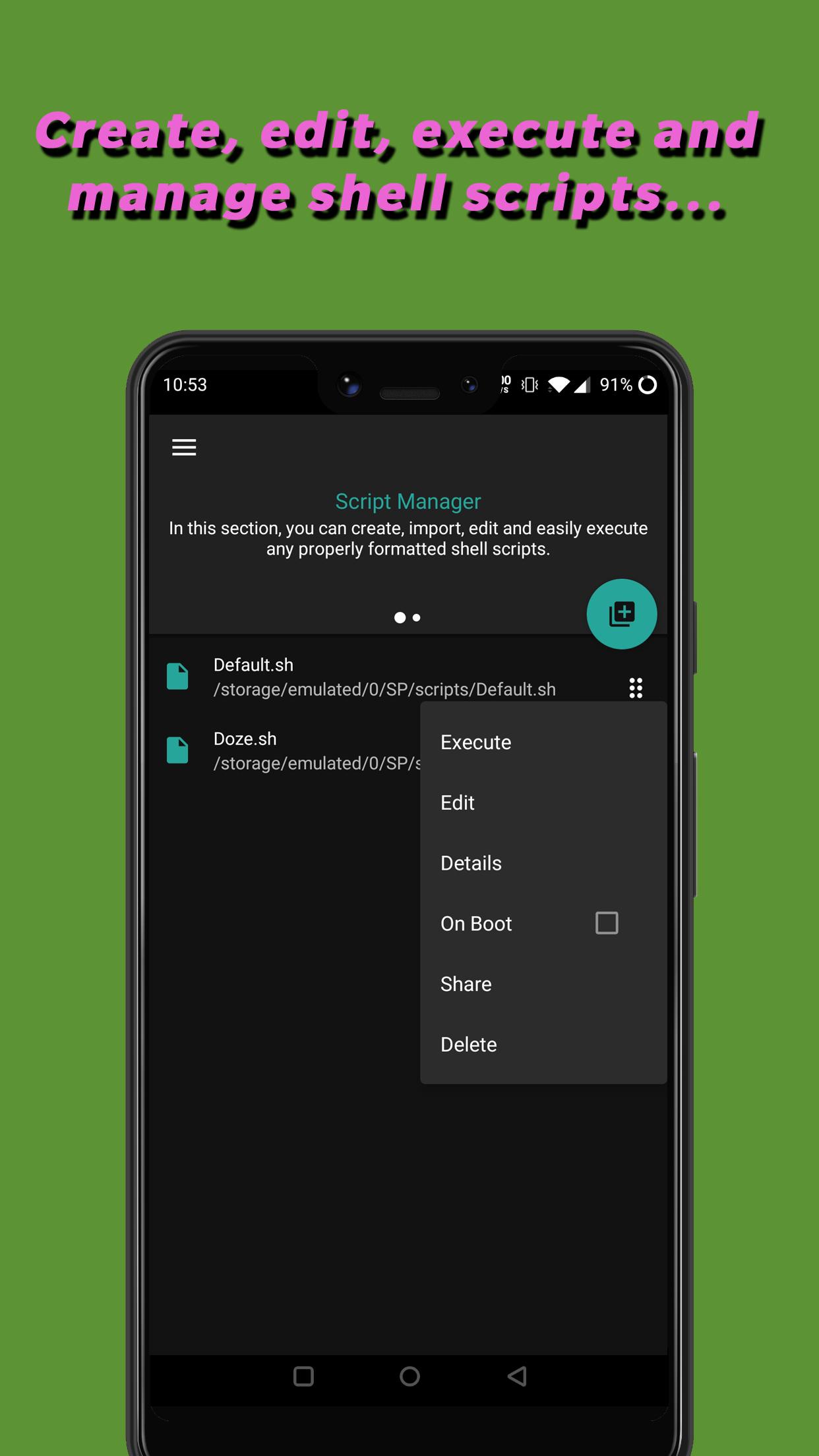 - A Script Manager to easily create, import, edit, share and execute any properly formatted shell scripts.