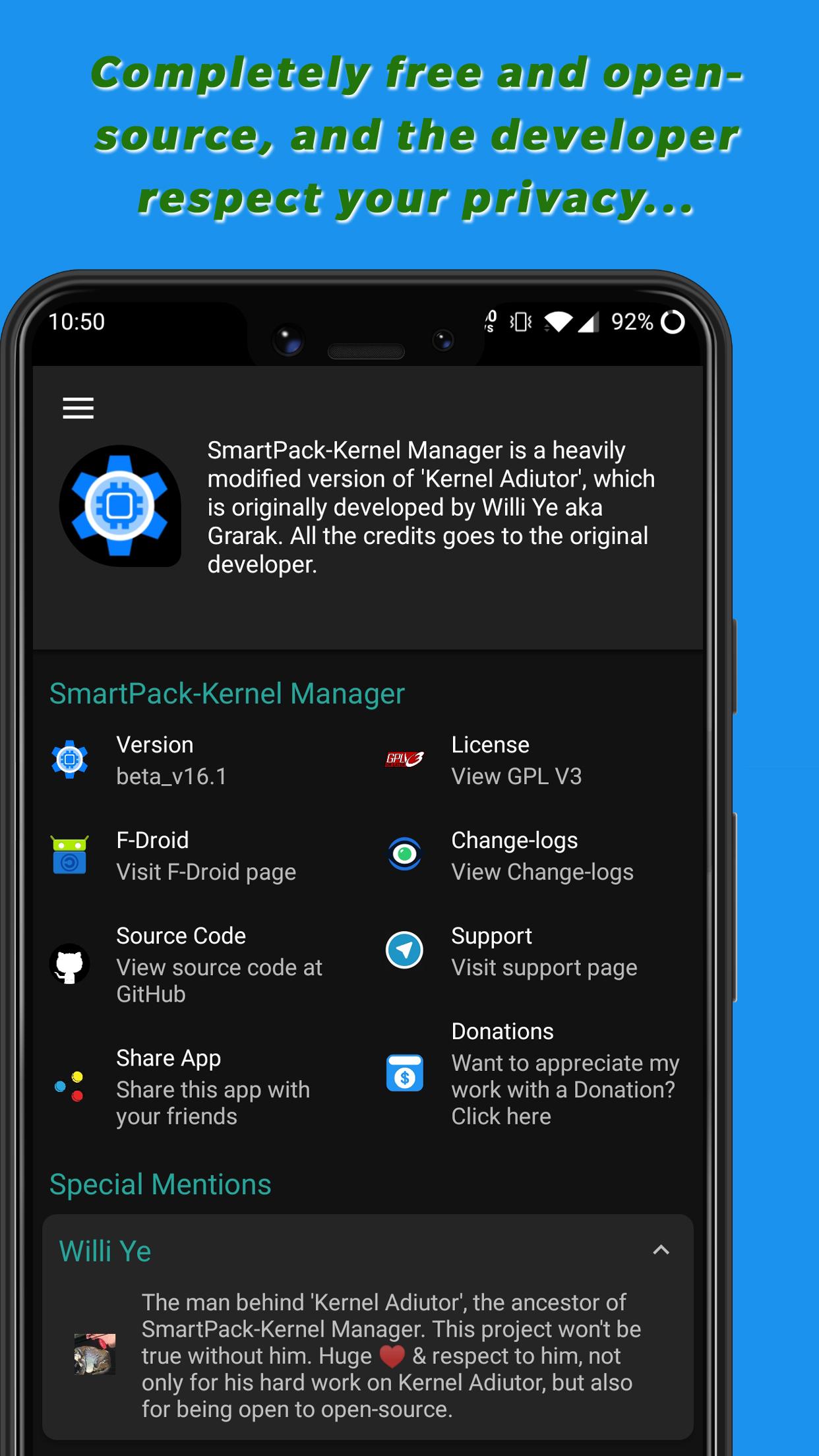 SmartPack-Kernel Manager is a heavily modified version of Kernel Adiutor developed by Willi Ye. All the credits go to the original developer, not only for his hard work on Kernel Adiutor, but also for being open to open-source community.