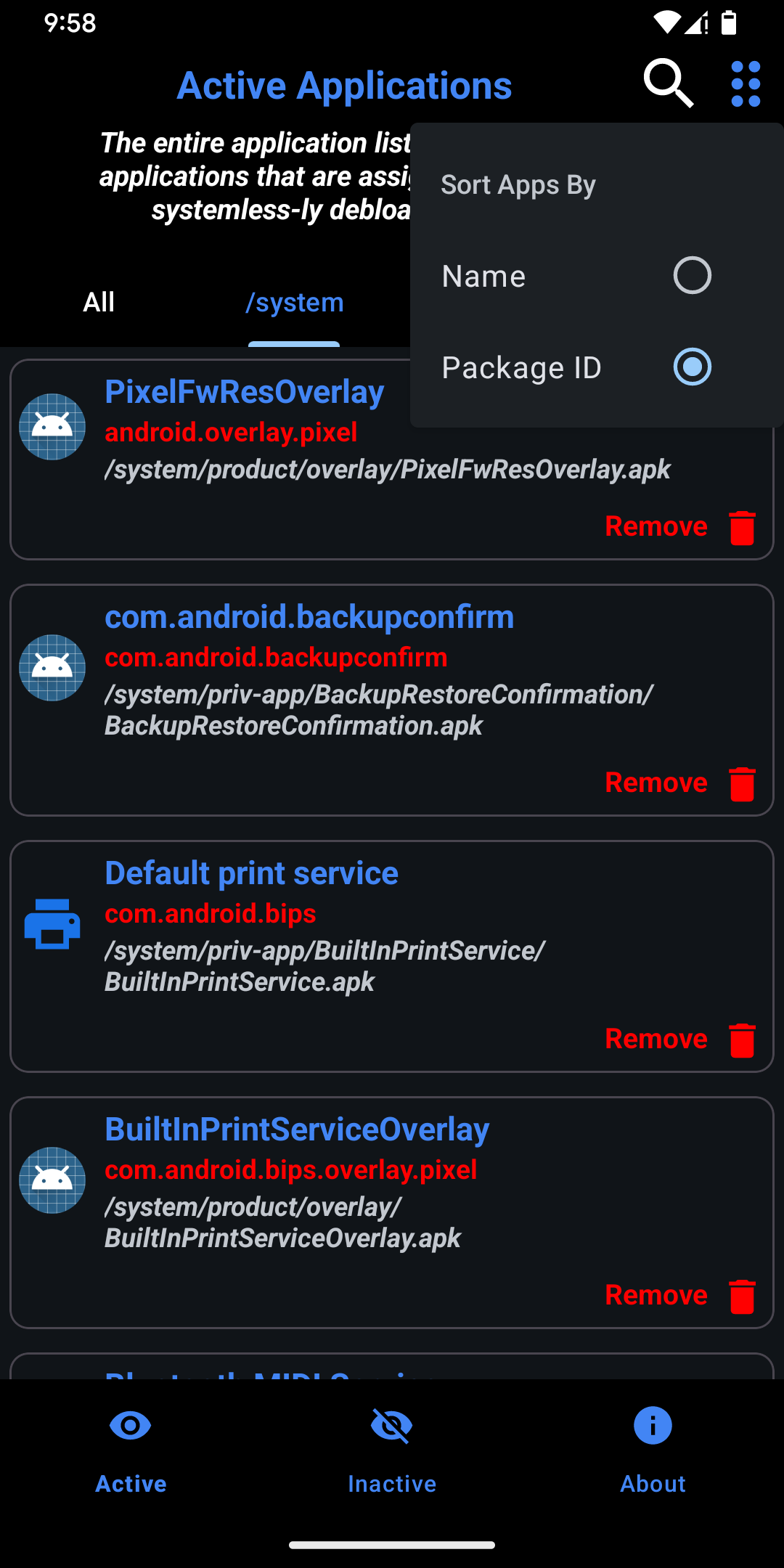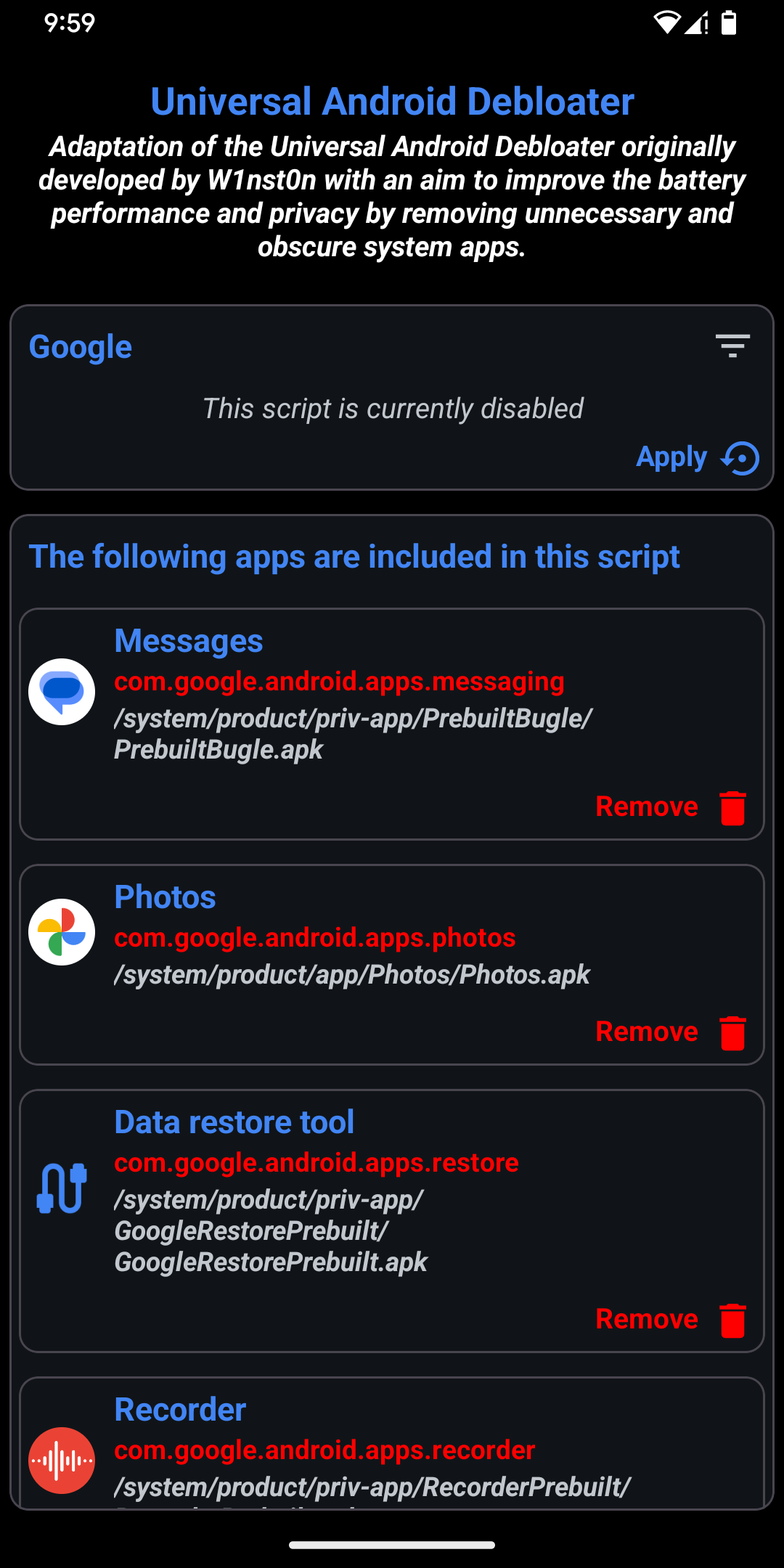 How to UseOpen the app, click the remove button on each app you want to remove. The selected apps will be removed systemless-ly after a reboot. To restore an app, either Reset Module (on the top menu) or selectively restore from the second page. Please note that a restart is necessary to get any of the changes in effect.
