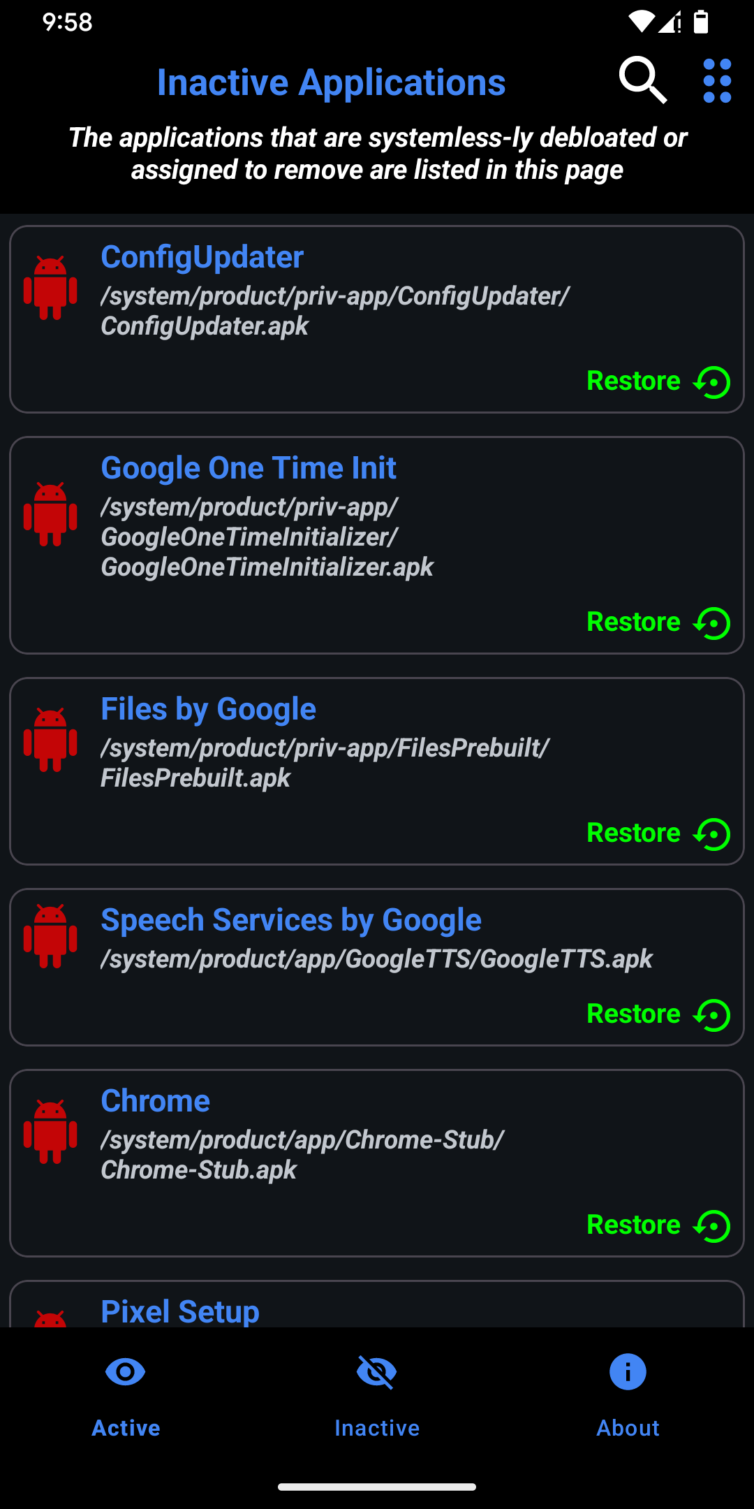 - Restore de-bloated apps, either individually or as a whole (Reboot required).