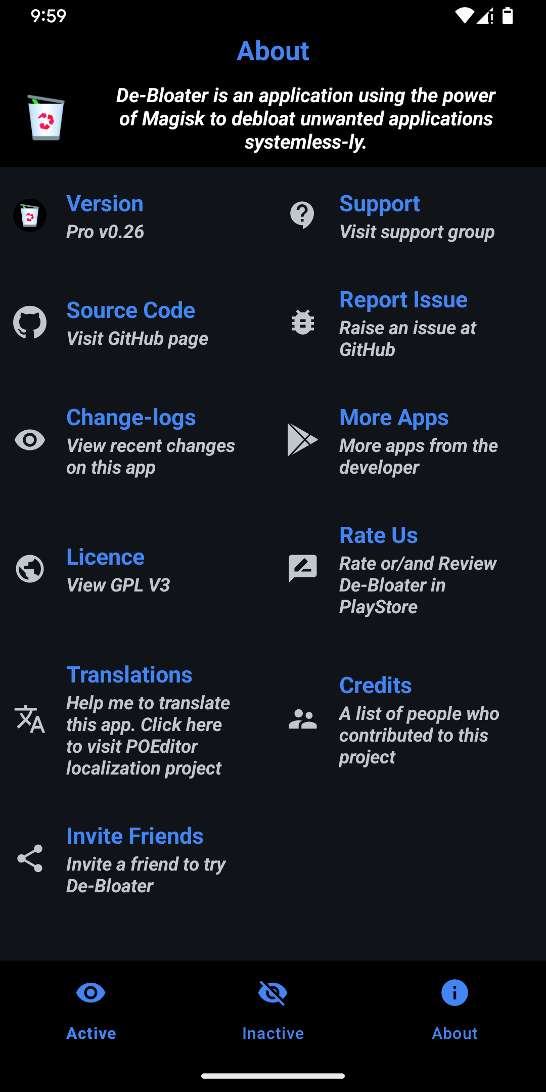 De-Bloater requires Root Access and a fully functional Magisk or Kernel SU/APatch environment, including modules, for proper working. As a result, De-Bloater won't work with other rooting solutions as well as in Magisk core-only mode.