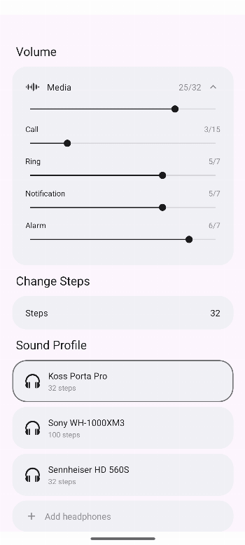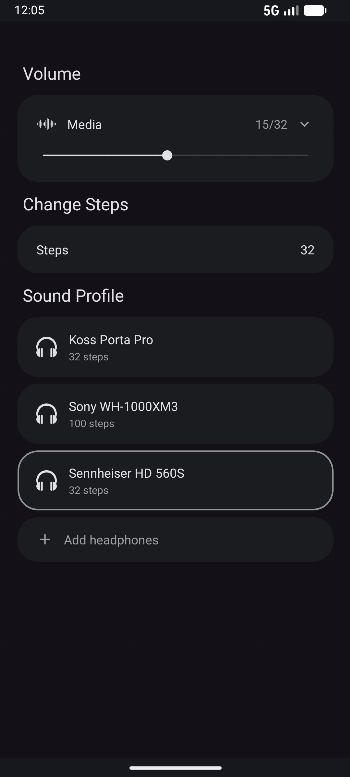 Sound profiles: select your headphones from 6000+ models and the app applies an EQ correction based on measured frequency response data from AutoEQ. Save multiple presets with different headphones and step counts. The database is updated daily.