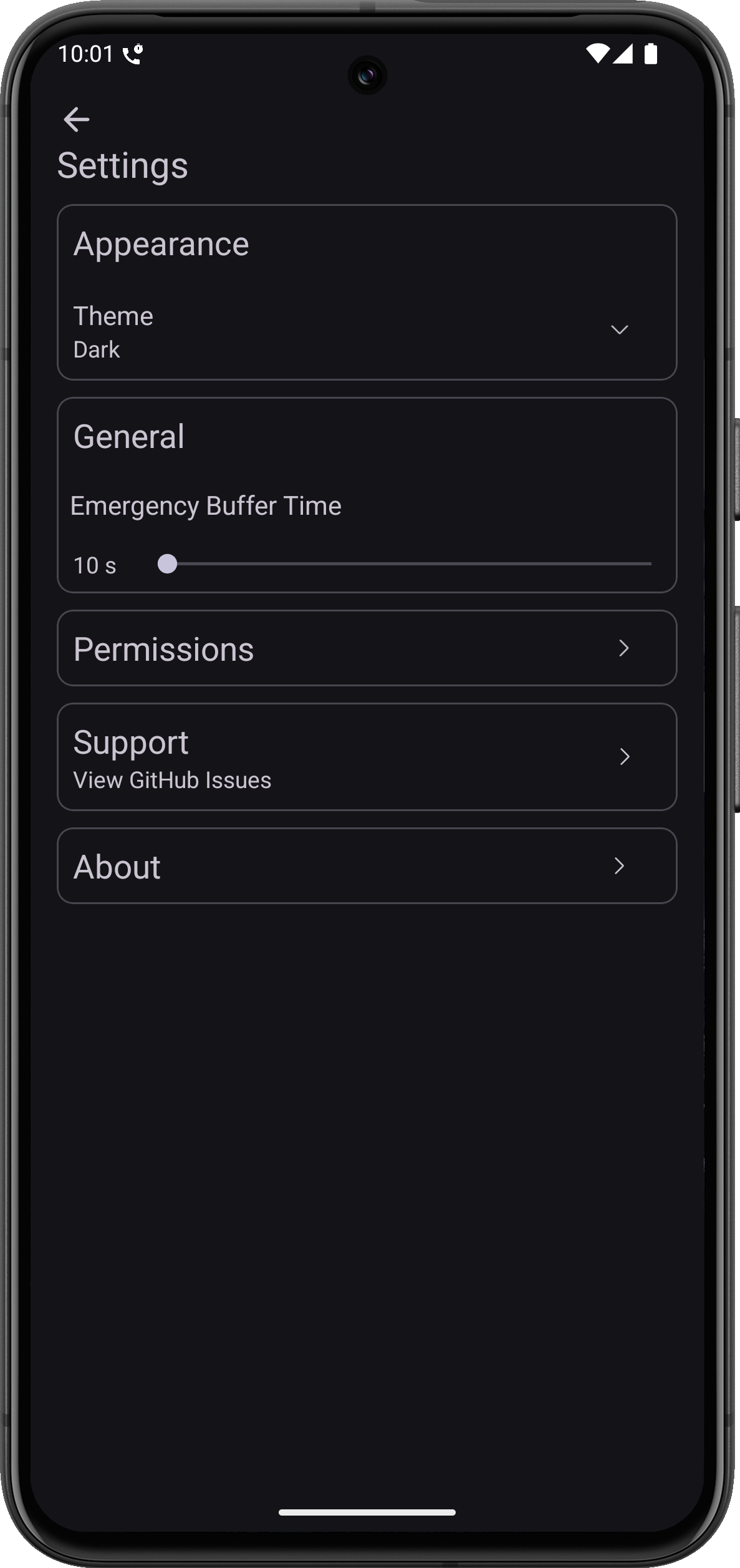 - Settings page with Theme, Buffer Time, Permissions, Support & About