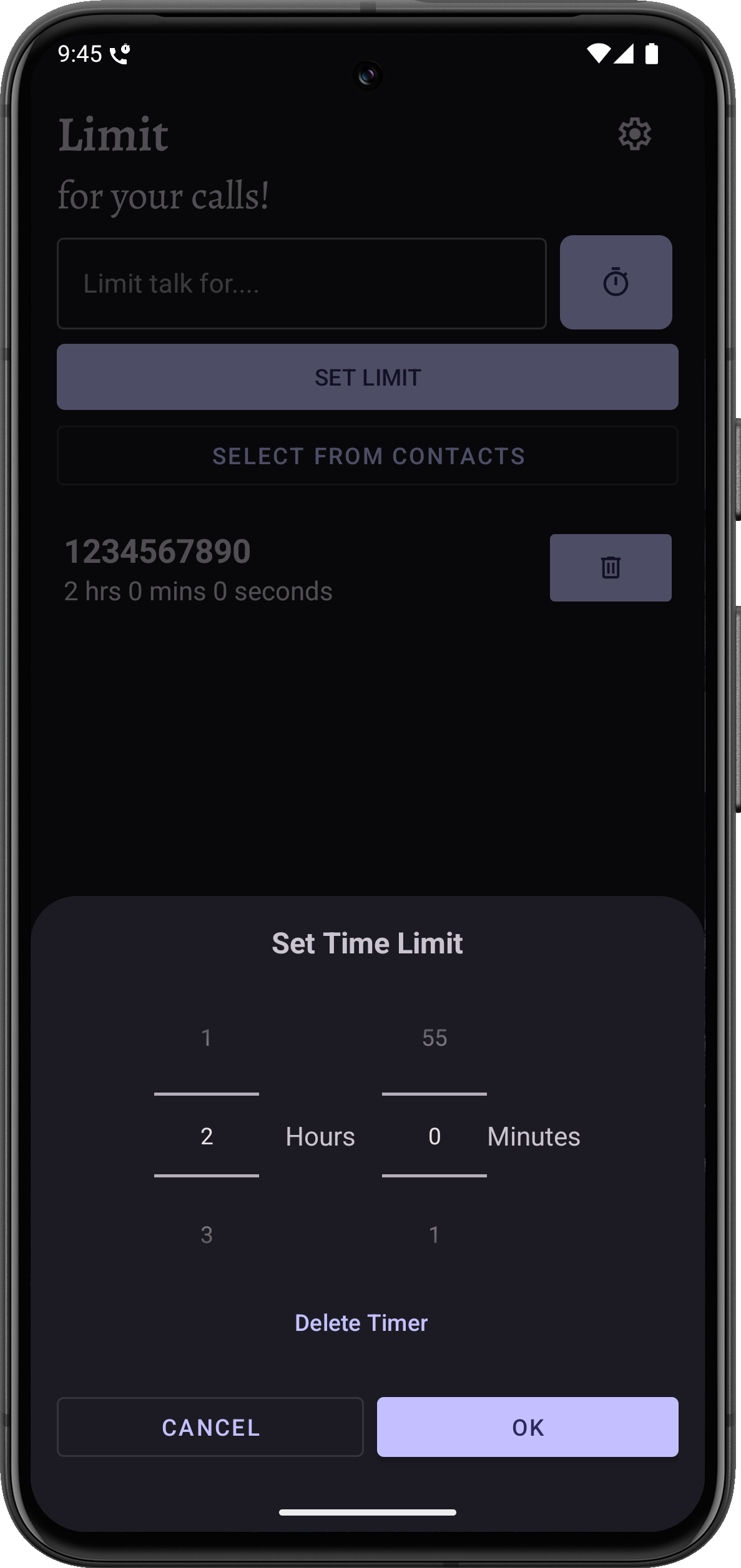 Call Limiter is a simple, open-source Android app that helps you take control of your phone calls. Set time limits for specific contacts and let the app automatically hang up when the limit is reached — making it easy to save time, avoid distractions, and manage conversations better.