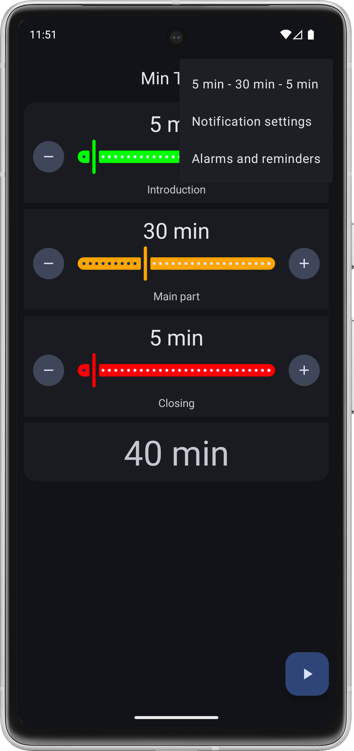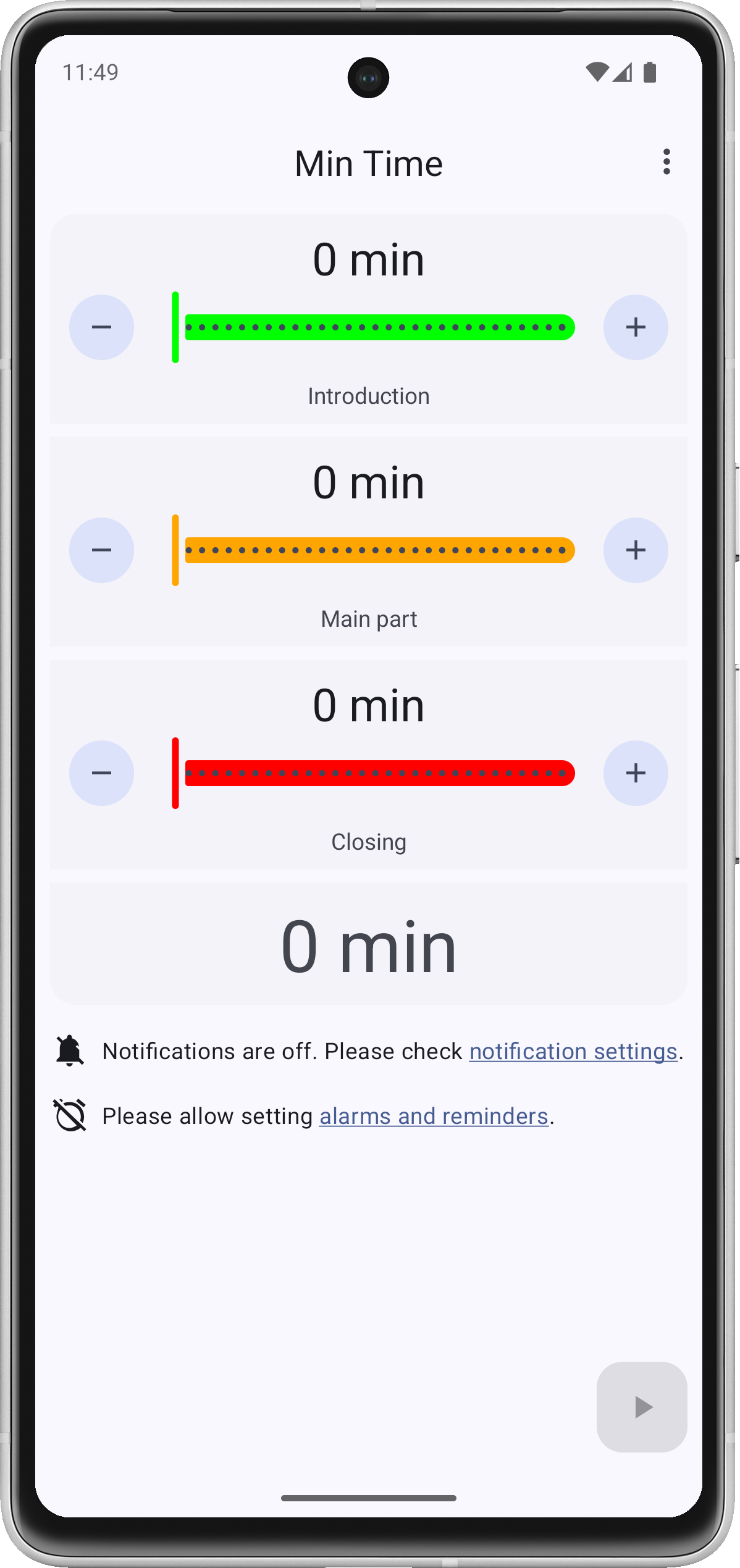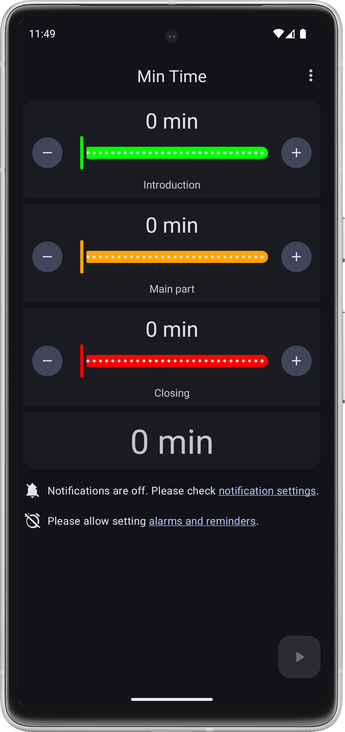 Min Time is a countdown app. It's main goal is to help you structure your talks and presentations. It divides the talk time into three phases: green, yellow and red. With a glimpse you get an idea how much time is left.