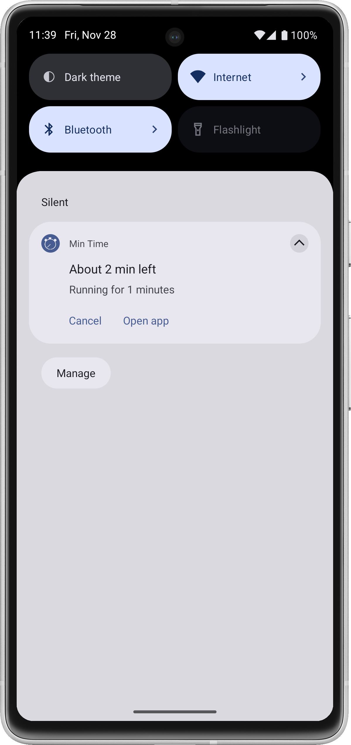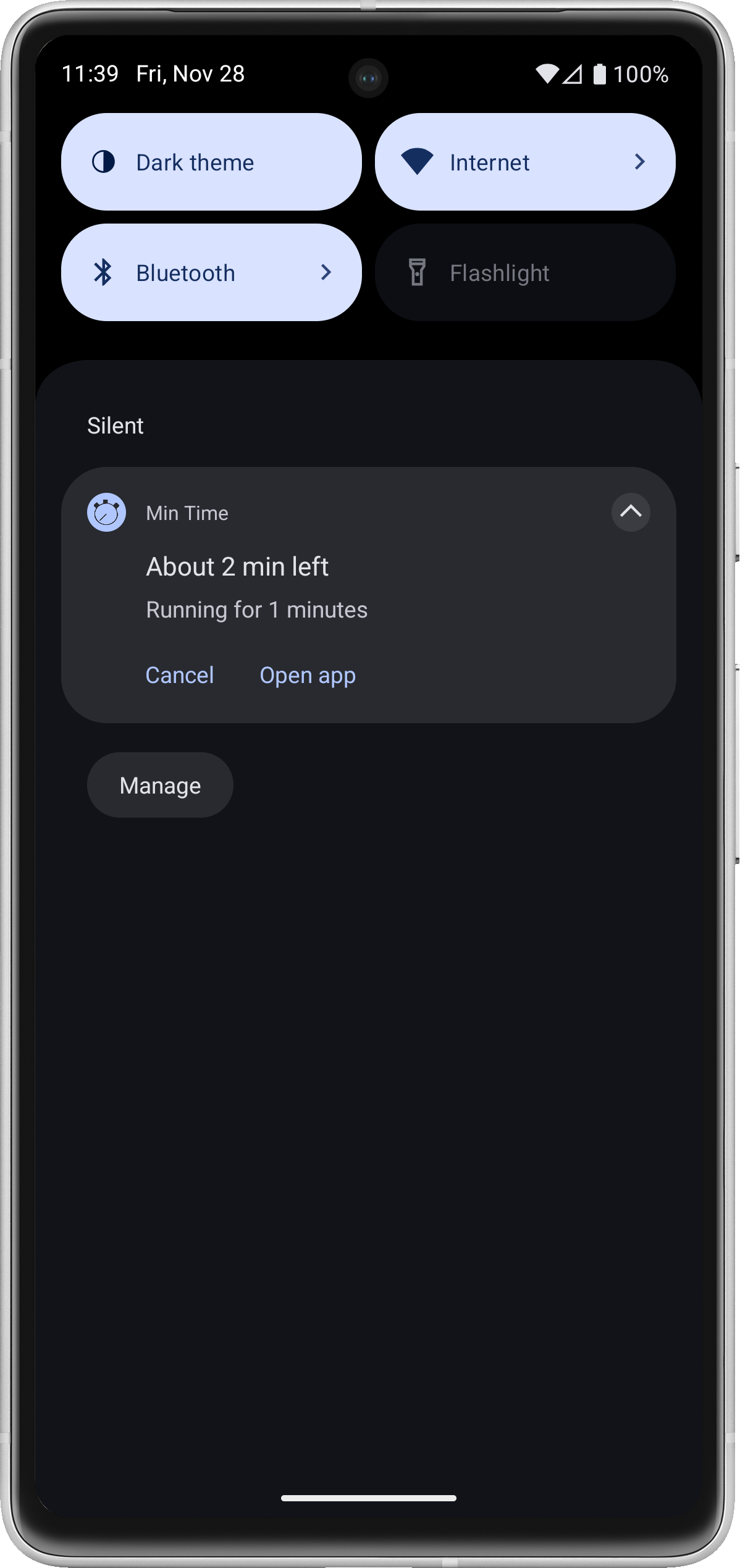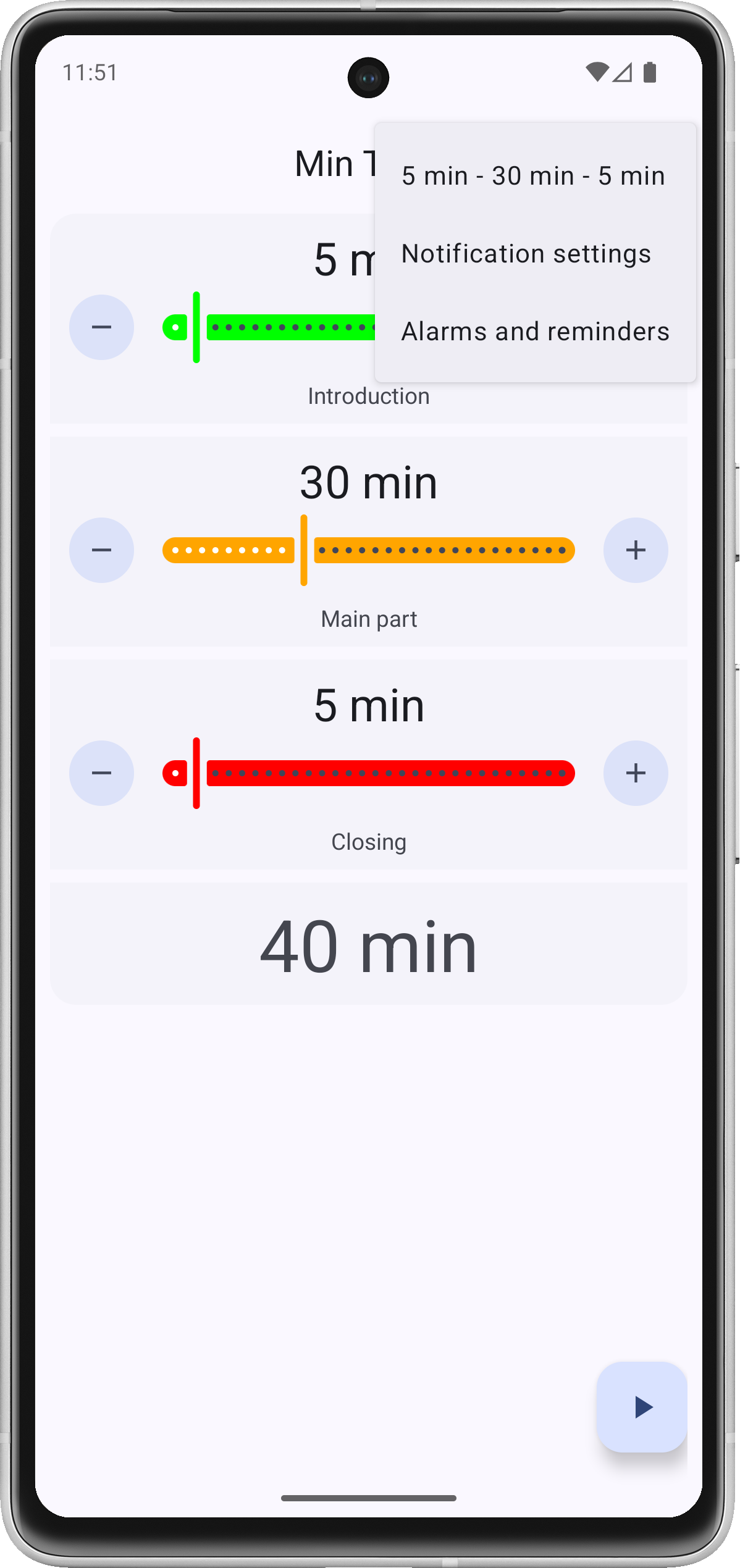Min Time is a countdown app. It's main goal is to help you structure your talks and presentations. It divides the talk time into three phases: green, yellow and red. With a glimpse you get an idea how much time is left.