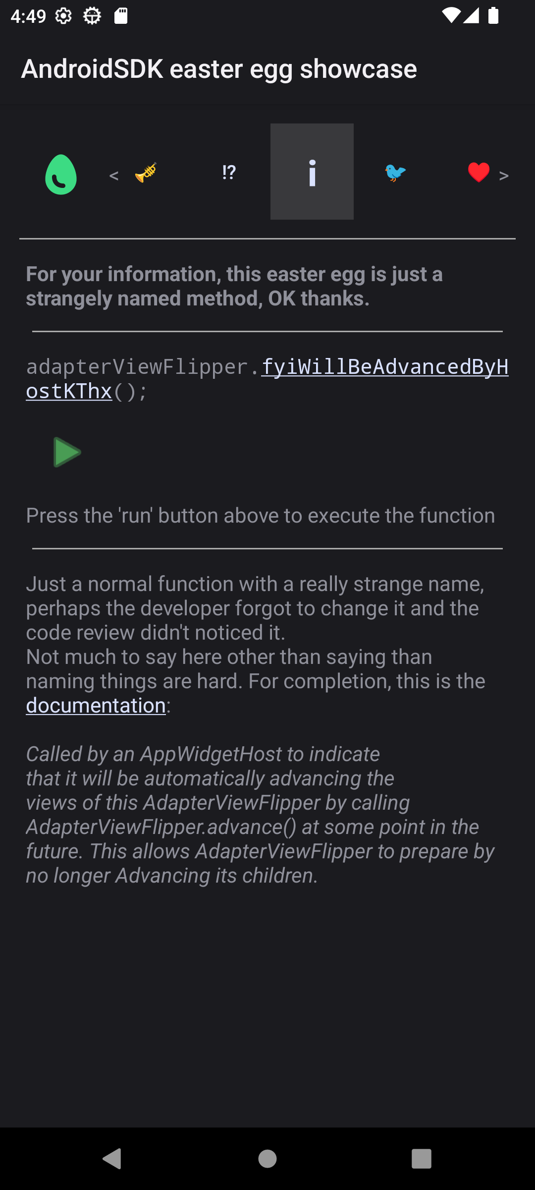 As usual, this app is extremely small (less than a standard picture), totally free, contains no ads, has no permissions, and their sole purpose it to act as an interactive explanation of strange easter eggs in the Android SDK.
