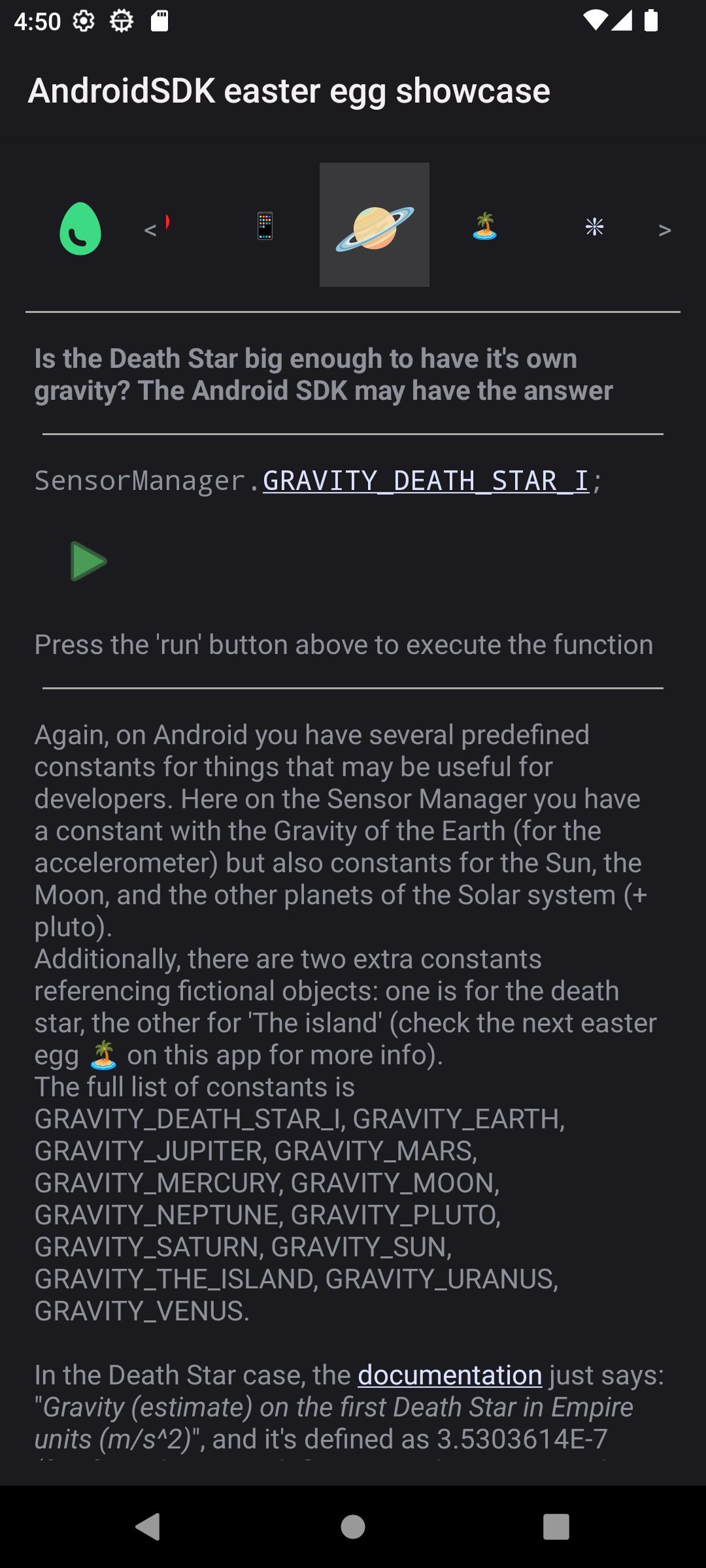 Did you know that in the Android SDK there is a function called 'isUserAMonkey'? And a constant called 'GRAVITY_DEATH_STAR_I'?