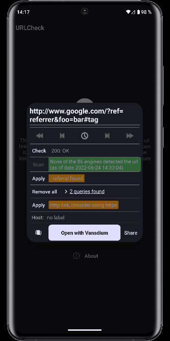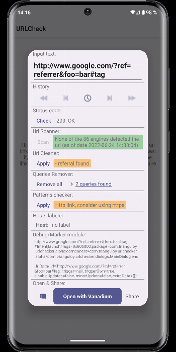 URLCheck is developed by TrianguloY, originally for personal use. It is open source (under CC BY 4.0 license), free, without any ads or trackers, light sized and using as few permissions as necessary (only the internet permission, for module checks that will only be performed when the user request them). The source code is available on GitHub too, if you want to suggest changes, perform modifications or propose a new translation: https://github.com/TrianguloY/URLCheck