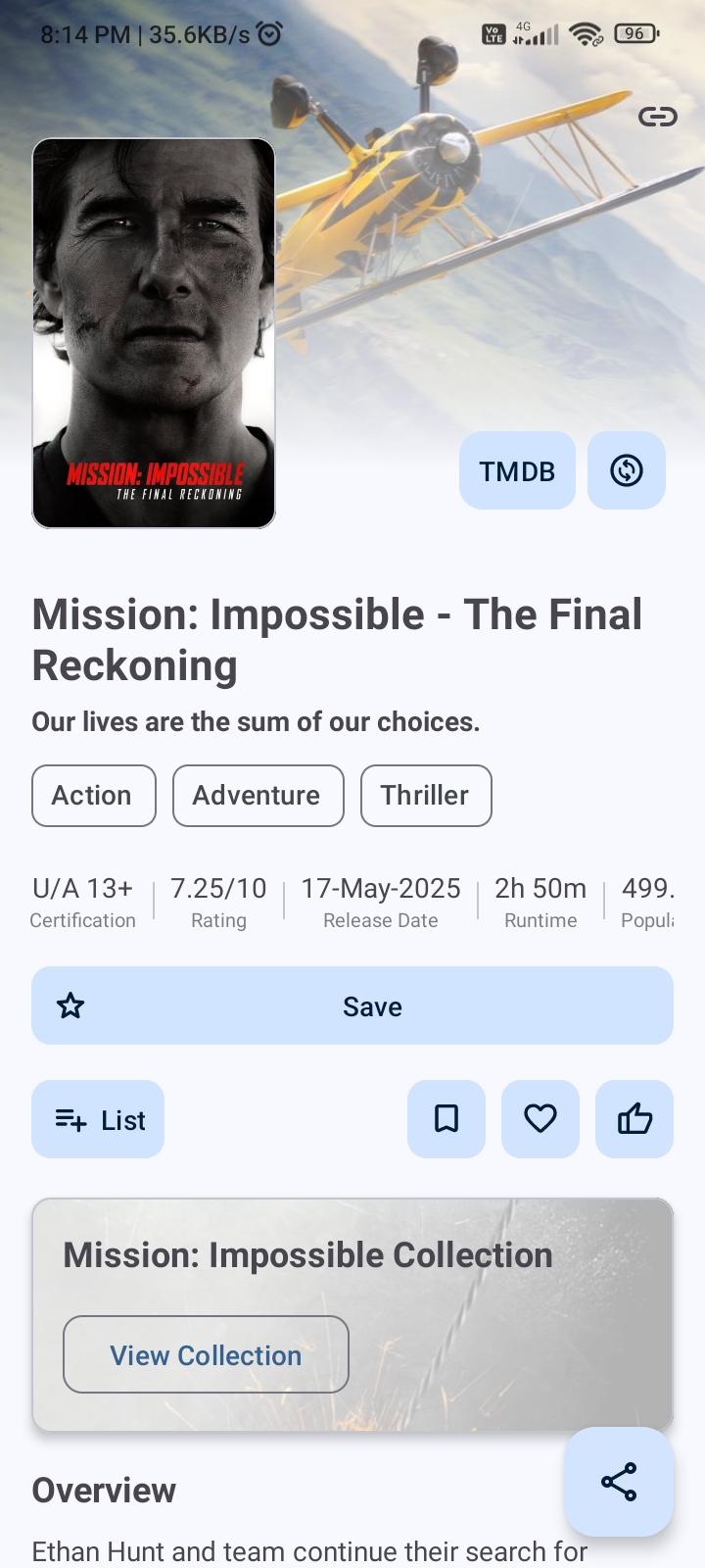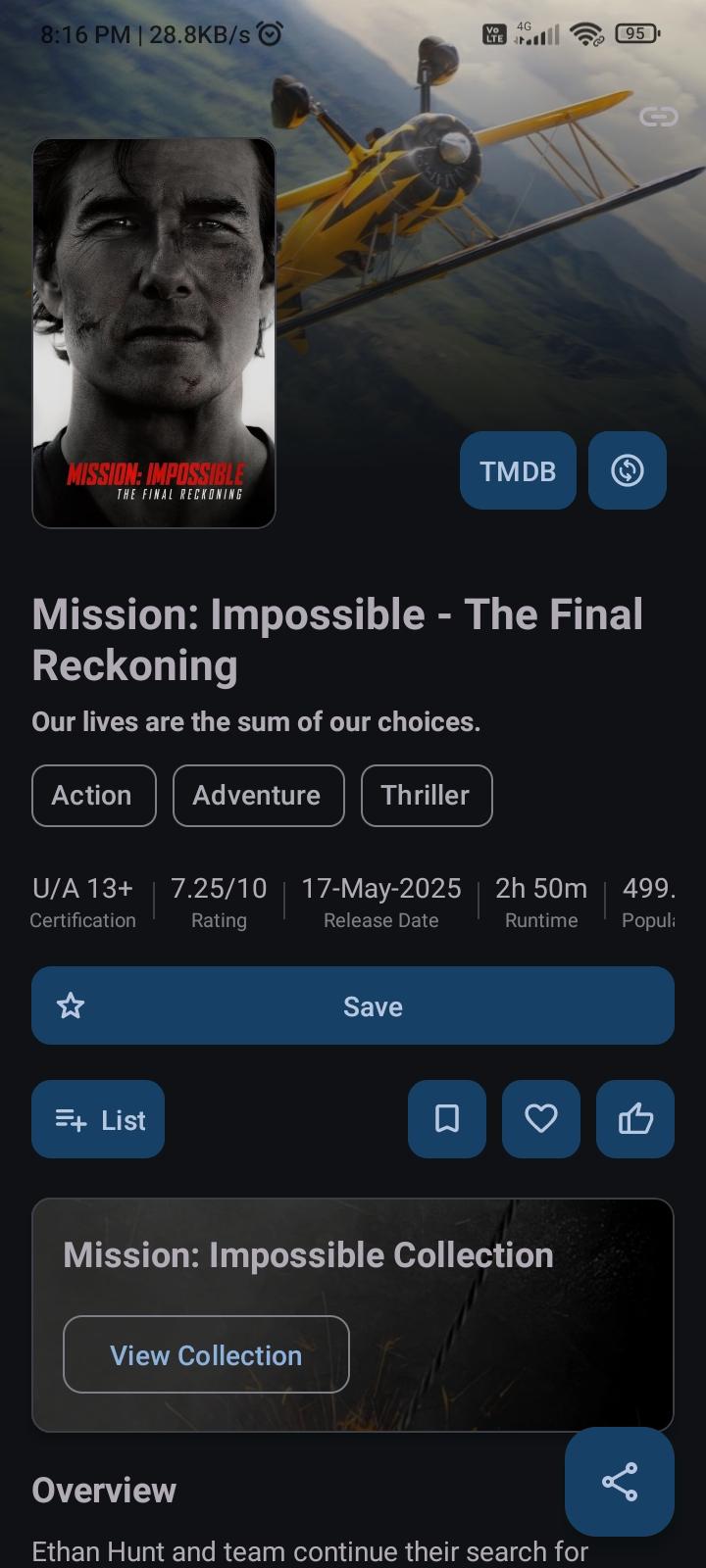 It offers synchronization with your TMDB and Trakt account. Once logged in, you can sync your favorites, watchlist, rated movies, and more. It also integrates with a local database to keep track of your shows. You can assign various statuses to each title—such as ‘planned’, ‘watched’, or ‘dropped’—rate them, and note the dates you commenced and concluded each show.